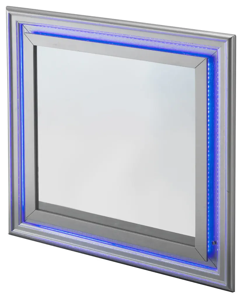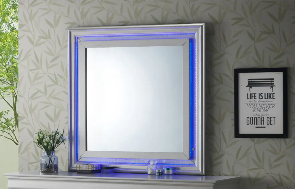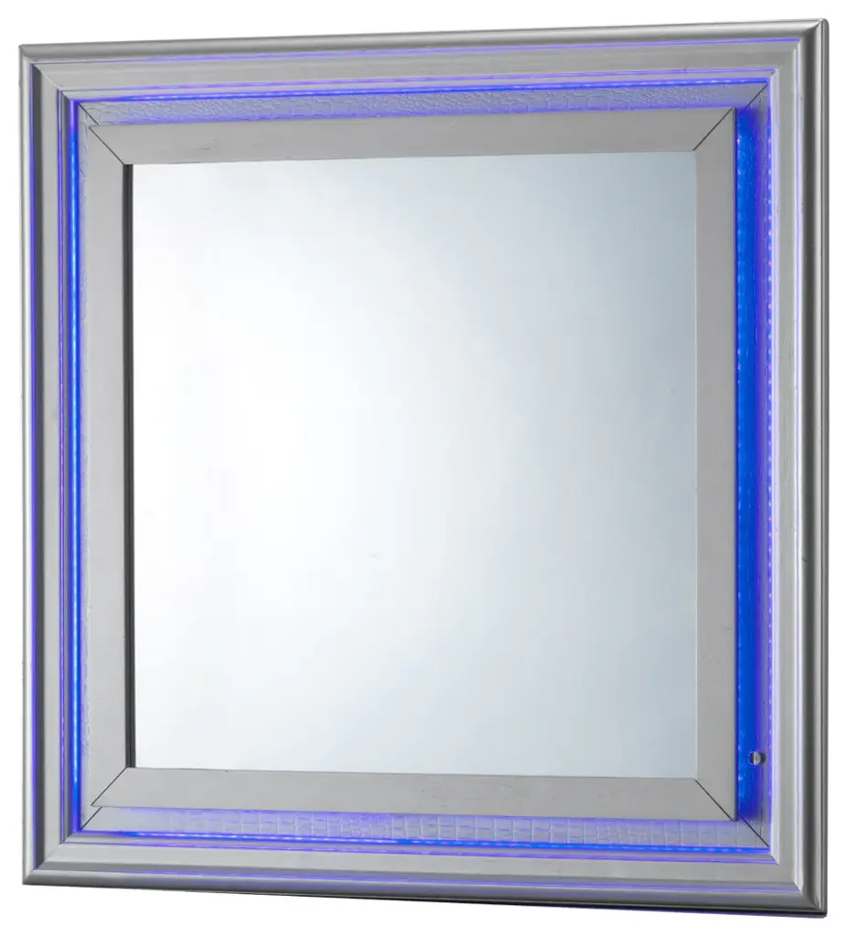 Led accented mirror with textured "Croc" Finish adds a stunning look to your bedroom. Nice looking mirror with wood veneer. A perfect choice for your home.Features:Textured "croc" finishLed accent on headboardWood veneerChoice of different colorMirror supports not included-supplied with matching dresserMade in Malaysia