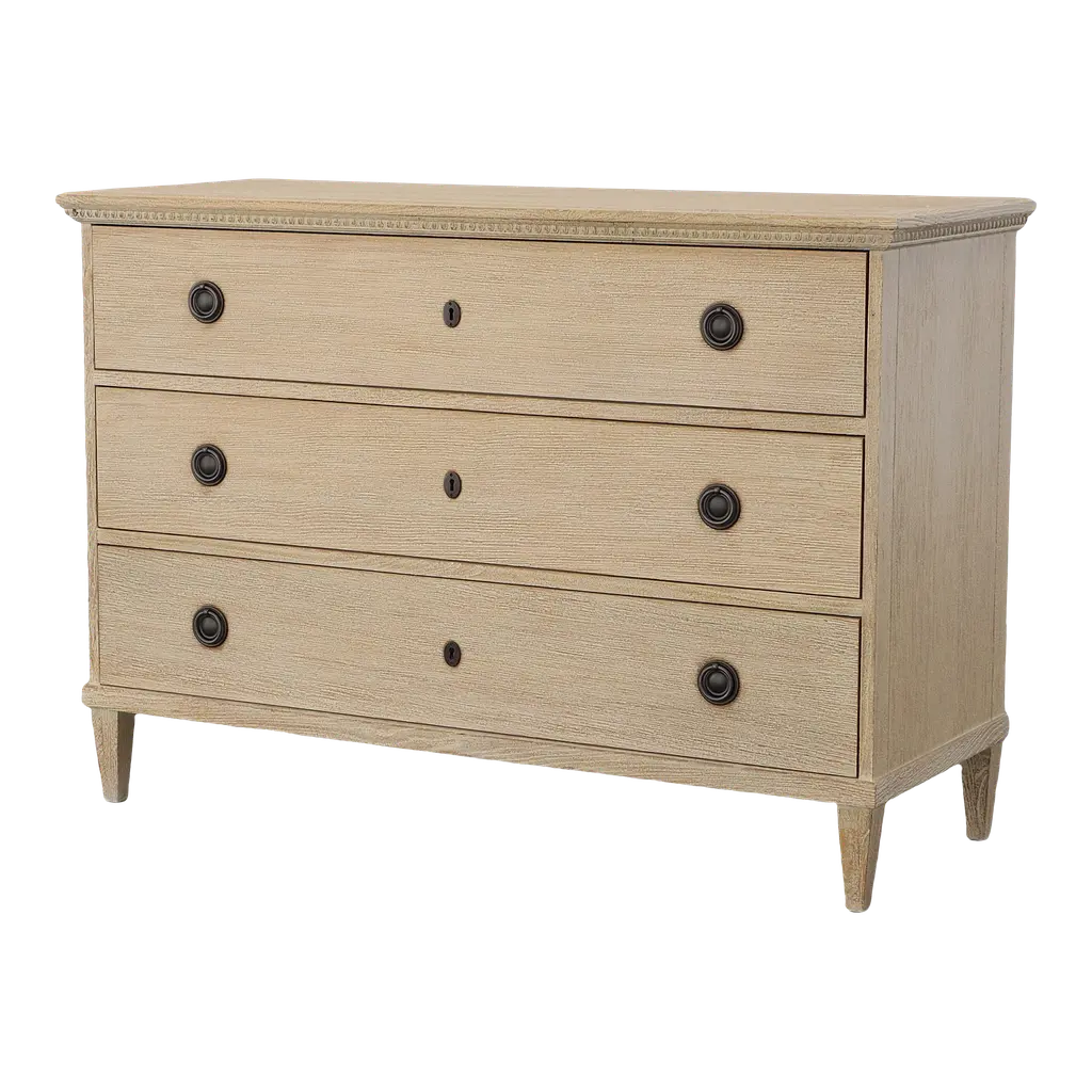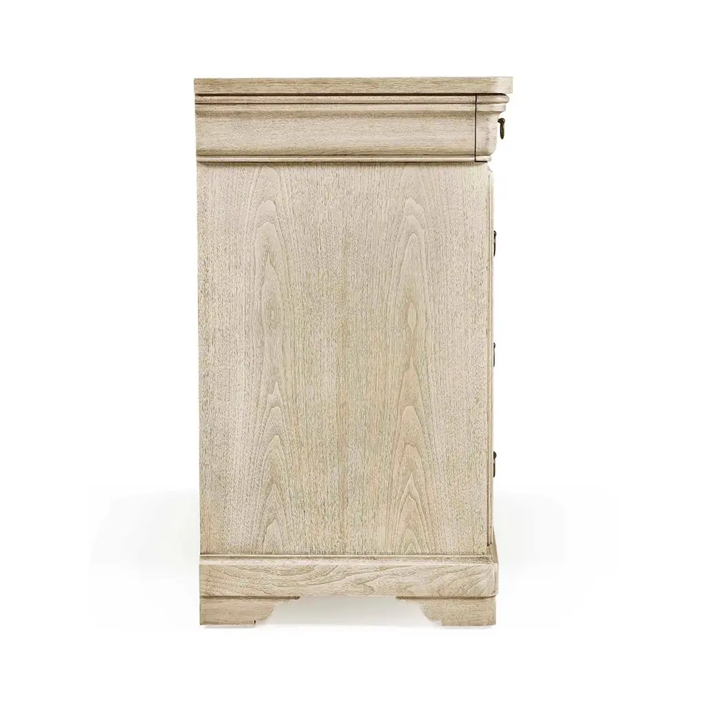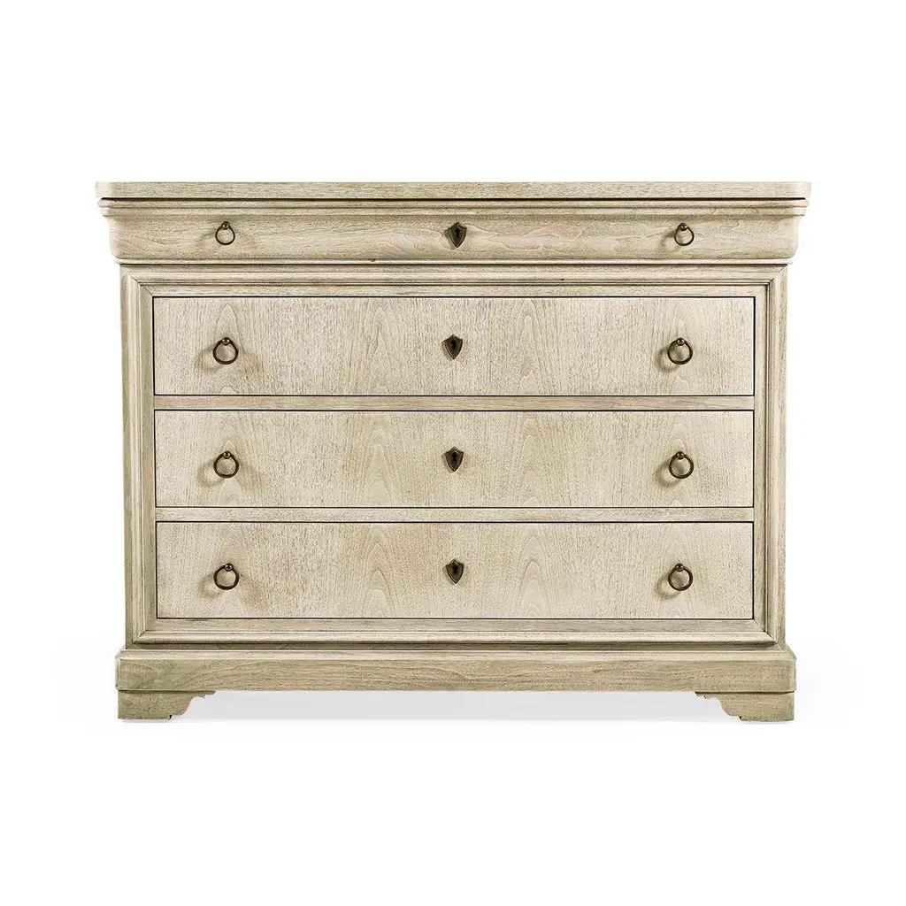 Louis Phillipe Dresser, with clean lines, this four-drawer dresser is a sophisticated balance and has a functional aesthetic, a quintessential expression of timeless charm and old-world refinement. With a bleached walnut finish that elevates this piece for a variety of interior stylings.Dimensions: 46" W x 20" D x 35 1/8" H.