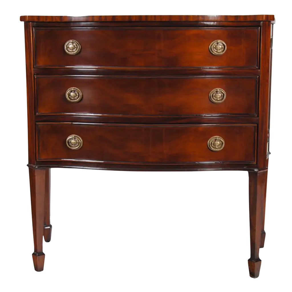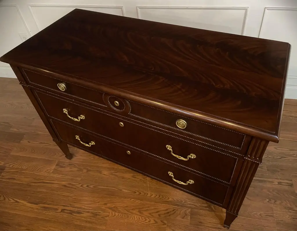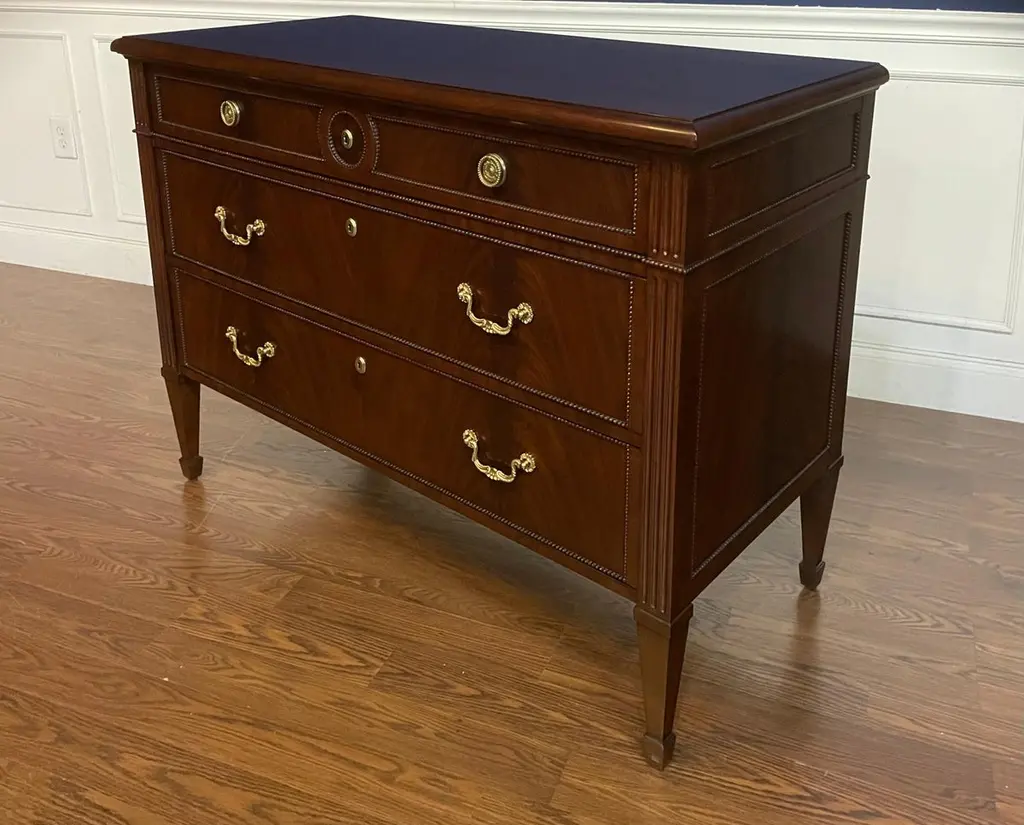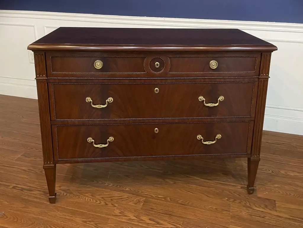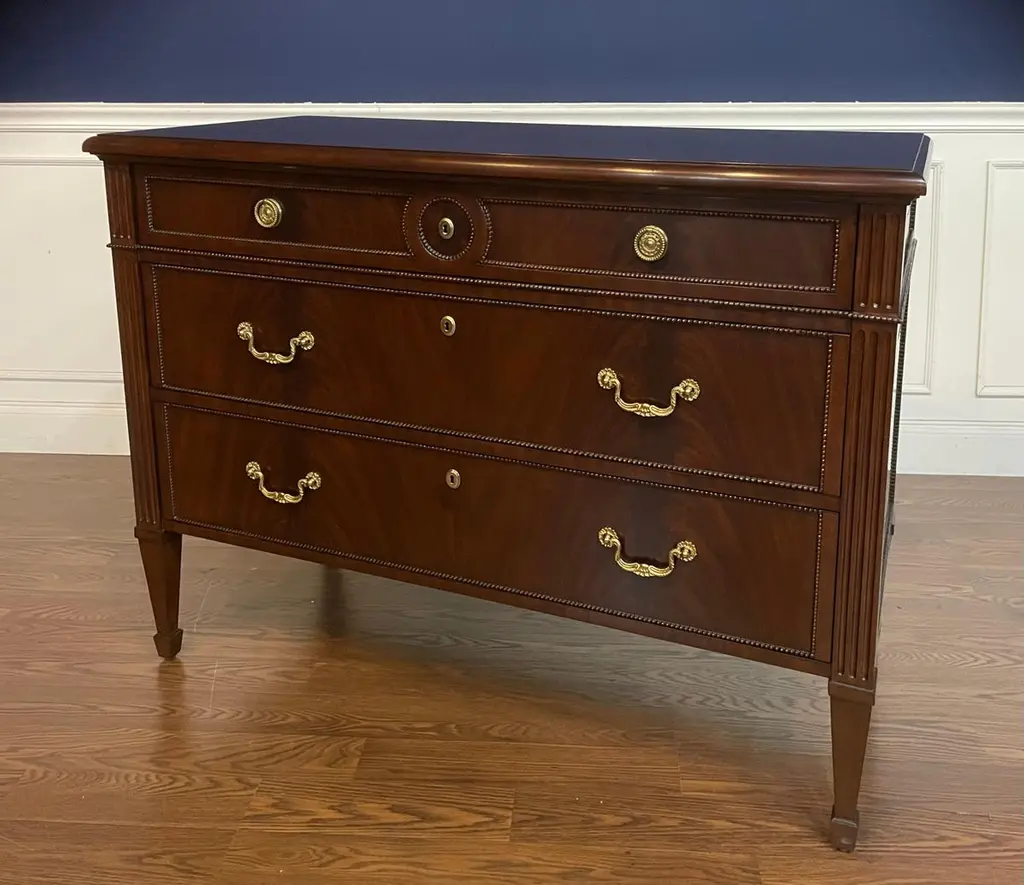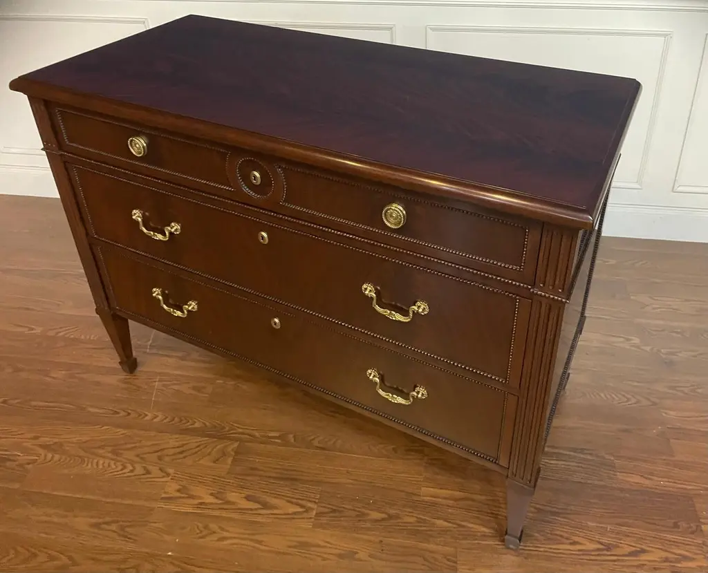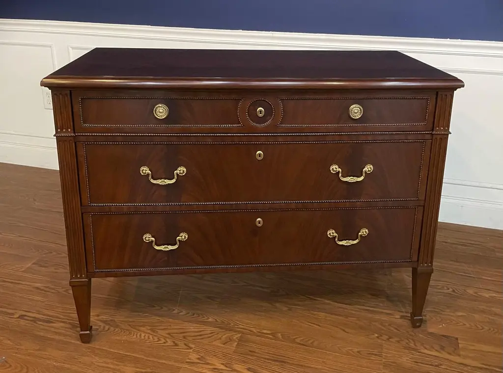 This is a Louis XVI style drawer chest. It features three drawers, solid brass hardware and faux key holes. The top, drawer fronts and sides have swirly crotch mahogany. The drawers are dovetailed and oak lined. The legs are classic Louis XVI styling with a square tapered shape. Dimensions: W=47”, D=21 1/2”, H=35”Options: Optional hardware Optional finishes Note: Some options are currently limited due to Covid related materials shortages.