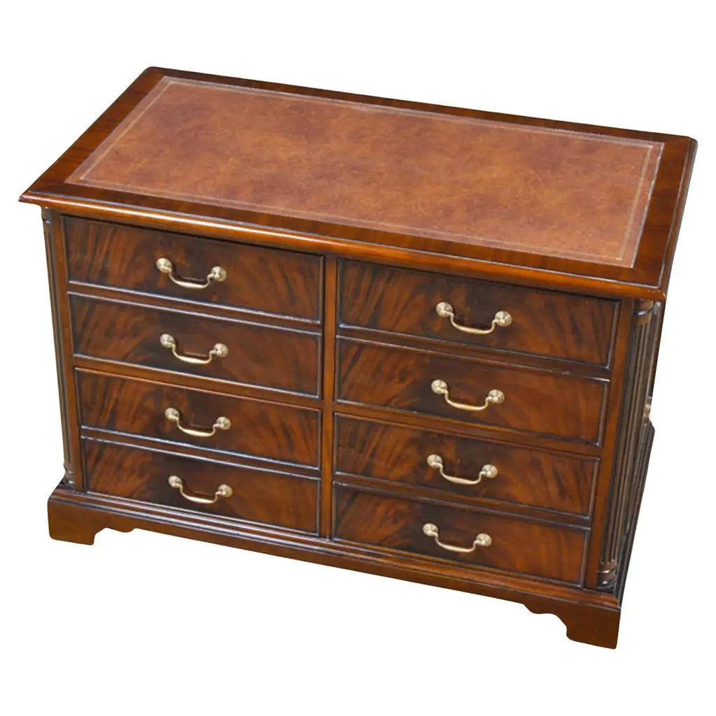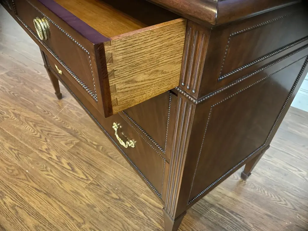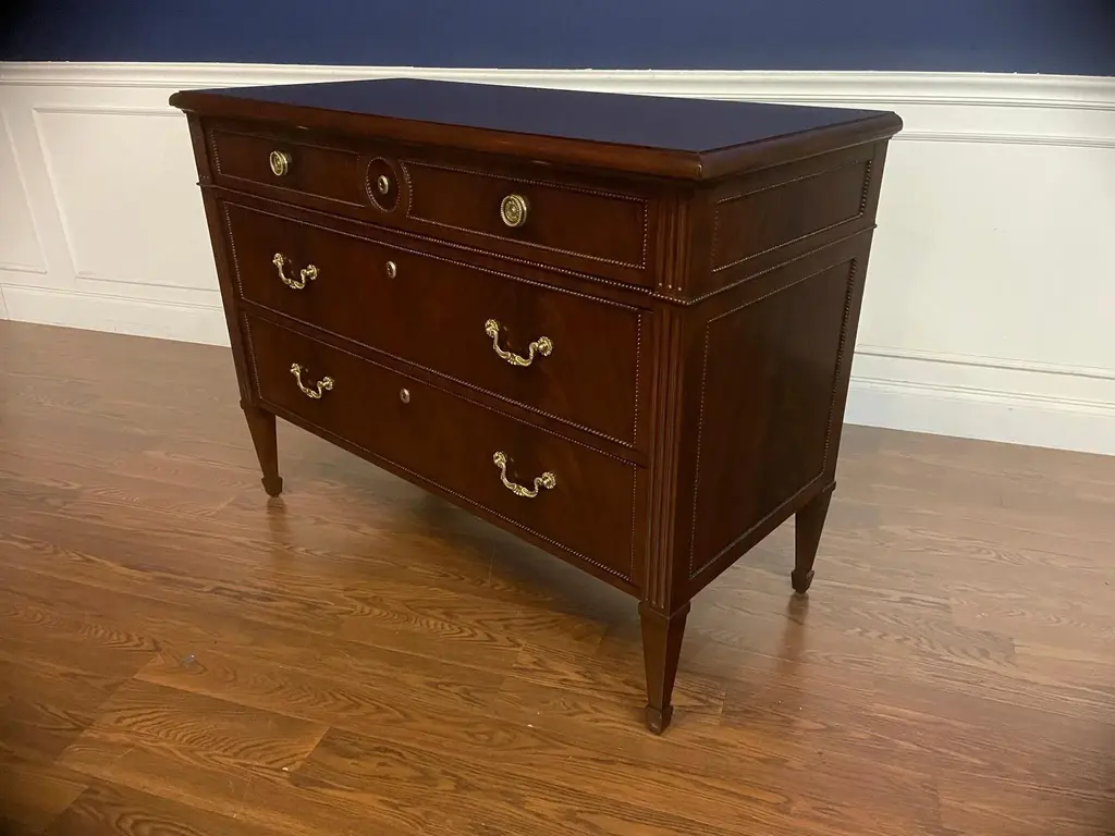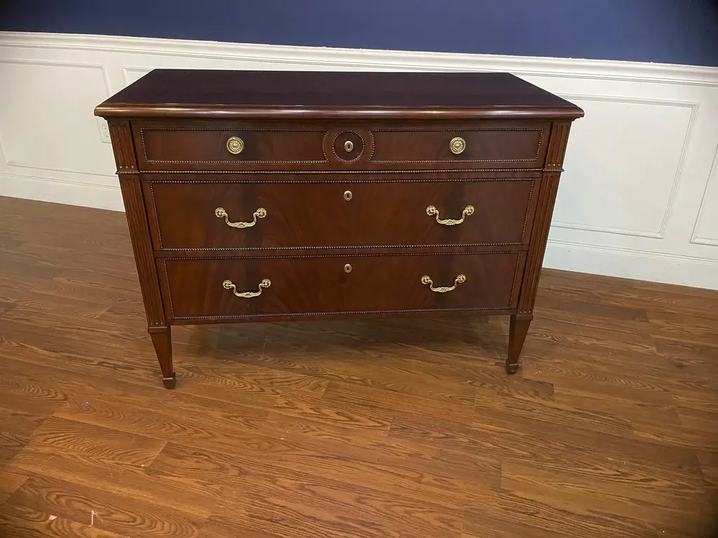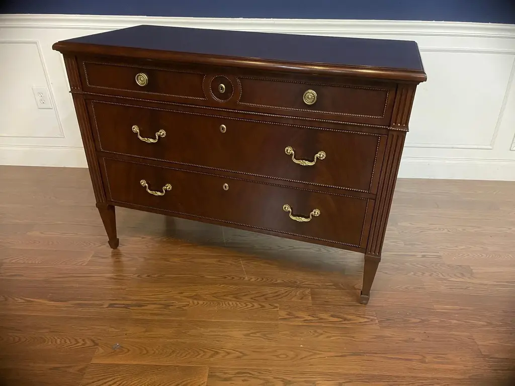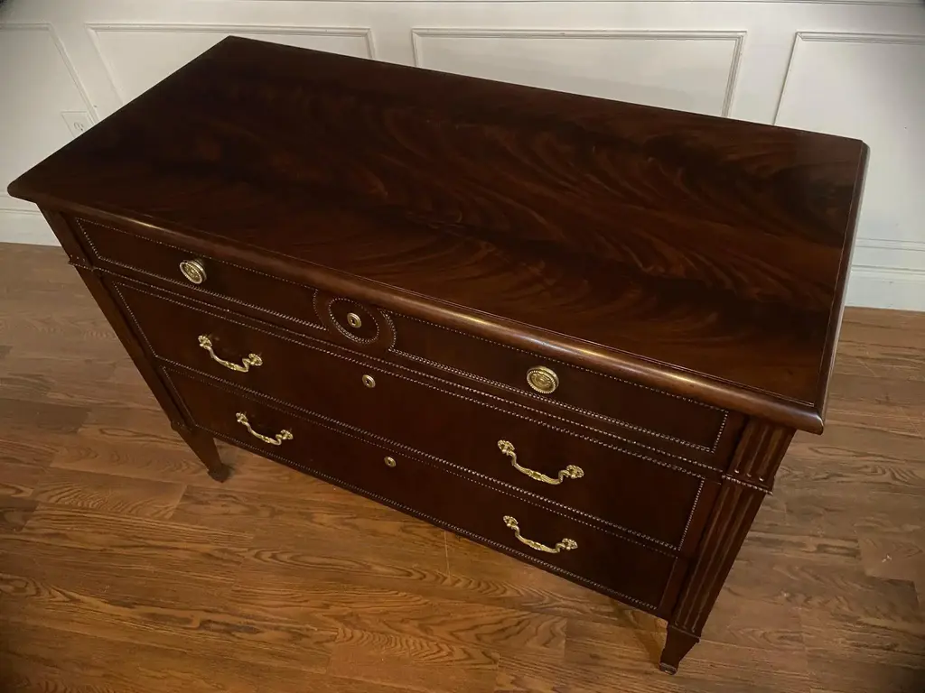 This is a Louis XVI style drawer chest. It features three drawers, solid brass hardware and faux key holes. The top, drawer fronts and sides have swirly crotch mahogany. The drawers are dovetailed and oak lined. The legs are classic Louis XVI styling with a square tapered shape. Dimensions: W=47”, D=21 1/2”, H=35”