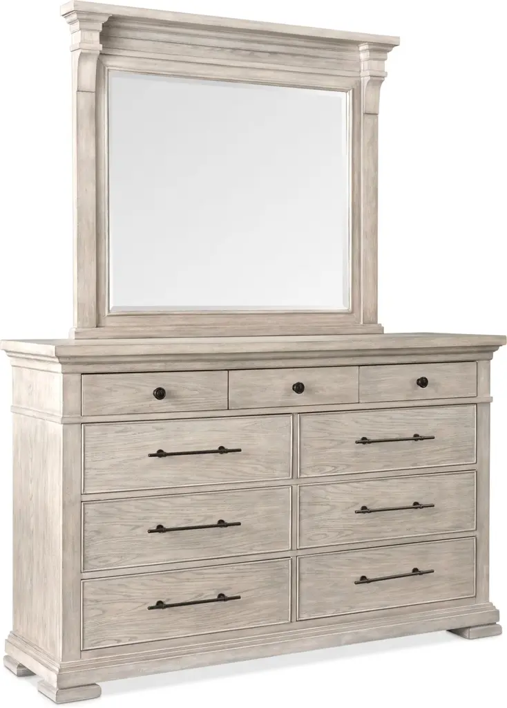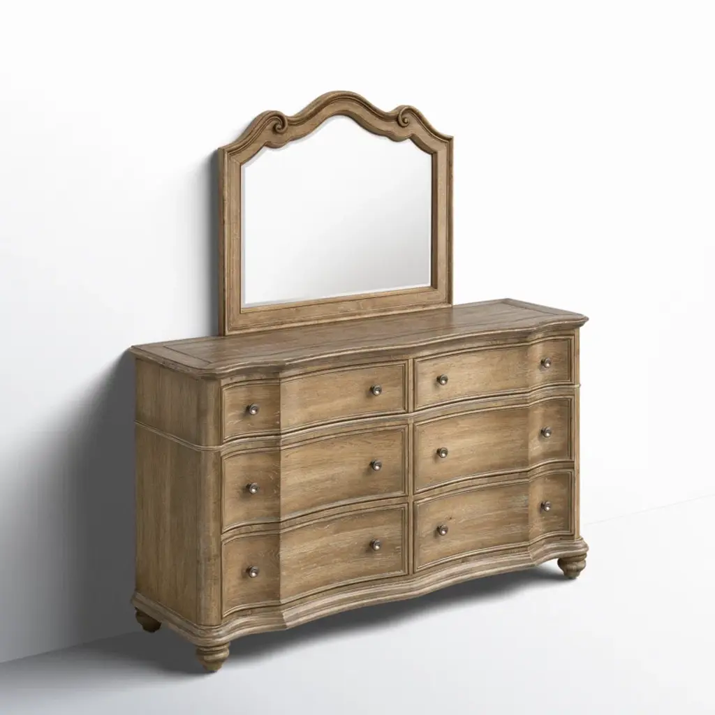 Bring the essence of an elegant home in the french countryside to your bedroom with the Louise dresser. Six spacious drawers allow you to neatly store away your belongings, while the surface is perfect for bedroom decor and jewelry stands. The knob hardware has an understated pewter finish for an effortless look. White cruising on cathedral hickory veneers enhances the grain and adds softness to the warm tones of the wood. Shapley fronts, rounded corners, and walnut inlays add distinction and character. Louise - perfectly timeless, perfectly today, perfectly you.