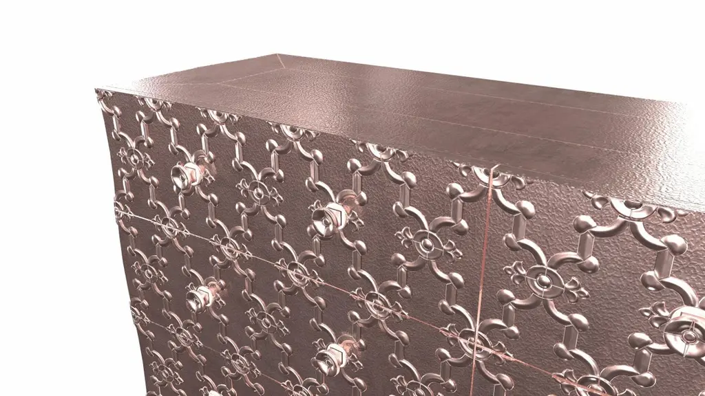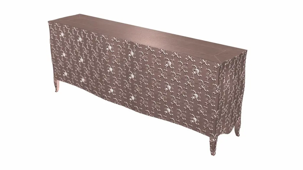 Renowned designer Paul Mathieu created this large dresser with 9 drawers with his interpretation of Fleur de Lis motif carved all over the piece just like the other two designs namely the Louise Semainier and Demi Louise Semainier which are part of the Louise Collection he created for Stephanie OdegardCrafted with utmost care and attention to detail, these Louis XVI Fleur De Lis are made to order and are available in twelve metal clad finishes, ensuring that you can choose the perfect one to match your individual style and taste. The use of high-quality materials and expert craftsmanship ensure that each Art Deco Louis XVI Fleur De Lis is not only beautiful but also a true piece of art.The curved legs and side arms of this Art Deco Louis XVI Fleur De Lis are hand carved from solid pieces of teak. Pattern makers trace and cut complex forms that will cover the chair in a skin of copper, white bronze, brass or antiqued white bronze The metal finishes will tarnish over time. Regular non-abrasive household metal polishes can be used to restore the original luster.Overall, if you're looking for a piece of furniture that combines luxury, comfort, and style, then the Art Deco Louis XVI Fleur De Lis is an excellent choice. With its distinctive curved profile and multiple finish options, this Chair set is sure to elevate the look of any room it is placed in, and be a beloved addition to your home for years to come.The images shown in this listing are shot in different lighting conditions and/or are 3D illustrations. We encourage our customers to please request a sample or a full sample set of 12 finishes so that they can experience the finish first hand. Louise Art Deco Blanket Chests Fleur De Lis Fine Hammered Copper by Paul MathieuSize- 84"x 18"x 33"HMaterials - Copper, Metal sheet, Teak, Wood, MetalTechniques: Hand-Crafted, Hand-Carved, Metal Work, Wood Work, Metal Wrapping, PolishedPlease note that moisture in air, sudden change in temperature and natural movement of wood over time causes the metal to wrinkle or bubble up. We use well seasoned, reclaimed teak and high quality marine grade MDF (wherever technically possible) to avoid and delay the mentioned changes. However a perfect stability of metal cannot be guaranteed. Please note that our smooth finish metal clad pieces will have some unavoidable tool marks. This is proof that everything is done by hand. The smooth finish will not come out like a machine made perfect surface and the master artisan will do their best to make it look as good/clean/stable/perfect as he possibly can.The antique white bronze finish is hand done by using an acidic chemical over the white bronze finish to recreate a natural patination. Like with the natural patination of silver, copper, or brass, the final result and color uniformity of the patina cannot be guaranteed. The goal of this finish is to achieve rainbow-like shades with dull, shiny, cloudy, and streaky patches to give an illusion of antiquing. Please note:None of our metal clad pieces are treated with a protective “finish” thus enabling the items to age naturally over time. We will of course polish them well before we pack them. a) Copper oxidizes faster than the other metals. In six to twelve months it will most likely lose its shine and will gradually turn to different shades of brown and/or green/blue. This aging process and its effect is referred to as verdigris. After a year the piece should not change much more. Copper does not rust, but does require periodic cleaning in order to retain its original shine if that the preferred option. ('BRASSO' or any known copper polish can be used to polish copper).b) Brass retains its shine for far longer than others, but will tarnish if not cleaned on occasion. ('BRASSO' is made to polish brass).c) White bronze, has the least tendency to show age or tarnish. If kept in a controlled climate, this metal will hold its shine for years. It can be cleaned with a cleanser and polished with a cloth. d) The antiqued white bronze finish will react with the natural elements the fastest in the beginning but it too will stop reacting and will settle down in a stable state like copper after 6-12 months. Since it is already antiqued and looked like it is tarnished, as described in an earlier message, this fast reaction will not change the over all look. In that way this surface is most forgiving. The images shown in this listing are shot in different lighting conditions and/or are 3D illustrations. We encourage our customers to please request a sample or a full sample set of 12 finishes so that they can experience the finish first hand.