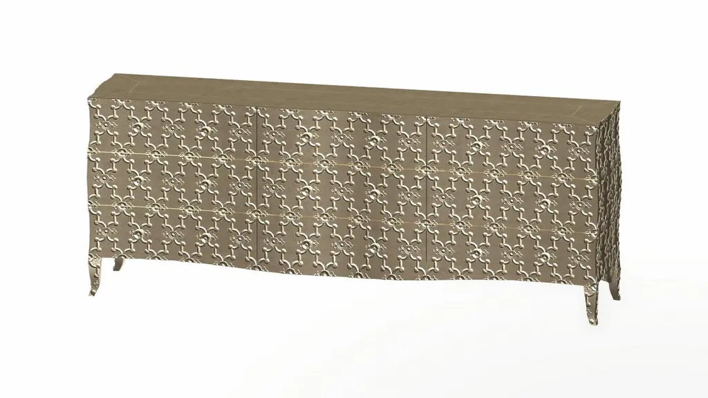 Renowned designer Paul Mathieu created this large dresser with 9 drawers with his interpretation of Fleur de Lis motif carved all over the piece just like the other two designs namely the Louise Semainier and Demi Louise Semainier which are part of the Louise Collection he created for Stephanie OdegardCrafted with utmost care and attention to detail, these Louis XVI Fleur De Lis are made to order and are available in twelve metal clad finishes, ensuring that you can choose the perfect one to match your individual style and taste. The use of high-quality materials and expert craftsmanship ensure that each Art Deco Louis XVI Fleur De Lis is not only beautiful but also a true piece of art.The curved legs and side arms of this Art Deco Louis XVI Fleur De Lis are hand carved from solid pieces of teak. Pattern makers trace and cut complex forms that will cover the chair in a skin of copper, white bronze, brass or antiqued white bronze The metal finishes will tarnish over time. Regular non-abrasive household metal polishes can be used to restore the original luster.Overall, if you're looking for a piece of furniture that combines luxury, comfort, and style, then the Art Deco Louis XVI Fleur De Lis is an excellent choice. With its distinctive curved profile and multiple finish options, this Chair set is sure to elevate the look of any room it is placed in, and be a beloved addition to your home for years to come.The images shown in this listing are shot in different lighting conditions and/or are 3D illustrations. We encourage our customers to please request a sample or a full sample set of 12 finishes so that they can experience the finish first hand. Louise Art Deco Blanket Chests Fleur De Lis Mid. Hammered Brass by Paul MathieuSize- 84"x 18"x 33"HMaterials - Brass, Metal sheet, Teak, Wood, MetalTechniques: Hand-Crafted, Hand-Carved, Metal Work, Wood Work, Metal Wrapping, PolishedPlease note that moisture in air, sudden change in temperature and natural movement of wood over time causes the metal to wrinkle or bubble up. We use well seasoned, reclaimed teak and high quality marine grade MDF (wherever technically possible) to avoid and delay the mentioned changes. However a perfect stability of metal cannot be guaranteed. Please note that our smooth finish metal clad pieces will have some unavoidable tool marks. This is proof that everything is done by hand. The smooth finish will not come out like a machine made perfect surface and the master artisan will do their best to make it look as good/clean/stable/perfect as he possibly can.The antique white bronze finish is hand done by using an acidic chemical over the white bronze finish to recreate a natural patination. Like with the natural patination of silver, copper, or brass, the final result and color uniformity of the patina cannot be guaranteed. The goal of this finish is to achieve rainbow-like shades with dull, shiny, cloudy, and streaky patches to give an illusion of antiquing. Please note:None of our metal clad pieces are treated with a protective “finish” thus enabling the items to age naturally over time. We will of course polish them well before we pack them. a) Copper oxidizes faster than the other metals. In six to twelve months it will most likely lose its shine and will gradually turn to different shades of brown and/or green/blue. This aging process and its effect is referred to as verdigris. After a year the piece should not change much more. Copper does not rust, but does require periodic cleaning in order to retain its original shine if that the preferred option. ('BRASSO' or any known copper polish can be used to polish copper).b) Brass retains its shine for far longer than others, but will tarnish if not cleaned on occasion. ('BRASSO' is made to polish brass).c) White bronze, has the least tendency to show age or tarnish. If kept in a controlled climate, this metal will hold its shine for years. It can be cleaned with a cleanser and polished with a cloth. d) The antiqued white bronze finish will react with the natural elements the fastest in the beginning but it too will stop reacting and will settle down in a stable state like copper after 6-12 months. Since it is already antiqued and looked like it is tarnished, as described in an earlier message, this fast reaction will not change the over all look. In that way this surface is most forgiving. The images shown in this listing are shot in different lighting conditions and/or are 3D illustrations. We encourage our customers to please request a sample or a full sample set of 12 finishes so that they can experience the finish first hand.