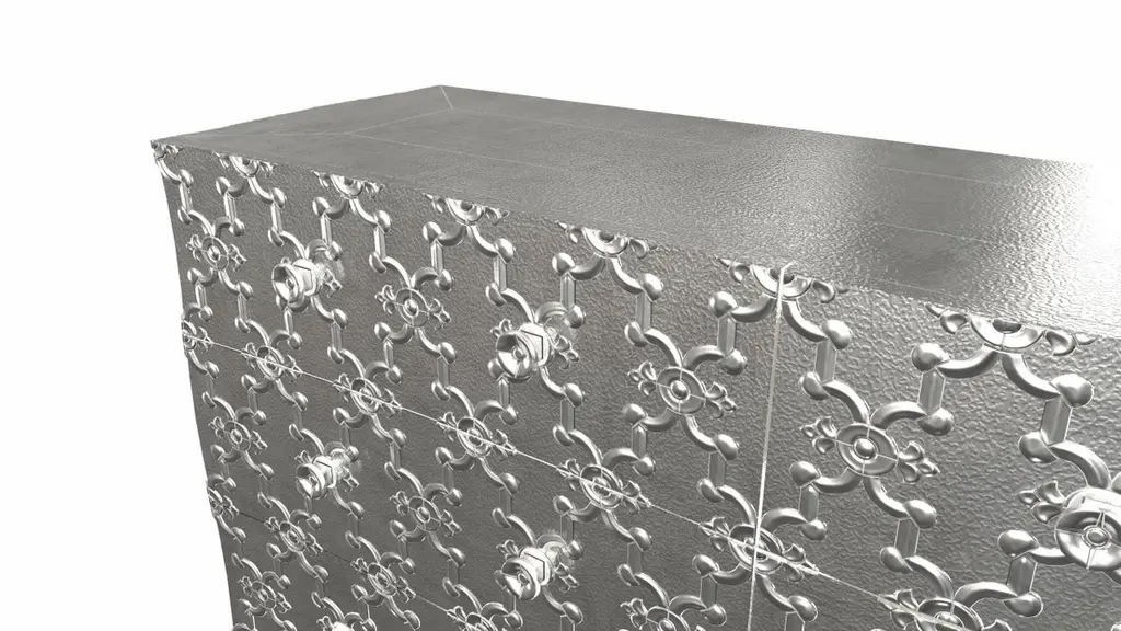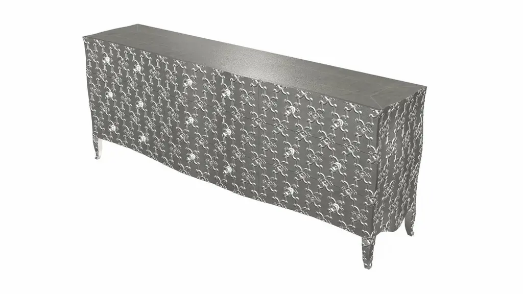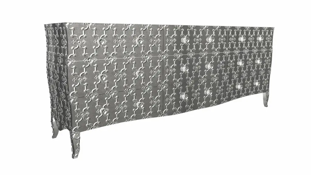 Renowned designer Paul Mathieu created this large dresser with 9 drawers with his interpretation of Fleur de Lis motif carved all over the piece just like the other two designs namely the Louise Semainier and Demi Louise Semainier which are part of the Louise Collection he created for Stephanie OdegardCrafted with utmost care and attention to detail, these Louis XVI Fleur De Lis are made to order and are available in twelve metal clad finishes, ensuring that you can choose the perfect one to match your individual style and taste. The use of high-quality materials and expert craftsmanship ensure that each Art Deco Louis XVI Fleur De Lis is not only beautiful but also a true piece of art.The curved legs and side arms of this Art Deco Louis XVI Fleur De Lis are hand carved from solid pieces of teak. Pattern makers trace and cut complex forms that will cover the chair in a skin of copper, white bronze, brass or antiqued white bronze The metal finishes will tarnish over time. Regular non-abrasive household metal polishes can be used to restore the original luster.Overall, if you're looking for a piece of furniture that combines luxury, comfort, and style, then the Art Deco Louis XVI Fleur De Lis is an excellent choice. With its distinctive curved profile and multiple finish options, this Chair set is sure to elevate the look of any room it is placed in, and be a beloved addition to your home for years to come.The images shown in this listing are shot in different lighting conditions and/or are 3D illustrations. We encourage our customers to please request a sample or a full sample set of 12 finishes so that they can experience the finish first hand. Louise Art Nouveau Dressers Fleu r De Lis Mid. Hammered White Bronze by Paul M.Size- 84"x 18"x 33"HMaterials - White Bronze, Metal sheet, Teak, Wood, MetalTechniques: Hand-Crafted, Hand-Carved, Metal Work, Wood Work, Metal Wrapping, PolishedPlease note that moisture in air, sudden change in temperature and natural movement of wood over time causes the metal to wrinkle or bubble up. We use well seasoned, reclaimed teak and high quality marine grade MDF (wherever technically possible) to avoid and delay the mentioned changes. However a perfect stability of metal cannot be guaranteed. Please note that our smooth finish metal clad pieces will have some unavoidable tool marks. This is proof that everything is done by hand. The smooth finish will not come out like a machine made perfect surface and the master artisan will do their best to make it look as good/clean/stable/perfect as he possibly can.The antique white bronze finish is hand done by using an acidic chemical over the white bronze finish to recreate a natural patination. Like with the natural patination of silver, copper, or brass, the final result and color uniformity of the patina cannot be guaranteed. The goal of this finish is to achieve rainbow-like shades with dull, shiny, cloudy, and streaky patches to give an illusion of antiquing. Please note:None of our metal clad pieces are treated with a protective “finish” thus enabling the items to age naturally over time. We will of course polish them well before we pack them. a) Copper oxidizes faster than the other metals. In six to twelve months it will most likely lose its shine and will gradually turn to different shades of brown and/or green/blue. This aging process and its effect is referred to as verdigris. After a year the piece should not change much more. Copper does not rust, but does require periodic cleaning in order to retain its original shine if that the preferred option. ('BRASSO' or any known copper polish can be used to polish copper).b) Brass retains its shine for far longer than others, but will tarnish if not cleaned on occasion. ('BRASSO' is made to polish brass).c) White bronze, has the least tendency to show age or tarnish. If kept in a controlled climate, this metal will hold its shine for years. It can be cleaned with a cleanser and polished with a cloth. d) The antiqued white bronze finish will react with the natural elements the fastest in the beginning but it too will stop reacting and will settle down in a stable state like copper after 6-12 months. Since it is already antiqued and looked like it is tarnished, as described in an earlier message, this fast reaction will not change the over all look. In that way this surface is most forgiving. The images shown in this listing are shot in different lighting conditions and/or are 3D illustrations. We encourage our customers to please request a sample or a full sample set of 12 finishes so that they can experience the finish first hand.