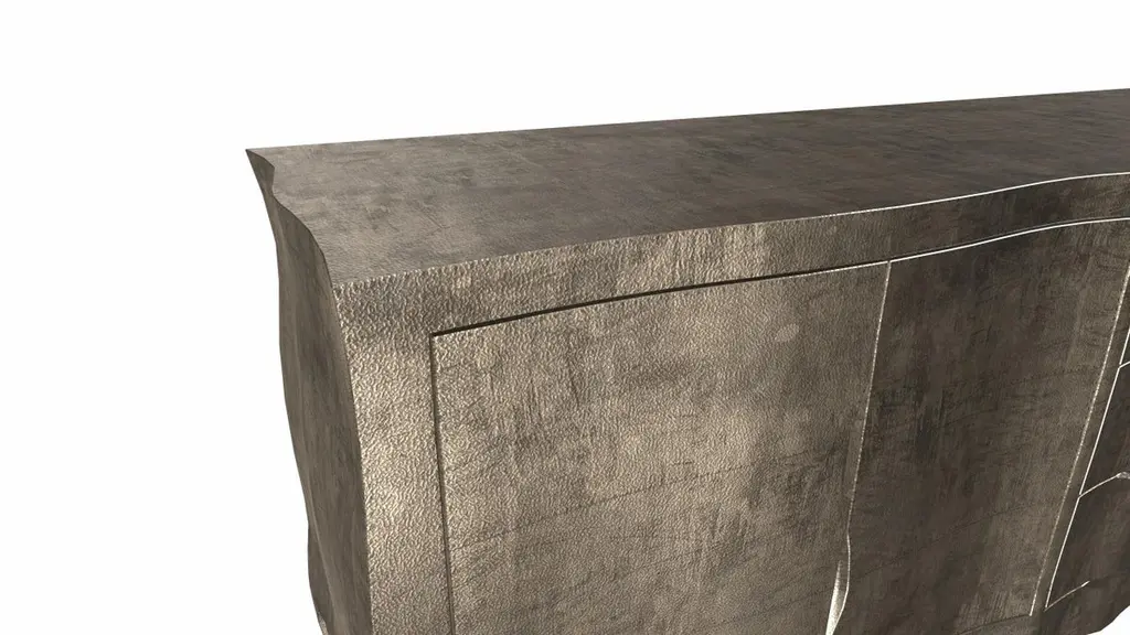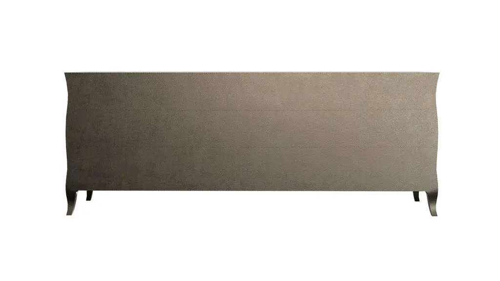 Louise Credenza from our Louise Collection. The renowned designer Paul Mathieu chose the name “Louise Credenza” when he created his more feminine version of Louis XV (1730-1760) furniture. The characteristic cabriole leg, curving outward at the knee and inward towards the foot in an "S" shape was born during this period. It is during the same era that English furniture makers produced the Queen Anne and Chippendale styles.Crafted with utmost care and attention to detail, these Louise Credenza are made to order and are available in twelve metal clad finishes, ensuring that you can choose the perfect one to match your individual style and taste. The use of high-quality materials and expert craftsmanship ensure that each Art Deco Louise Credenza is not only beautiful but also a true piece of Art.The curved legs and side arms of this Art Deco Louise Credenza are hand carved from solid pieces of teak. Pattern makers trace and cut complex forms that will cover the chair in a skin of copper, white bronze, brass or antiqued white bronze The metal finishes will tarnish over time. Regular non-abrasive household metal polishes can be used to restore the original luster.Overall, if you're looking for a piece of furniture that combines luxury, comfort, and style, then the Art Deco Louise Credenza is an excellent choice. With its distinctive curved profile and multiple finish options, this Chair set is sure to elevate the look of any room it is placed in, and be a beloved addition to your home for years to come.The images shown in this listing are shot in different lighting conditions and/or are 3D illustrations. We encourage our customers to please request a sample or a full sample set of 12 finishes so that they can experience the finish first hand. Louise Credenza Art Deco Dressers in Fine Hammered Antique Bronze by Paul Mathieu for Stephanie OdegardSize- 78"L x 21"W x 30"HMaterials - Antique Bronze, Metal sheet, Teak, Wood, MetalTechniques: Hand-Crafted, Hand-Carved, Metal Work, Wood Work, Metal Wrapping, PolishedPlease note that moisture in air, sudden change in temperature and natural movement of wood over time causes the metal to wrinkle or bubble up. We use well seasoned, reclaimed teak and high quality marine grade MDF (wherever technically possible) to avoid and delay the mentioned changes. However a perfect stability of metal cannot be guaranteed. Please note that our smooth finish metal clad pieces will have some unavoidable tool marks. This is proof that everything is done by hand. The smooth finish will not come out like a machine made perfect surface and the master Artisan will do their best to make it look as good/clean/stable/perfect as he possibly can.The antique white bronze finish is hand done by using an acidic chemical over the white bronze finish to recreate a natural patination. Like with the natural patination of silver, copper, or brass, the final result and color uniformity of the patina cannot be guaranteed. The goal of this finish is to achieve rainbow-like shades with dull, shiny, cloudy, and streaky patches to give an illusion of antiquing. Please note:None of our metal clad pieces are treated with a protective “finish” thus enabling the items to age naturally over time. We will of course polish them well before we pack them. a) Copper oxidizes faster than the other metals. In six to twelve months it will most likely lose its shine and will gradually turn to different shades of brown and/or green/blue. This aging process and its effect is referred to as verdigris. After a year the piece should not change much more. Copper does not rust, but does require periodic cleaning in order to retain its original shine if that the preferred option. ('BRASSO' or any known copper polish can be used to polish copper).b) Brass retains its shine for far longer than others, but will tarnish if not cleaned on occasion. ('BRASSO' is made to polish brass).c) White bronze, has the least tendency to show age or tarnish. If kept in a controlled climate, this metal will hold its shine for years. It can be cleaned with a cleanser and polished with a cloth. d) The antiqued white bronze finish will react with the natural elements the fastest in the beginning but it too will stop reacting and will settle down in a stable state like copper after 6-12 months. Since it is already antiqued and looked like it is tarnished, as described in an earlier message, this fast reaction will not change the over all look. In that way this surface is most forgiving. The images shown in this listing are shot in different lighting conditions and/or are 3D illustrations. We encourage our customers to please request a sample or a full sample set of 12 finishes so that they can experience the finish first hand.