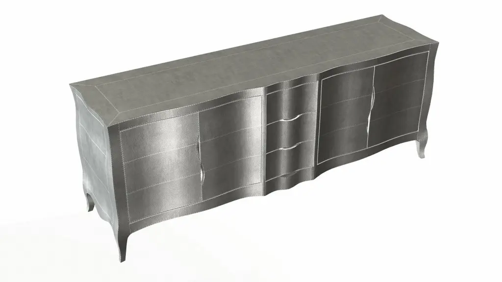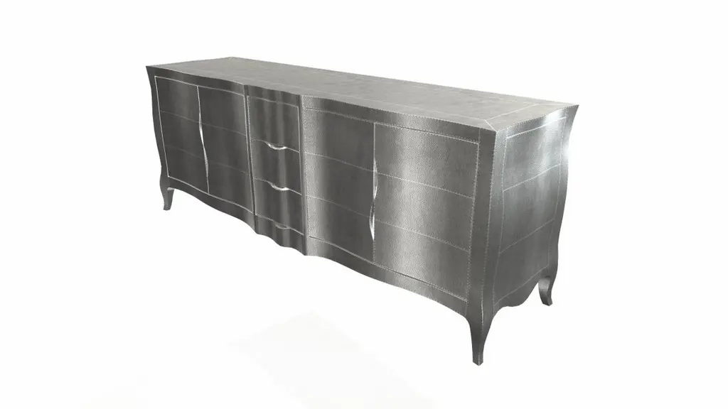 Louise Credenza from our Louise Collection. The renowned designer Paul Mathieu chose the name “Louise Credenza” when he created his more feminine version of Louis XV (1730-1760) furniture. The characteristic cabriole leg, curving outward at the knee and inward towards the foot in an "S" shape was born during this period. It is during the same era that English furniture makers produced the Queen Anne and Chippendale styles.Crafted with utmost care and attention to detail, these Louise Credenza are made to order and are available in twelve metal clad finishes, ensuring that you can choose the perfect one to match your individual style and taste. The use of high-quality materials and expert craftsmanship ensure that each Art Deco Louise Credenza is not only beautiful but also a true piece of Art.The curved legs and side arms of this Art Deco Louise Credenza are hand carved from solid pieces of teak. Pattern makers trace and cut complex forms that will cover the chair in a skin of copper, white bronze, brass or antiqued white bronze The metal finishes will tarnish over time. Regular non-abrasive household metal polishes can be used to restore the original luster.Overall, if you're looking for a piece of furniture that combines luxury, comfort, and style, then the Art Deco Louise Credenza is an excellent choice. With its distinctive curved profile and multiple finish options, this Chair set is sure to elevate the look of any room it is placed in, and be a beloved addition to your home for years to come.The images shown in this listing are shot in different lighting conditions and/or are 3D illustrations. We encourage our customers to please request a sample or a full sample set of 12 finishes so that they can experience the finish first hand. Louise Credenza Art Deco Dressers in Mid. Hammered White Bronze by Paul Mathieu for Stephanie OdegardSize- 78"L x 21"W x 30"HMaterials - White Bronze, Metal sheet, Teak, Wood, MetalTechniques: Hand-Crafted, Hand-Carved, Metal Work, Wood Work, Metal Wrapping, PolishedPlease note that moisture in air, sudden change in temperature and natural movement of wood over time causes the metal to wrinkle or bubble up. We use well seasoned, reclaimed teak and high quality marine grade MDF (wherever technically possible) to avoid and delay the mentioned changes. However a perfect stability of metal cannot be guaranteed. Please note that our smooth finish metal clad pieces will have some unavoidable tool marks. This is proof that everything is done by hand. The smooth finish will not come out like a machine made perfect surface and the master Artisan will do their best to make it look as good/clean/stable/perfect as he possibly can.The antique white bronze finish is hand done by using an acidic chemical over the white bronze finish to recreate a natural patination. Like with the natural patination of silver, copper, or brass, the final result and color uniformity of the patina cannot be guaranteed. The goal of this finish is to achieve rainbow-like shades with dull, shiny, cloudy, and streaky patches to give an illusion of antiquing. Please note:None of our metal clad pieces are treated with a protective “finish” thus enabling the items to age naturally over time. We will of course polish them well before we pack them. a) Copper oxidizes faster than the other metals. In six to twelve months it will most likely lose its shine and will gradually turn to different shades of brown and/or green/blue. This aging process and its effect is referred to as verdigris. After a year the piece should not change much more. Copper does not rust, but does require periodic cleaning in order to retain its original shine if that the preferred option. ('BRASSO' or any known copper polish can be used to polish copper).b) Brass retains its shine for far longer than others, but will tarnish if not cleaned on occasion. ('BRASSO' is made to polish brass).c) White bronze, has the least tendency to show age or tarnish. If kept in a controlled climate, this metal will hold its shine for years. It can be cleaned with a cleanser and polished with a cloth. d) The antiqued white bronze finish will react with the natural elements the fastest in the beginning but it too will stop reacting and will settle down in a stable state like copper after 6-12 months. Since it is already antiqued and looked like it is tarnished, as described in an earlier message, this fast reaction will not change the over all look. In that way this surface is most forgiving. The images shown in this listing are shot in different lighting conditions and/or are 3D illustrations. We encourage our customers to please request a sample or a full sample set of 12 finishes so that they can experience the finish first hand.