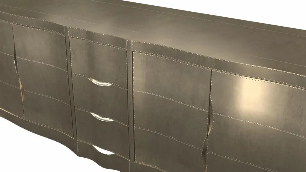 Louise Credenza from our Louise Collection. The renowned designer Paul Mathieu chose the name “Louise Credenza” when he created his more feminine version of Louis XV (1730-1760) furniture. The characteristic cabriole leg, curving outward at the knee and inward towards the foot in an "S" shape was born during this period. It is during the same era that English furniture makers produced the Queen Anne and Chippendale styles.Crafted with utmost care and attention to detail, these Louise Credenza are made to order and are available in twelve metal clad finishes, ensuring that you can choose the perfect one to match your individual style and taste. The use of high-quality materials and expert craftsmanship ensure that each Art Deco Louise Credenza is not only beautiful but also a true piece of Art.The curved legs and side arms of this Art Deco Louise Credenza are hand carved from solid pieces of teak. Pattern makers trace and cut complex forms that will cover the chair in a skin of copper, white bronze, brass or antiqued white bronze The metal finishes will tarnish over time. Regular non-abrasive household metal polishes can be used to restore the original luster.Overall, if you're looking for a piece of furniture that combines luxury, comfort, and style, then the Art Deco Louise Credenza is an excellent choice. With its distinctive curved profile and multiple finish options, this Chair set is sure to elevate the look of any room it is placed in, and be a beloved addition to your home for years to come.The images shown in this listing are shot in different lighting conditions and/or are 3D illustrations. We encourage our customers to please request a sample or a full sample set of 12 finishes so that they can experience the finish first hand. Louise Credenza Art Deco Dressers in Smooth Brass by Paul Mathieu for Stephaine OdegardSize- 78"L x 21"W x 30"HMaterials - Brass, Metal sheet, Teak, Wood, MetalTechniques: Hand-Crafted, Hand-Carved, Metal Work, Wood Work, Metal Wrapping, PolishedPlease note that moisture in air, sudden change in temperature and natural movement of wood over time causes the metal to wrinkle or bubble up. We use well seasoned, reclaimed teak and high quality marine grade MDF (wherever technically possible) to avoid and delay the mentioned changes. However a perfect stability of metal cannot be guaranteed. Please note that our smooth finish metal clad pieces will have some unavoidable tool marks. This is proof that everything is done by hand. The smooth finish will not come out like a machine made perfect surface and the master Artisan will do their best to make it look as good/clean/stable/perfect as he possibly can.The antique white bronze finish is hand done by using an acidic chemical over the white bronze finish to recreate a natural patination. Like with the natural patination of silver, copper, or brass, the final result and color uniformity of the patina cannot be guaranteed. The goal of this finish is to achieve rainbow-like shades with dull, shiny, cloudy, and streaky patches to give an illusion of antiquing. Please note:None of our metal clad pieces are treated with a protective “finish” thus enabling the items to age naturally over time. We will of course polish them well before we pack them. a) Copper oxidizes faster than the other metals. In six to twelve months it will most likely lose its shine and will gradually turn to different shades of brown and/or green/blue. This aging process and its effect is referred to as verdigris. After a year the piece should not change much more. Copper does not rust, but does require periodic cleaning in order to retain its original shine if that the preferred option. ('BRASSO' or any known copper polish can be used to polish copper).b) Brass retains its shine for far longer than others, but will tarnish if not cleaned on occasion. ('BRASSO' is made to polish brass).c) White bronze, has the least tendency to show age or tarnish. If kept in a controlled climate, this metal will hold its shine for years. It can be cleaned with a cleanser and polished with a cloth. d) The antiqued white bronze finish will react with the natural elements the fastest in the beginning but it too will stop reacting and will settle down in a stable state like copper after 6-12 months. Since it is already antiqued and looked like it is tarnished, as described in an earlier message, this fast reaction will not change the over all look. In that way this surface is most forgiving. The images shown in this listing are shot in different lighting conditions and/or are 3D illustrations. We encourage our customers to please request a sample or a full sample set of 12 finishes so that they can experience the finish first hand.