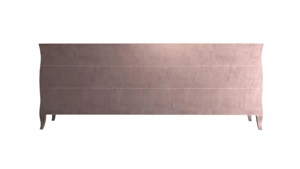 Louise Credenza from our Louise Collection. The renowned designer Paul Mathieu chose the name “Louise Credenza” when he created his more feminine version of Louis XV (1730-1760) furniture. The characteristic cabriole leg, curving outward at the knee and inward towards the foot in an "S" shape was born during this period. It is during the same era that English furniture makers produced the Queen Anne and Chippendale styles.Crafted with utmost care and attention to detail, these Louise Credenza are made to order and are available in twelve metal clad finishes, ensuring that you can choose the perfect one to match your individual style and taste. The use of high-quality materials and expert craftsmanship ensure that each Art Deco Louise Credenza is not only beautiful but also a true piece of Art.The curved legs and side arms of this Art Deco Louise Credenza are hand carved from solid pieces of teak. Pattern makers trace and cut complex forms that will cover the chair in a skin of copper, white bronze, brass or antiqued white bronze The metal finishes will tarnish over time. Regular non-abrasive household metal polishes can be used to restore the original luster.Overall, if you're looking for a piece of furniture that combines luxury, comfort, and style, then the Art Deco Louise Credenza is an excellent choice. With its distinctive curved profile and multiple finish options, this Chair set is sure to elevate the look of any room it is placed in, and be a beloved addition to your home for years to come.The images shown in this listing are shot in different lighting conditions and/or are 3D illustrations. We encourage our customers to please request a sample or a full sample set of 12 finishes so that they can experience the finish first hand. Louise Credenza Art Deco Dressers in Smooth Copper by Paul Mathieu for Stephanie OdegardSize- 78"L x 21"W x 30"HMaterials - Copper, Metal sheet, Teak, Wood, MetalTechniques: Hand-Crafted, Hand-Carved, Metal Work, Wood Work, Metal Wrapping, PolishedPlease note that moisture in air, sudden change in temperature and natural movement of wood over time causes the metal to wrinkle or bubble up. We use well seasoned, reclaimed teak and high quality marine grade MDF (wherever technically possible) to avoid and delay the mentioned changes. However a perfect stability of metal cannot be guaranteed. Please note that our smooth finish metal clad pieces will have some unavoidable tool marks. This is proof that everything is done by hand. The smooth finish will not come out like a machine made perfect surface and the master Artisan will do their best to make it look as good/clean/stable/perfect as he possibly can.The antique white bronze finish is hand done by using an acidic chemical over the white bronze finish to recreate a natural patination. Like with the natural patination of silver, copper, or brass, the final result and color uniformity of the patina cannot be guaranteed. The goal of this finish is to achieve rainbow-like shades with dull, shiny, cloudy, and streaky patches to give an illusion of antiquing. Please note:None of our metal clad pieces are treated with a protective “finish” thus enabling the items to age naturally over time. We will of course polish them well before we pack them. a) Copper oxidizes faster than the other metals. In six to twelve months it will most likely lose its shine and will gradually turn to different shades of brown and/or green/blue. This aging process and its effect is referred to as verdigris. After a year the piece should not change much more. Copper does not rust, but does require periodic cleaning in order to retain its original shine if that the preferred option. ('BRASSO' or any known copper polish can be used to polish copper).b) Brass retains its shine for far longer than others, but will tarnish if not cleaned on occasion. ('BRASSO' is made to polish brass).c) White bronze, has the least tendency to show age or tarnish. If kept in a controlled climate, this metal will hold its shine for years. It can be cleaned with a cleanser and polished with a cloth. d) The antiqued white bronze finish will react with the natural elements the fastest in the beginning but it too will stop reacting and will settle down in a stable state like copper after 6-12 months. Since it is already antiqued and looked like it is tarnished, as described in an earlier message, this fast reaction will not change the over all look. In that way this surface is most forgiving. The images shown in this listing are shot in different lighting conditions and/or are 3D illustrations. We encourage our customers to please request a sample or a full sample set of 12 finishes so that they can experience the finish first hand.