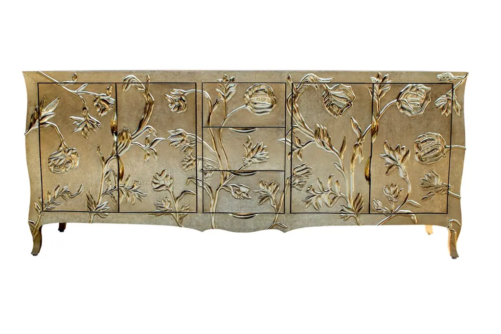 Introducing our exquisite Louise Art Nouveau Dressers, stunning art nouveau dressers inspired by two of the most beloved designs from the Stephanie Odegard collection. Drawing inspiration from the enchanting floral motifs found in the palaces of Rajasthan, as well as the timeless elegance of Paul Mathieu Designs, these art nouveau dressers embody a harmonious blend of beauty and sophistication.Handcrafted with meticulous attention to detail, these art nouveau dressers are constructed from solid teak, skilfully joined to create a clean and refined silhouette. Our master craftsmen intricately carve delicate floral forms, which are then encased in a snug-fitting metal skin. The gracefully curved legs and side rails of these exceptional art nouveau dressers are meticulously hand-carved from solid teak, showcasing the artistry of our skilled artisans.To achieve their captivating allure, the art nouveau dressers are adorned with a choice of metal skins, including Brass, White Bronze, Antiqued Bronze, Silver, and Copper. The metal sheets, whether copper or silver, are carefully traced and cut into complex forms that envelop the entire art nouveau dressers. The silver utilized in these art nouveau dressers boasts an exceptional purity level of 96%, surpassing the minimum standard for sterling silver at 92.5%. While both silver and copper will develop a natural patina over time, the original luster can be restored effortlessly using regular non-abrasive household metal polishes.Measuring 78" x 18" x 32" (H), the Louise Art Nouveau Dressers are an embodiment of elegance and functionality. Their generous dimensions provide ample storage space, allowing you to organize your belongings with ease. With their meticulously hand-carved details, hand-hammered metal skin, and a polished semi-matte finish, these art nouveau dressers exude timeless charm and sophistication.We understand the importance of selecting the perfect finish, and therefore, we are delighted to offer samples for your evaluation before confirming your order. This way, you can personally judge and experience the captivating beauty of our art nouveau dressers first-hand.Please note that due to the inherent nature of wood and the impact of environmental factors, such as moisture and temperature changes, the metal skin may develop slight wrinkles or bubbles over time. However, we utilize well-seasoned, reclaimed teak and high-quality marine-grade MDF (wherever technically feasible) to minimize and delay these changes. Please also be aware that our handcrafted metal-clad pieces may exhibit subtle tool marks, serving as a testament to the meticulous craftsmanship behind each art nouveau dresser. For those seeking a flawless surface, our hammered finishes offer a safer alternative, while also providing increased resistance against natural forces and potential bubbling or wrinkling.Elevate your living space with these timeless art nouveau dressers that seamlessly combine the elegance of Art Nouveau design with impeccable craftsmanship.
