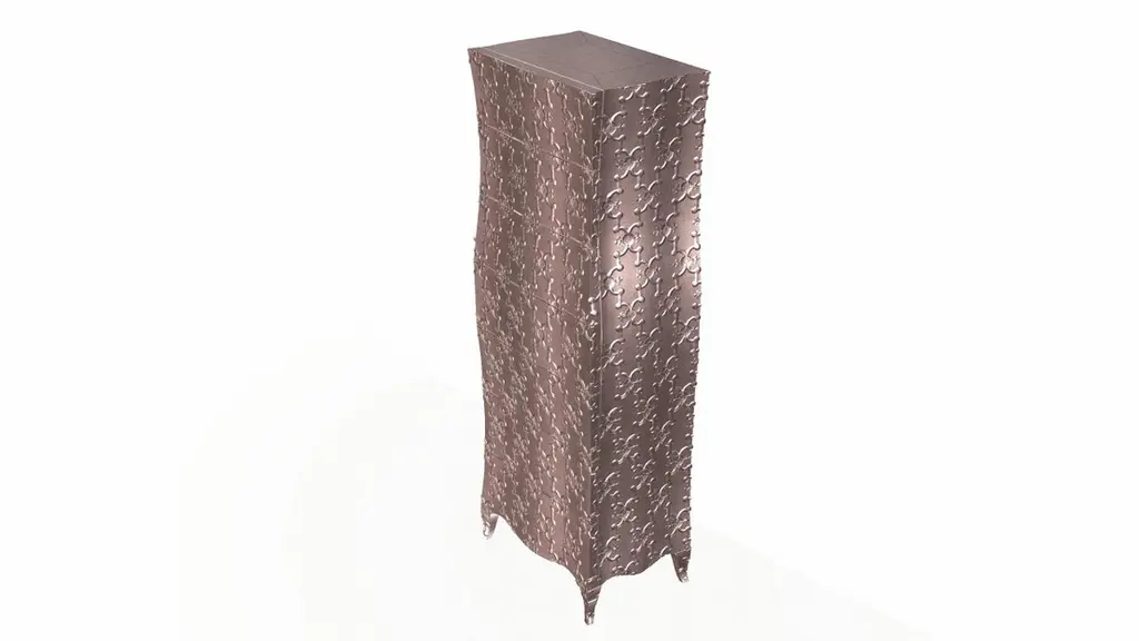 “Semainier” refers to a French piece of furniture with seven drawers (Fr. Semaine = week). It is part of the Louise Collection designed by renowned designer Paul Mathieu. A remarkable piece in which each of the exterior faces is entirely sculpted out of a solid piece of wood by hand, then covered with metal sheeting. The available options for metal cladding are brass, white bronze, antiqued bronze, silver and copper. Both silver and copper will tarnish over time. Regular non-abrasive household metal polishes can be used to restore the original finish. Crafted with utmost care and attention to detail, these Louise Semainier are made to order and are available in twelve metal clad finishes, ensuring that you can choose the perfect one to match your individual style and taste. The use of high-quality materials and expert craftsmanship ensure that each Art Deco Louise Semainier is not only beautiful but also a true piece of art.The curved legs and side arms of this Art Deco Louise Semainier are hand carved from solid pieces of teak. Pattern makers trace and cut complex forms that will cover the chair in a skin of copper, white bronze, brass or antiqued white bronze The metal finishes will tarnish over time. Regular non-abrasive household metal polishes can be used to restore the original luster.Overall, if you're looking for a piece of furniture that combines luxury, comfort, and style, then the Art Deco Louise Semainier is an excellent choice. With its distinctive curved profile and multiple finish options, this Chair set is sure to elevate the look of any room it is placed in, and be a beloved addition to your home for years to come.The images shown in this listing are shot in different lighting conditions and/or are 3D illustrations. We encourage our customers to please request a sample or a full sample set of 12 finishes so that they can experience the finish first hand. Louise Semainier Linen Presses in Mid. Hammered Copper by Paul Mathieu for Stephanie OdegardSize- 24"x 16"x 66"HMaterials - Antique White Bronze, Metal sheet, Teak, Wood, MetalTechniques: Hand-Crafted, Hand-Carved, Metal Work, Wood Work, Metal Wrapping, PolishedPlease note that moisture in air, sudden change in temperature and natural movement of wood over time causes the metal to wrinkle or bubble up. We use well seasoned, reclaimed teak and high quality marine grade MDF (wherever technically possible) to avoid and delay the mentioned changes. However a perfect stability of metal cannot be guaranteed. Please note that our smooth finish metal clad pieces will have some unavoidable tool marks. This is proof that everything is done by hand. The smooth finish will not come out like a machine made perfect surface and the master artisan will do their best to make it look as good/clean/stable/perfect as he possibly can.The antique white bronze finish is hand done by using an acidic chemical over the white bronze finish to recreate a natural patination. Like with the natural patination of silver, copper, or brass, the final result and color uniformity of the patina cannot be guaranteed. The goal of this finish is to achieve rainbow-like shades with dull, shiny, cloudy, and streaky patches to give an illusion of antiquing. Please note:None of our metal clad pieces are treated with a protective “finish” thus enabling the items to age naturally over time. We will of course polish them well before we pack them. a) Copper oxidizes faster than the other metals. In six to twelve months it will most likely lose its shine and will gradually turn to different shades of brown and/or green/blue. This aging process and its effect is referred to as verdigris. After a year the piece should not change much more. Copper does not rust, but does require periodic cleaning in order to retain its original shine if that the preferred option. ('BRASSO' or any known copper polish can be used to polish copper).b) Brass retains its shine for far longer than others, but will tarnish if not cleaned on occasion. ('BRASSO' is made to polish brass).c) White bronze, has the least tendency to show age or tarnish. If kept in a controlled climate, this metal will hold its shine for years. It can be cleaned with a cleanser and polished with a cloth. d) The antiqued white bronze finish will react with the natural elements the fastest in the beginning but it too will stop reacting and will settle down in a stable state like copper after 6-12 months. Since it is already antiqued and looked like it is tarnished, as described in an earlier message, this fast reaction will not change the over all look. In that way this surface is most forgiving. The images shown in this listing are shot in different lighting conditions and/or are 3D illustrations. We encourage our customers to please request a sample or a full sample set of 12 finishes so that they can experience the finish first hand.