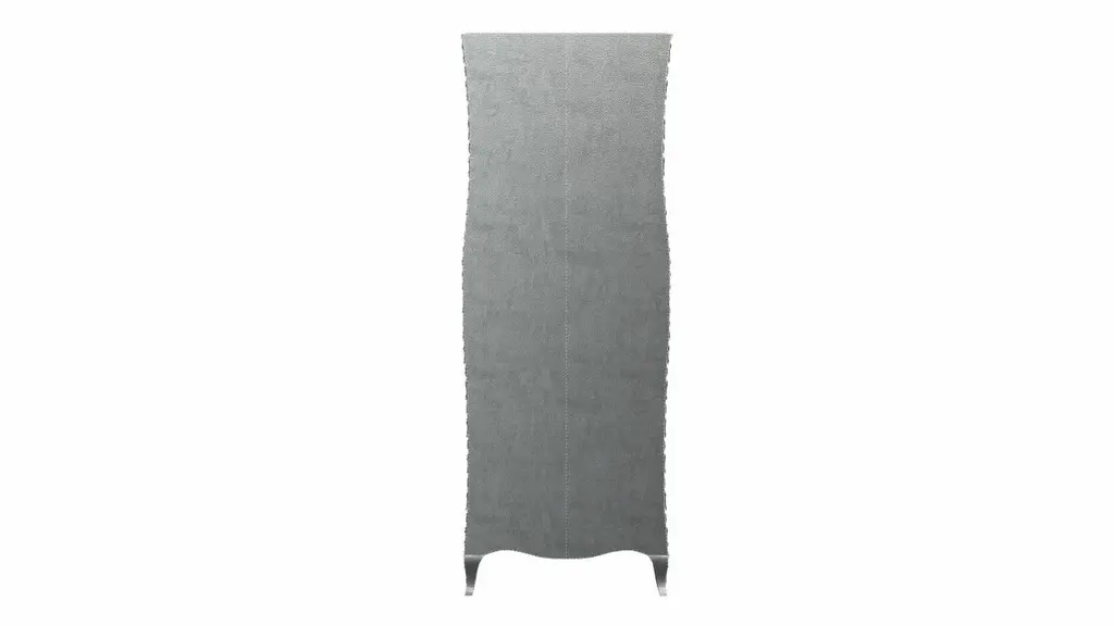 “Semainier” refers to a French piece of furniture with seven drawers (Fr. Semaine = week). It is part of the Louise Collection designed by renowned designer Paul Mathieu. A remarkable piece in which each of the exterior faces is entirely sculpted out of a solid piece of wood by hand, then covered with metal sheeting. The available options for metal cladding are brass, white bronze, antiqued bronze, silver and copper. Both silver and copper will tarnish over time. Regular non-abrasive household metal polishes can be used to restore the original finish. Crafted with utmost care and attention to detail, these Louise Semainier are made to order and are available in twelve metal clad finishes, ensuring that you can choose the perfect one to match your individual style and taste. The use of high-quality materials and expert craftsmanship ensure that each Art Deco Louise Semainier is not only beautiful but also a true piece of art.The curved legs and side arms of this Art Deco Louise Semainier are hand carved from solid pieces of teak. Pattern makers trace and cut complex forms that will cover the chair in a skin of copper, white bronze, brass or antiqued white bronze The metal finishes will tarnish over time. Regular non-abrasive household metal polishes can be used to restore the original luster.Overall, if you're looking for a piece of furniture that combines luxury, comfort, and style, then the Art Deco Louise Semainier is an excellent choice. With its distinctive curved profile and multiple finish options, this Chair set is sure to elevate the look of any room it is placed in, and be a beloved addition to your home for years to come.The images shown in this listing are shot in different lighting conditions and/or are 3D illustrations. We encourage our customers to please request a sample or a full sample set of 12 finishes so that they can experience the finish first hand. Louise Semainier Linen Presses in Mid. Hammered White Bronze by Paul Mathieu for Stephanie OdegardSize- 24"x 16"x 66"HMaterials - Antique White Bronze, Metal sheet, Teak, Wood, Metal Techniques: Hand-Crafted, Hand-Carved, Metal Work, Wood Work, Metal Wrapping, PolishedPlease note that moisture in air, sudden change in temperature and natural movement of wood over time causes the metal to wrinkle or bubble up. We use well seasoned, reclaimed teak and high quality marine grade MDF (wherever technically possible) to avoid and delay the mentioned changes. However a perfect stability of metal cannot be guaranteed. Please note that our smooth finish metal clad pieces will have some unavoidable tool marks. This is proof that everything is done by hand. The smooth finish will not come out like a machine made perfect surface and the master artisan will do their best to make it look as good/clean/stable/perfect as he possibly can.The antique white bronze finish is hand done by using an acidic chemical over the white bronze finish to recreate a natural patination. Like with the natural patination of silver, copper, or brass, the final result and color uniformity of the patina cannot be guaranteed. The goal of this finish is to achieve rainbow-like shades with dull, shiny, cloudy, and streaky patches to give an illusion of antiquing. Please note:None of our metal clad pieces are treated with a protective “finish” thus enabling the items to age naturally over time. We will of course polish them well before we pack them. a) Copper oxidizes faster than the other metals. In six to twelve months it will most likely lose its shine and will gradually turn to different shades of brown and/or green/blue. This aging process and its effect is referred to as verdigris. After a year the piece should not change much more. Copper does not rust, but does require periodic cleaning in order to retain its original shine if that the preferred option. ('BRASSO' or any known copper polish can be used to polish copper).b) Brass retains its shine for far longer than others, but will tarnish if not cleaned on occasion. ('BRASSO' is made to polish brass).c) White bronze, has the least tendency to show age or tarnish. If kept in a controlled climate, this metal will hold its shine for years. It can be cleaned with a cleanser and polished with a cloth. d) The antiqued white bronze finish will react with the natural elements the fastest in the beginning but it too will stop reacting and will settle down in a stable state like copper after 6-12 months. Since it is already antiqued and looked like it is tarnished, as described in an earlier message, this fast reaction will not change the over all look. In that way this surface is most forgiving. The images shown in this listing are shot in different lighting conditions and/or are 3D illustrations. We encourage our customers to please request a sample or a full sample set of 12 finishes so that they can experience the finish first hand.