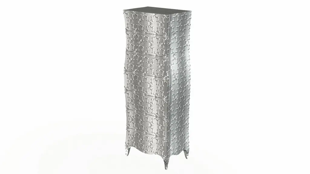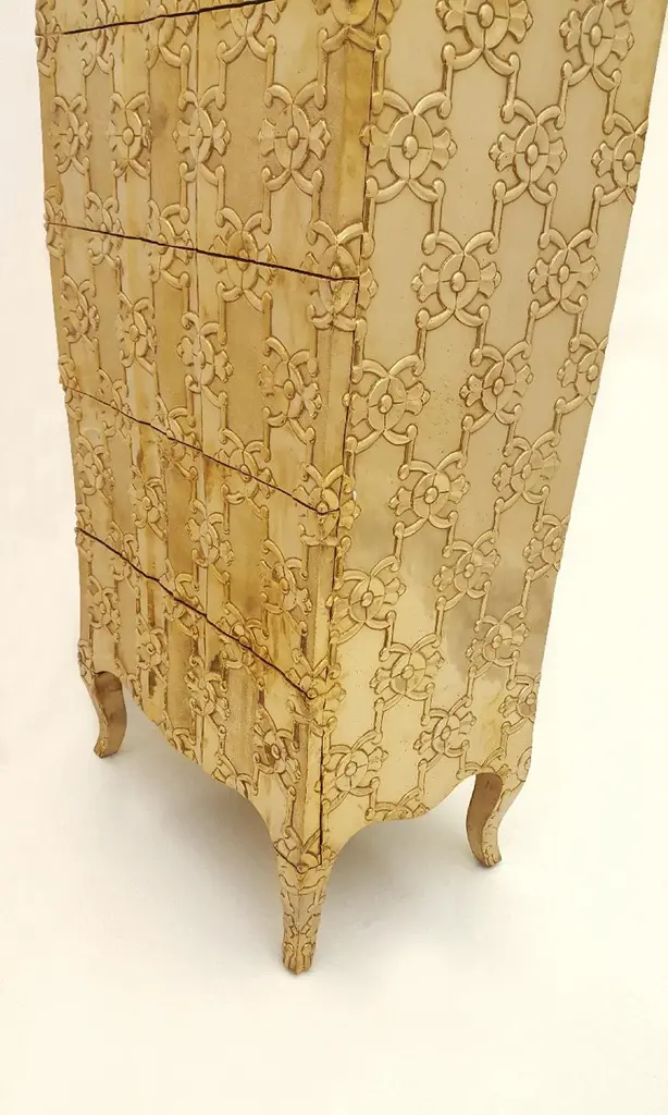 “Semainier” refers to a French piece of furniture with seven drawers (Fr. Semaine = week). It is part of the Louise Collection designed by renowned designer Paul Mathieu. A remarkable piece in which each of the exterior faces is entirely sculpted out of a solid piece of wood by hand, then covered with metal sheeting. The available options for metal cladding are brass, white bronze, antiqued bronze, silver and copper. Both silver and copper will tarnish over time. Regular non-abrasive household metal polishes can be used to restore the original finish. Crafted with utmost care and attention to detail, these Louise Semainier are made to order and are available in twelve metal clad finishes, ensuring that you can choose the perfect one to match your individual style and taste. The use of high-quality materials and expert craftsmanship ensure that each Art Deco Louise Semainier is not only beautiful but also a true piece of art.The curved legs and side arms of this Art Deco Louise Semainier are hand carved from solid pieces of teak. Pattern makers trace and cut complex forms that will cover the chair in a skin of copper, white bronze, brass or antiqued white bronze The metal finishes will tarnish over time. Regular non-abrasive household metal polishes can be used to restore the original luster.Overall, if you're looking for a piece of furniture that combines luxury, comfort, and style, then the Art Deco Louise Semainier is an excellent choice. With its distinctive curved profile and multiple finish options, this Chair set is sure to elevate the look of any room it is placed in, and be a beloved addition to your home for years to come.The images shown in this listing are shot in different lighting conditions and/or are 3D illustrations. We encourage our customers to please request a sample or a full sample set of 12 finishes so that they can experience the finish first hand. Louise Semainier Secretaires in Fine Hammered White Bronze by Paul Mathieu for Stephanie OdegardSize- 24"x 16"x 66"HMaterials - White Bronze, Metal sheet, Teak, Wood, MetalTechniques: Hand-Crafted, Hand-Carved, Metal Work, Wood Work, Metal Wrapping, PolishedPlease note that moisture in air, sudden change in temperature and natural movement of wood over time causes the metal to wrinkle or bubble up. We use well seasoned, reclaimed teak and high quality marine grade MDF (wherever technically possible) to avoid and delay the mentioned changes. However a perfect stability of metal cannot be guaranteed. Please note that our smooth finish metal clad pieces will have some unavoidable tool marks. This is proof that everything is done by hand. The smooth finish will not come out like a machine made perfect surface and the master artisan will do their best to make it look as good/clean/stable/perfect as he possibly can.The antique white bronze finish is hand done by using an acidic chemical over the white bronze finish to recreate a natural patination. Like with the natural patination of silver, copper, or brass, the final result and color uniformity of the patina cannot be guaranteed. The goal of this finish is to achieve rainbow-like shades with dull, shiny, cloudy, and streaky patches to give an illusion of antiquing. Please note:None of our metal clad pieces are treated with a protective “finish” thus enabling the items to age naturally over time. We will of course polish them well before we pack them. a) Copper oxidizes faster than the other metals. In six to twelve months it will most likely lose its shine and will gradually turn to different shades of brown and/or green/blue. This aging process and its effect is referred to as verdigris. After a year the piece should not change much more. Copper does not rust, but does require periodic cleaning in order to retain its original shine if that the preferred option. ('BRASSO' or any known copper polish can be used to polish copper).b) Brass retains its shine for far longer than others, but will tarnish if not cleaned on occasion. ('BRASSO' is made to polish brass).c) White bronze, has the least tendency to show age or tarnish. If kept in a controlled climate, this metal will hold its shine for years. It can be cleaned with a cleanser and polished with a cloth. d) The antiqued white bronze finish will react with the natural elements the fastest in the beginning but it too will stop reacting and will settle down in a stable state like copper after 6-12 months. Since it is already antiqued and looked like it is tarnished, as described in an earlier message, this fast reaction will not change the over all look. In that way this surface is most forgiving. The images shown in this listing are shot in different lighting conditions and/or are 3D illustrations. We encourage our customers to please request a sample or a full sample set of 12 finishes so that they can experience the finish first hand.