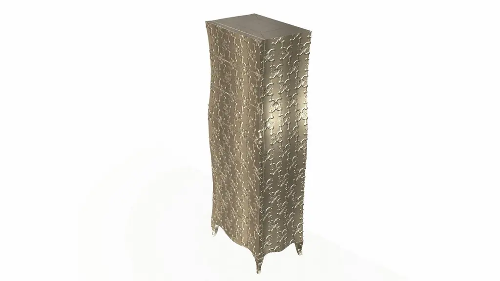 “Semainier” refers to a French piece of furniture with seven drawers (Fr. Semaine = week). It is part of the Louise Collection designed by renowned designer Paul Mathieu. A remarkable piece in which each of the exterior faces is entirely sculpted out of a solid piece of wood by hand, then covered with metal sheeting. The available options for metal cladding are brass, white bronze, antiqued bronze, silver and copper. Both silver and copper will tarnish over time. Regular non-abrasive household metal polishes can be used to restore the original finish. Crafted with utmost care and attention to detail, these Louise Semainier are made to order and are available in twelve metal clad finishes, ensuring that you can choose the perfect one to match your individual style and taste. The use of high-quality materials and expert craftsmanship ensure that each Art Deco Louise Semainier is not only beautiful but also a true piece of art.The curved legs and side arms of this Art Deco Louise Semainier are hand carved from solid pieces of teak. Pattern makers trace and cut complex forms that will cover the chair in a skin of copper, white bronze, brass or antiqued white bronze The metal finishes will tarnish over time. Regular non-abrasive household metal polishes can be used to restore the original luster.Overall, if you're looking for a piece of furniture that combines luxury, comfort, and style, then the Art Deco Louise Semainier is an excellent choice. With its distinctive curved profile and multiple finish options, this Chair set is sure to elevate the look of any room it is placed in, and be a beloved addition to your home for years to come.The images shown in this listing are shot in different lighting conditions and/or are 3D illustrations. We encourage our customers to please request a sample or a full sample set of 12 finishes so that they can experience the finish first hand. Louise Semainier Secretaires in Mid. Hammered Brass by Paul Mathieu for Stephanie OdegardSize- 24"x 16"x 66"HMaterials - Antique White Bronze, Metal sheet, Teak, Wood, MetalTechniques: Hand-Crafted, Hand-Carved, Metal Work, Wood Work, Metal Wrapping, PolishedPlease note that moisture in air, sudden change in temperature and natural movement of wood over time causes the metal to wrinkle or bubble up. We use well seasoned, reclaimed teak and high quality marine grade MDF (wherever technically possible) to avoid and delay the mentioned changes. However a perfect stability of metal cannot be guaranteed. Please note that our smooth finish metal clad pieces will have some unavoidable tool marks. This is proof that everything is done by hand. The smooth finish will not come out like a machine made perfect surface and the master artisan will do their best to make it look as good/clean/stable/perfect as he possibly can.The antique white bronze finish is hand done by using an acidic chemical over the white bronze finish to recreate a natural patination. Like with the natural patination of silver, copper, or brass, the final result and color uniformity of the patina cannot be guaranteed. The goal of this finish is to achieve rainbow-like shades with dull, shiny, cloudy, and streaky patches to give an illusion of antiquing. Please note:None of our metal clad pieces are treated with a protective “finish” thus enabling the items to age naturally over time. We will of course polish them well before we pack them. a) Copper oxidizes faster than the other metals. In six to twelve months it will most likely lose its shine and will gradually turn to different shades of brown and/or green/blue. This aging process and its effect is referred to as verdigris. After a year the piece should not change much more. Copper does not rust, but does require periodic cleaning in order to retain its original shine if that the preferred option. ('BRASSO' or any known copper polish can be used to polish copper).b) Brass retains its shine for far longer than others, but will tarnish if not cleaned on occasion. ('BRASSO' is made to polish brass).c) White bronze, has the least tendency to show age or tarnish. If kept in a controlled climate, this metal will hold its shine for years. It can be cleaned with a cleanser and polished with a cloth. d) The antiqued white bronze finish will react with the natural elements the fastest in the beginning but it too will stop reacting and will settle down in a stable state like copper after 6-12 months. Since it is already antiqued and looked like it is tarnished, as described in an earlier message, this fast reaction will not change the over all look. In that way this surface is most forgiving. The images shown in this listing are shot in different lighting conditions and/or are 3D illustrations. We encourage our customers to please request a sample or a full sample set of 12 finishes so that they can experience the finish first hand.