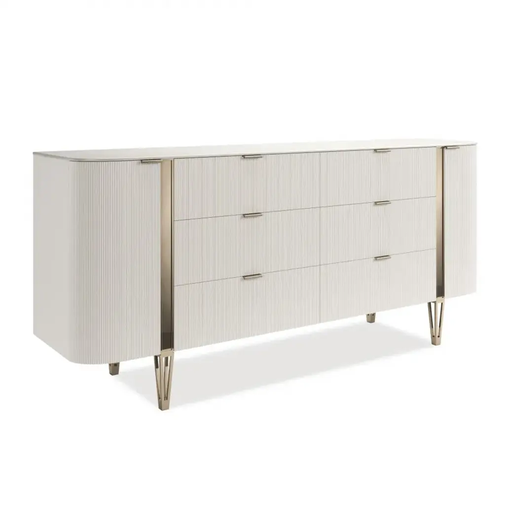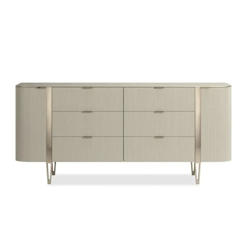 Love At First Sight has been elongated to 78 inches with two end doors with interior shelves and six center drawers. It glows in a full-covering of gleaming Oracle gold that accentuates the exquisite reeding on the drawer fronts with Whisper of Gold metal band detailing and designer legs. The piece has a gracefully rounded rectangular profile that is now dazzling in its design. The nine drawers are felt-lined with under-mount guides.