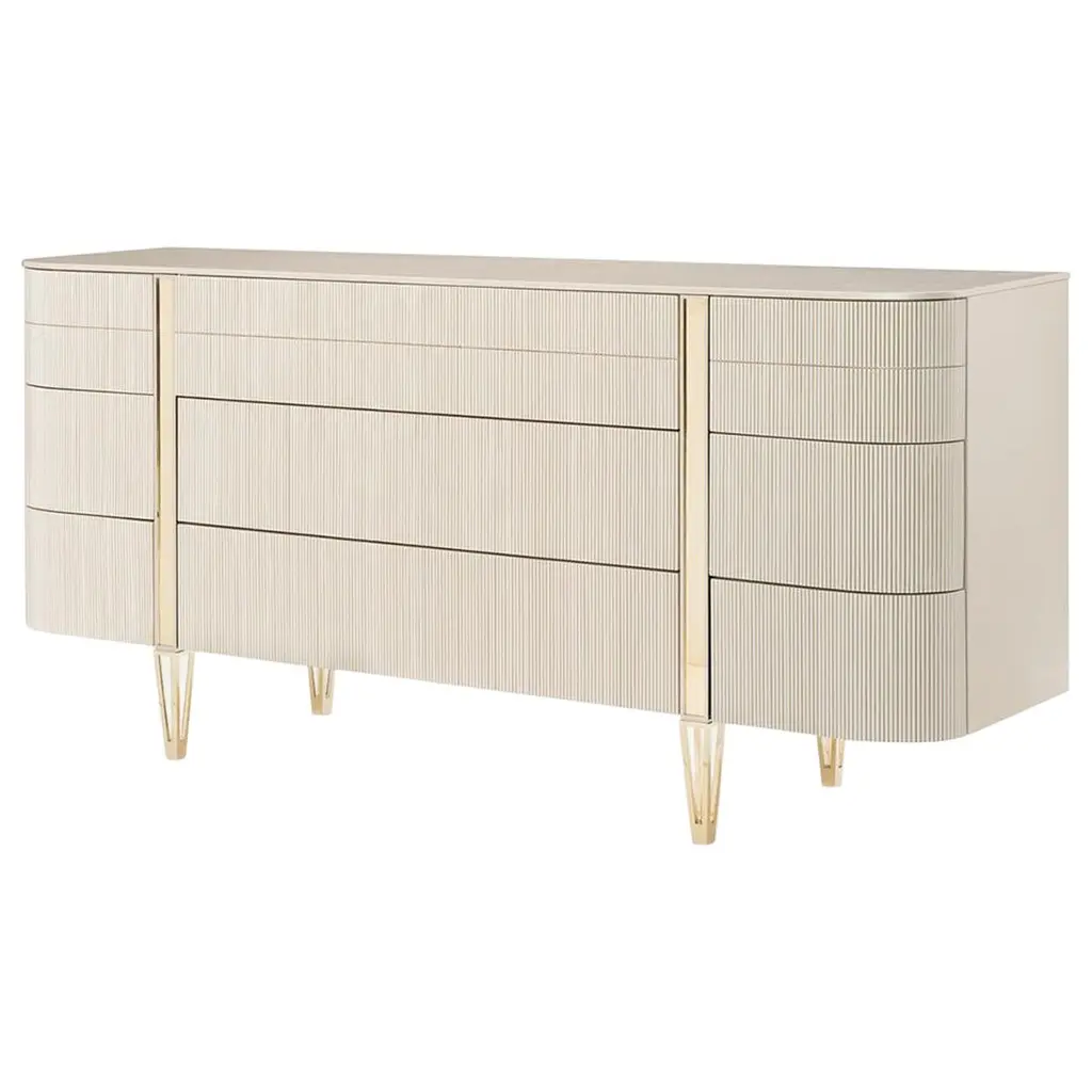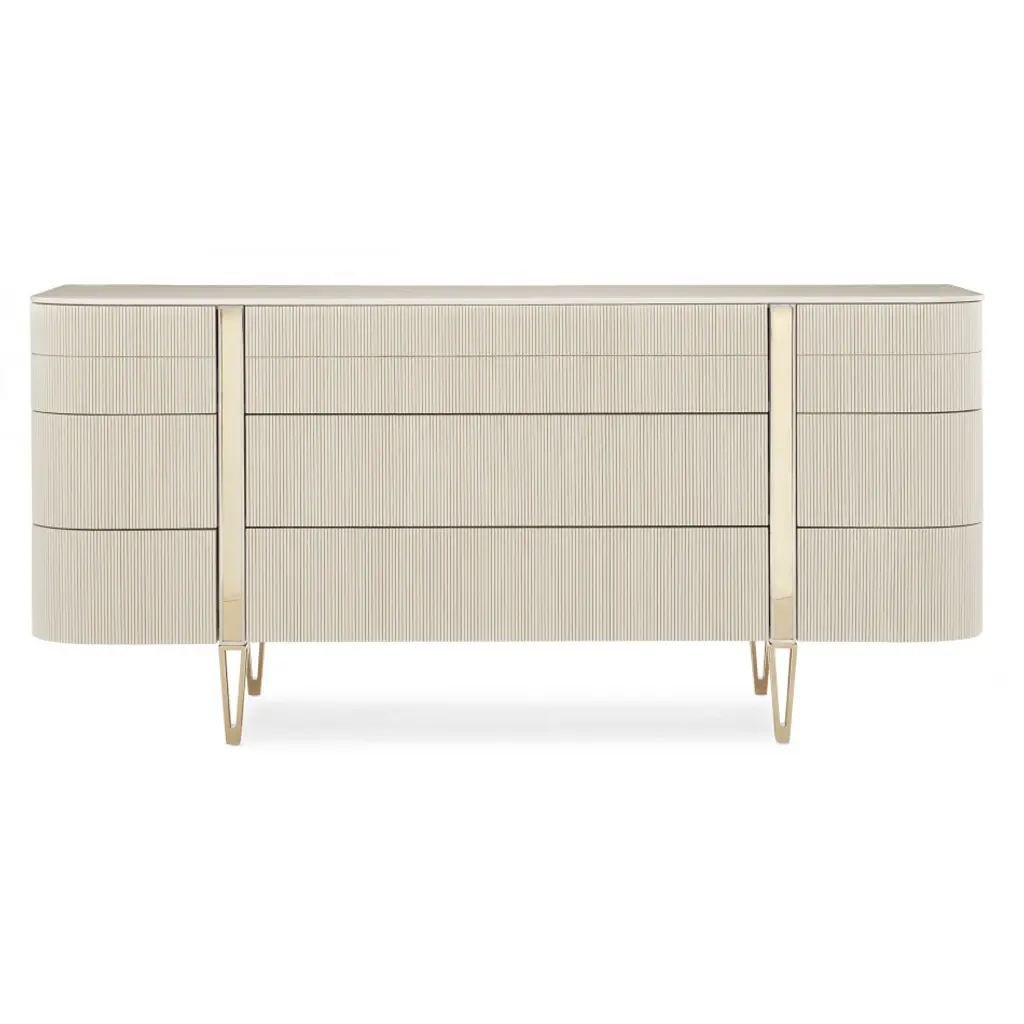 As rare as Love at First Sight, you’re sure to find this dazzling dresser is a dream come true. Representing the ultimate combination of form and function, it creates a space worthy of your finest clothing. All drawers are completely finished and wear Matte Pearl. The gracefully rounded profile of its fashion-forward design adds visual appeal to any space and is accentuated with exquisite fluted drawer fronts, metal band detailing, designer legs, and a sophisticated finish palette of Whisper of Gold and Matte Pearl.