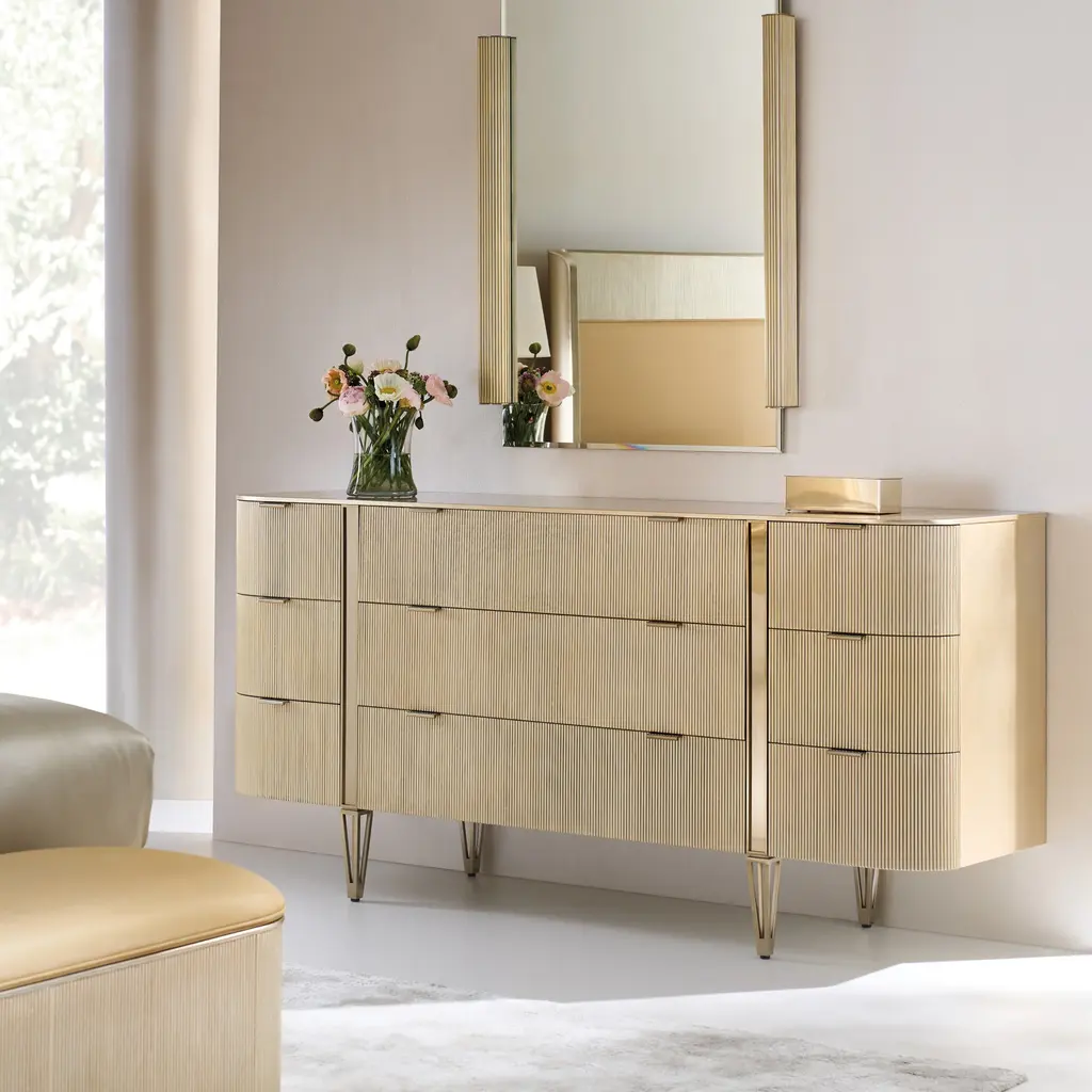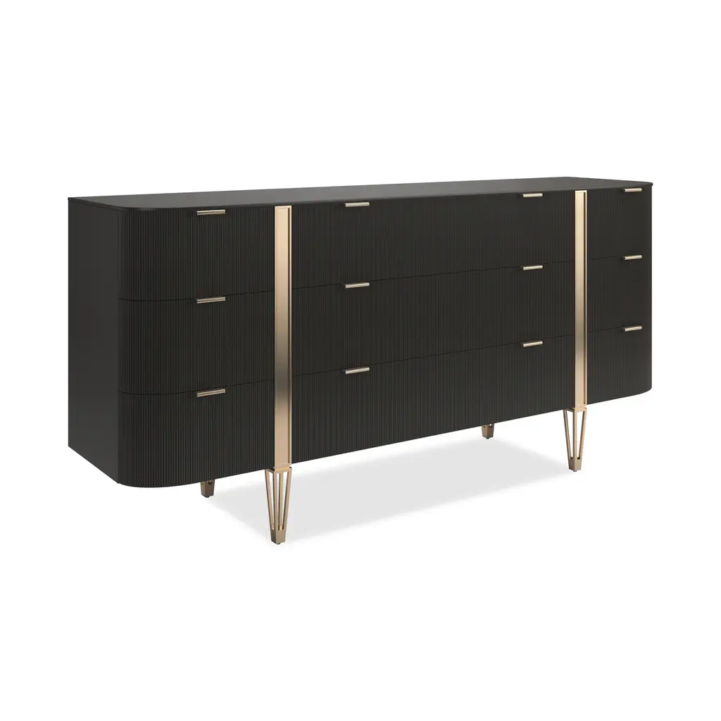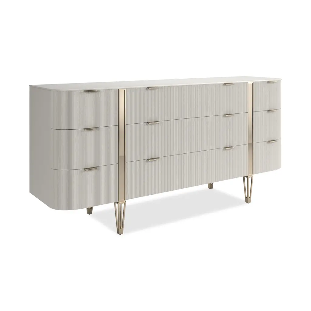 Embrace elegance and sophistication with the Love At First Sight Dresser with Handle Pull from Caracole. Its gracefully rounded rectangular profile exudes luxury and its dazzling design will catch your eye. The nine felt-lined drawers, with under-mount guides, provide both style and functionality. Upgrade your space with this timeless piece. Highlights