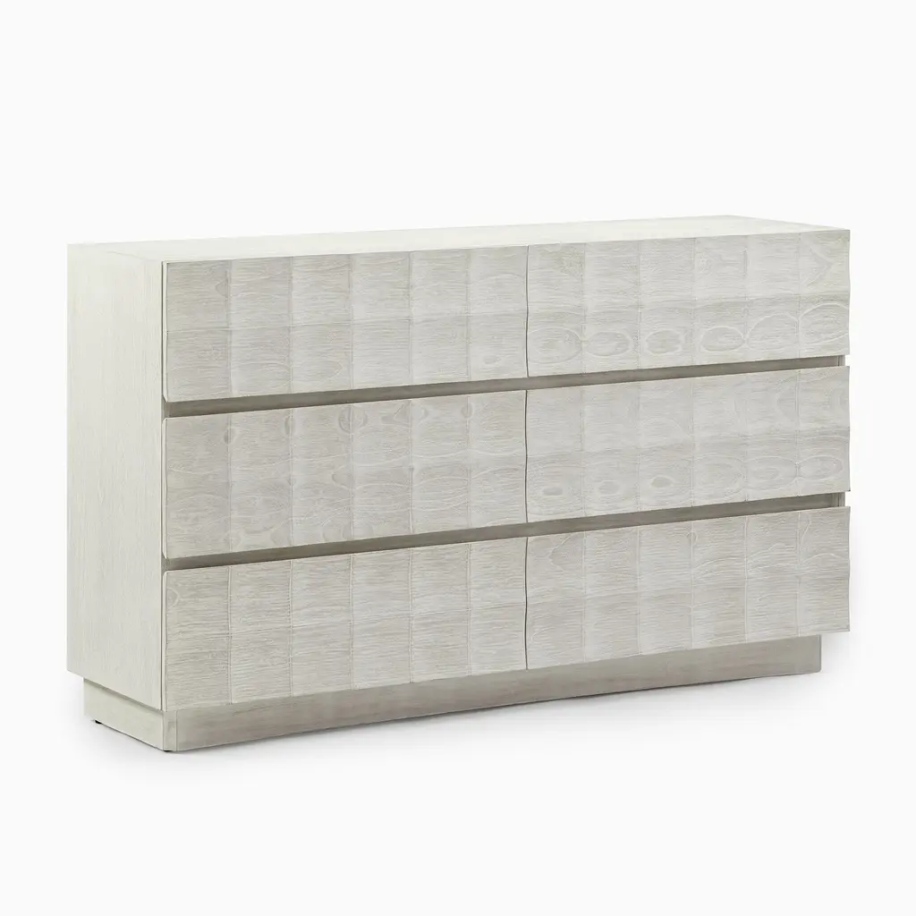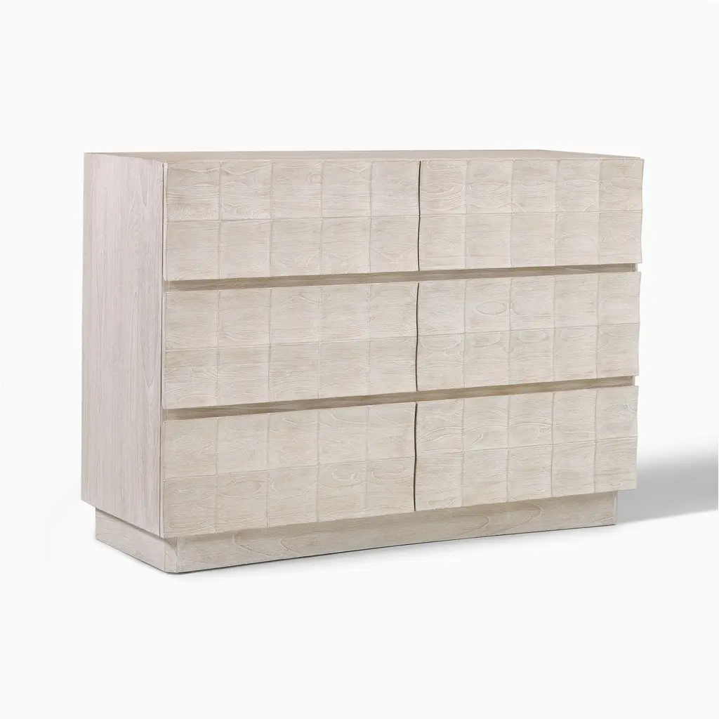 Eye-catching look reads both rustic and glamorous. Carved front adds organic texture to your space. Made from extra durable, kiln-dried wood. Six roomy drawers store clothes and linens.