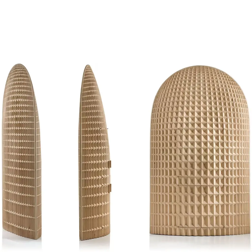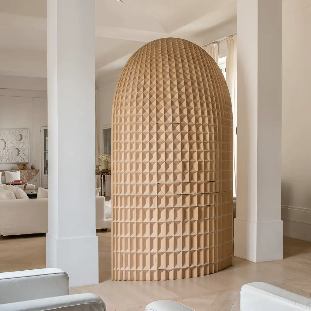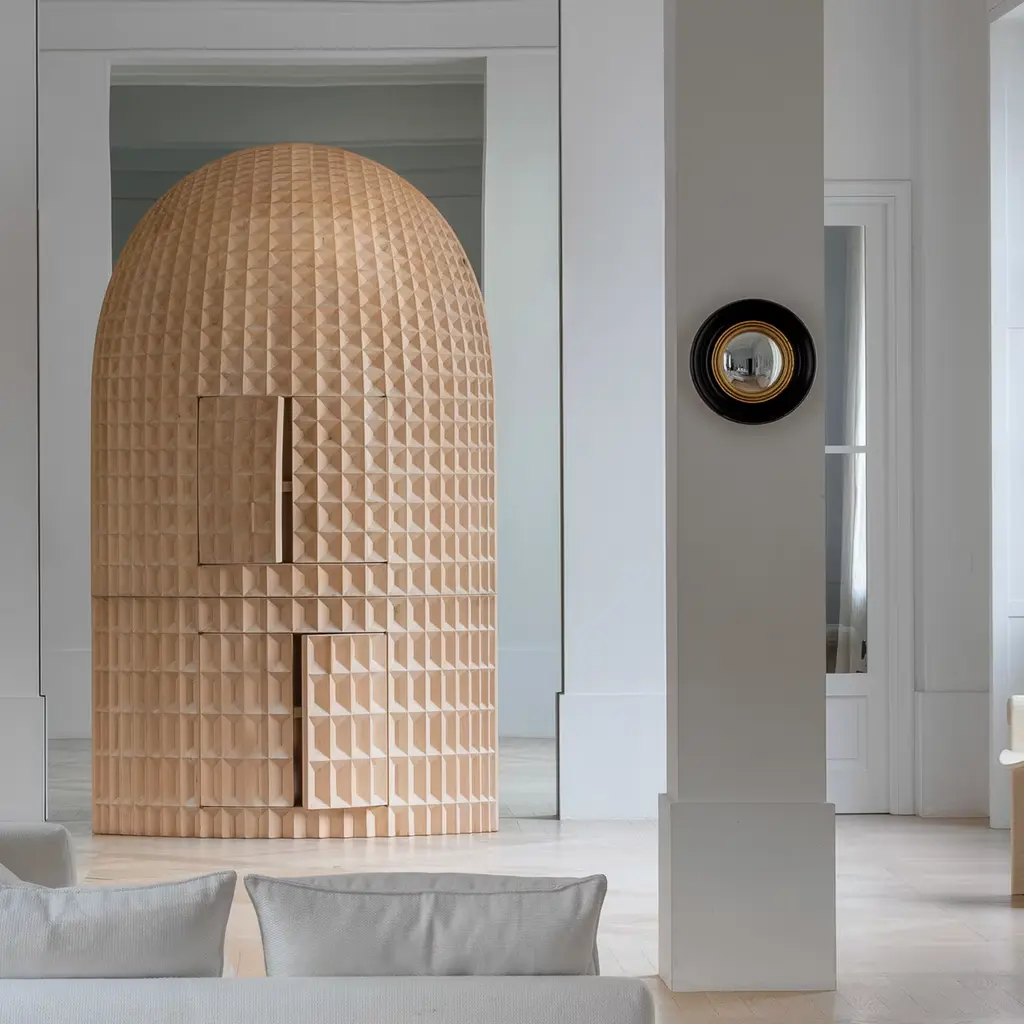 A stately accent to a contemporary interior, this four-door chest is made of a solid block of lime wood, hand-finished in full relief with a chisel. The striking effect of the geometrical pattern of the decoration complements the gentle silhouette. Please inquire with the Concierge for further information on possible customization options.
