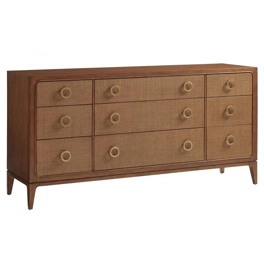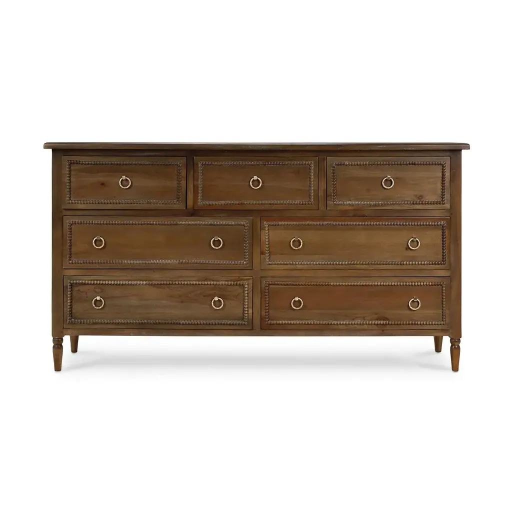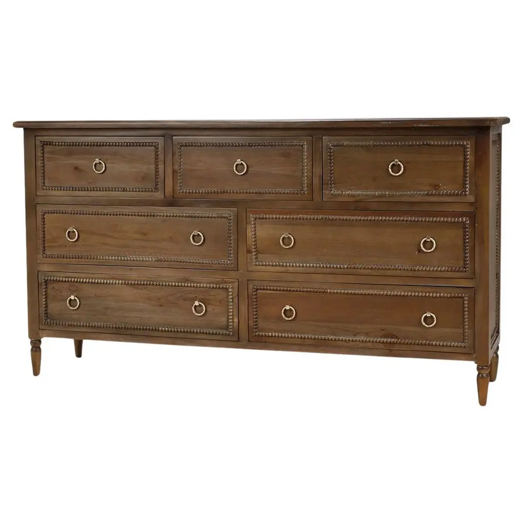 (A newly made reproduction) This beautifully crafted piece features a warm straw wash that complements any decor style. The delicate ring pulls add a hint of sophistication, making this chest a perfect addition to both traditional and contemporary interiors. With seven spacious drawers, this reproduction antique-style dresser provides ample storage for your clothes, accessories, and essentials, keeping them neatly organized. Perfect for bedrooms, living rooms, or hallways, this chest combines functionality with classic style. Enhance your home decor with this stunning commode that effortlessly blends elegance and practicality. Dimensions: 72" W x 18" D x 39" H