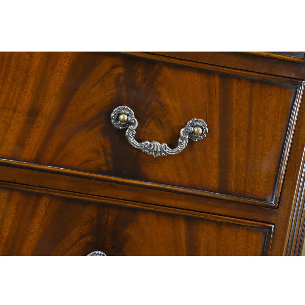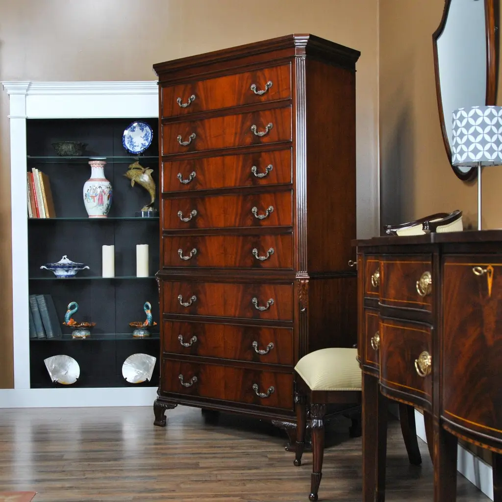 The Mahogany Chippendale Tall Chest will become the centerpiece of any room. Inspired by Chippendale design the two part construction lends elegance to any setting. Resting on hand carved, solid mahogany feet the eight drawers soar upwards to provide maximum storage and visual appeal. Matched by a number of other case pieces in our collection this Mahogany Chippendale Chest on Chest can either be used alone as a focal point in any setting or can be matched with other items to create an entire room setting. Measures 42?w x 21?d x 77?h metric: 107 x 196 x 53.