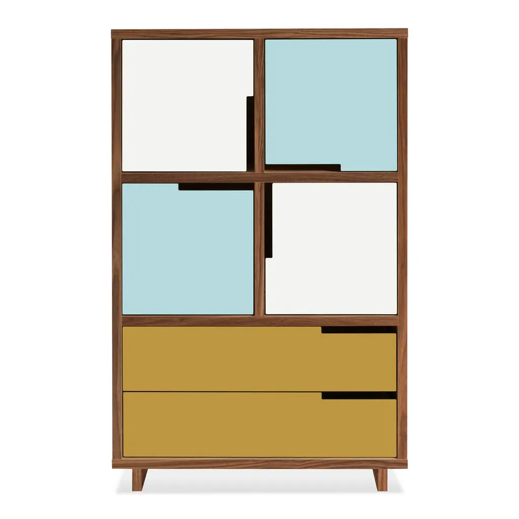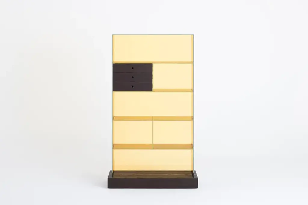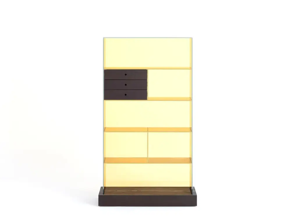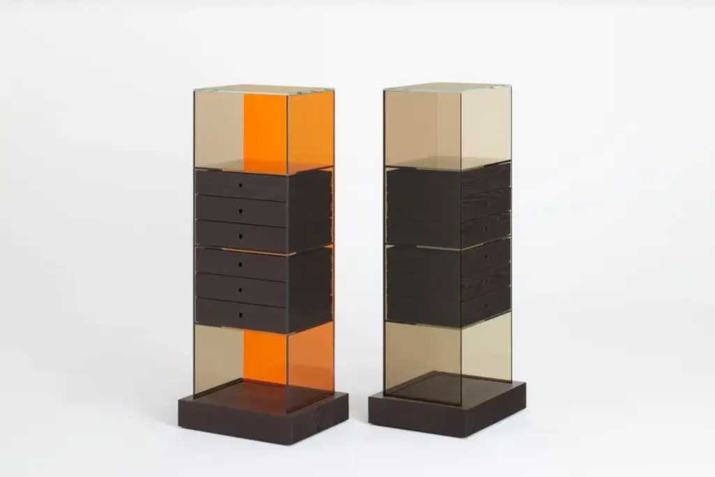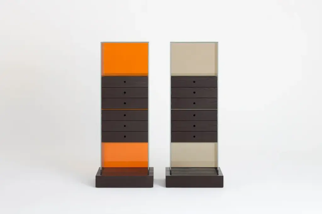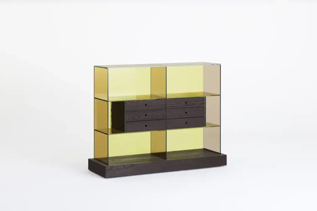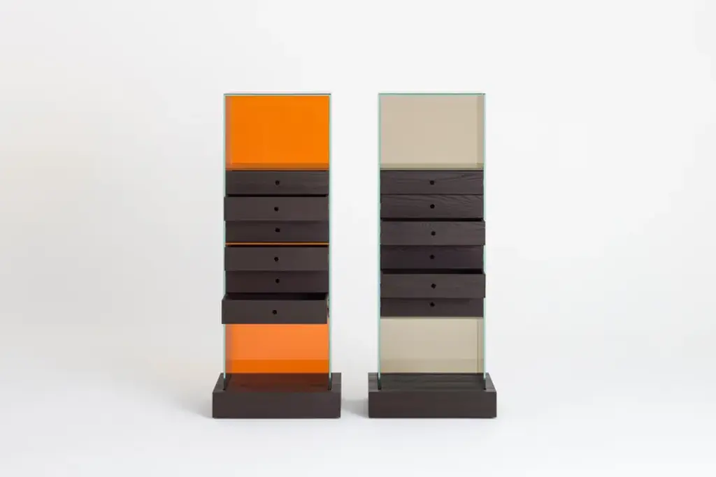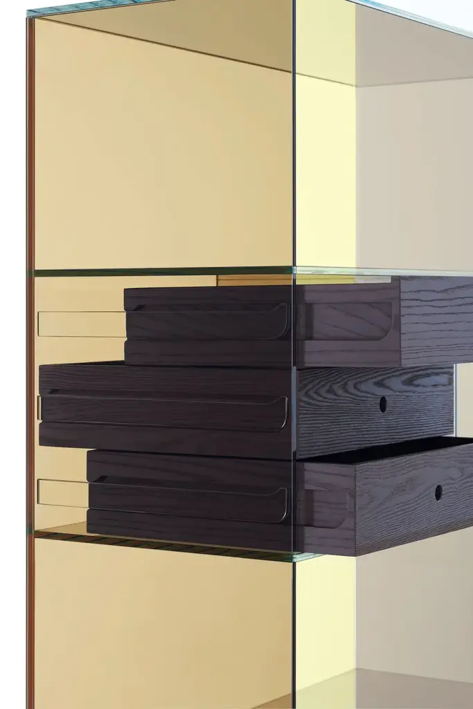 Series of glass chest of drawers with structure in transparent colored laminated glass, UV- bonded with base and drawers in naturally darkened solid ash created with a heat treatment.Extralight glass strips, glued to the sides of the furniture, act as “invisible” runners for the drawers - left completely visible - thanks to lowered grooves on the sides.The results are objects with a refined technical solution, a high aesthetic and formal value. Available in monochromatic glass or a version with the back in a different color. Under the base there are wheels allowing easy movement.
