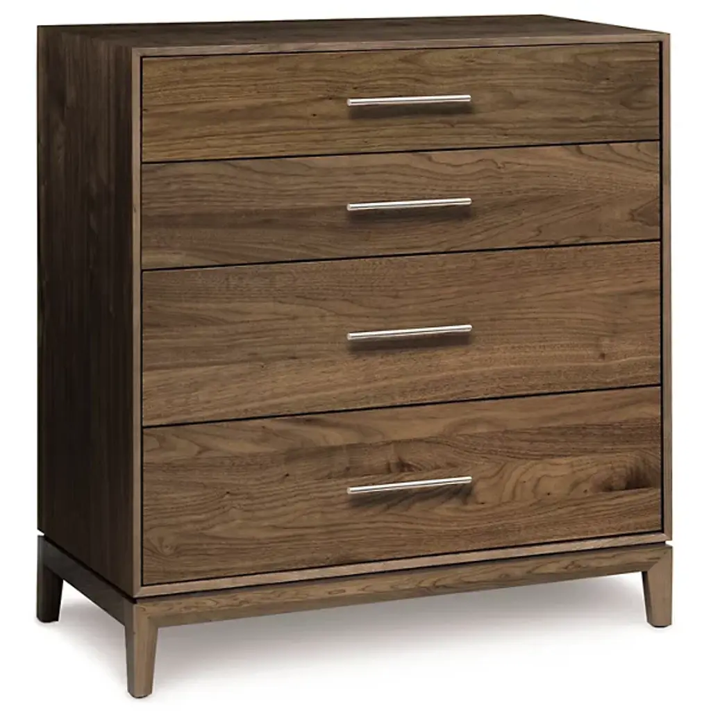 Durable design and resilient fashion. With a timeless essence and enduring materials, the Copeland Furniture Mansfield 4 Drawer Dresser looks beautiful while redefining the usefulness of your bedroom space. With 4 drawers offering 2 different options for size, the piece makes plenty of room for clothes and accessories. Using Solid Hardwood, the design allows for slender lines and spacious compartments throughout the piece, all without sacrificing any of the structural integrity. Made by hand in Vermont, this dresser combines elements of traditional craftsmanship and innovative design, with full-extension drawers that gently self-close. Sized to make excellent use of space and built to exhibit lasting aesthetic appeal, this unit ups the style in any living space.