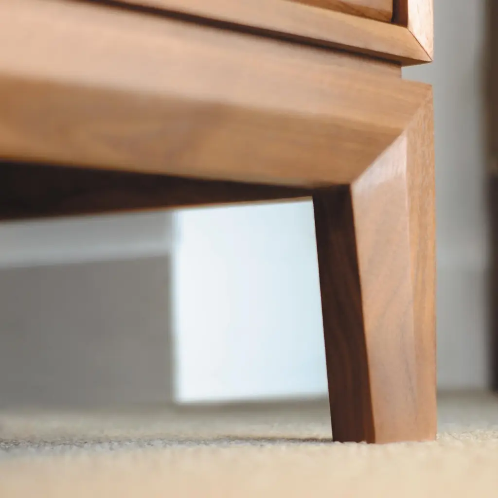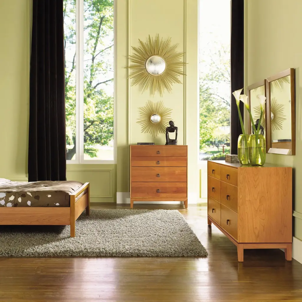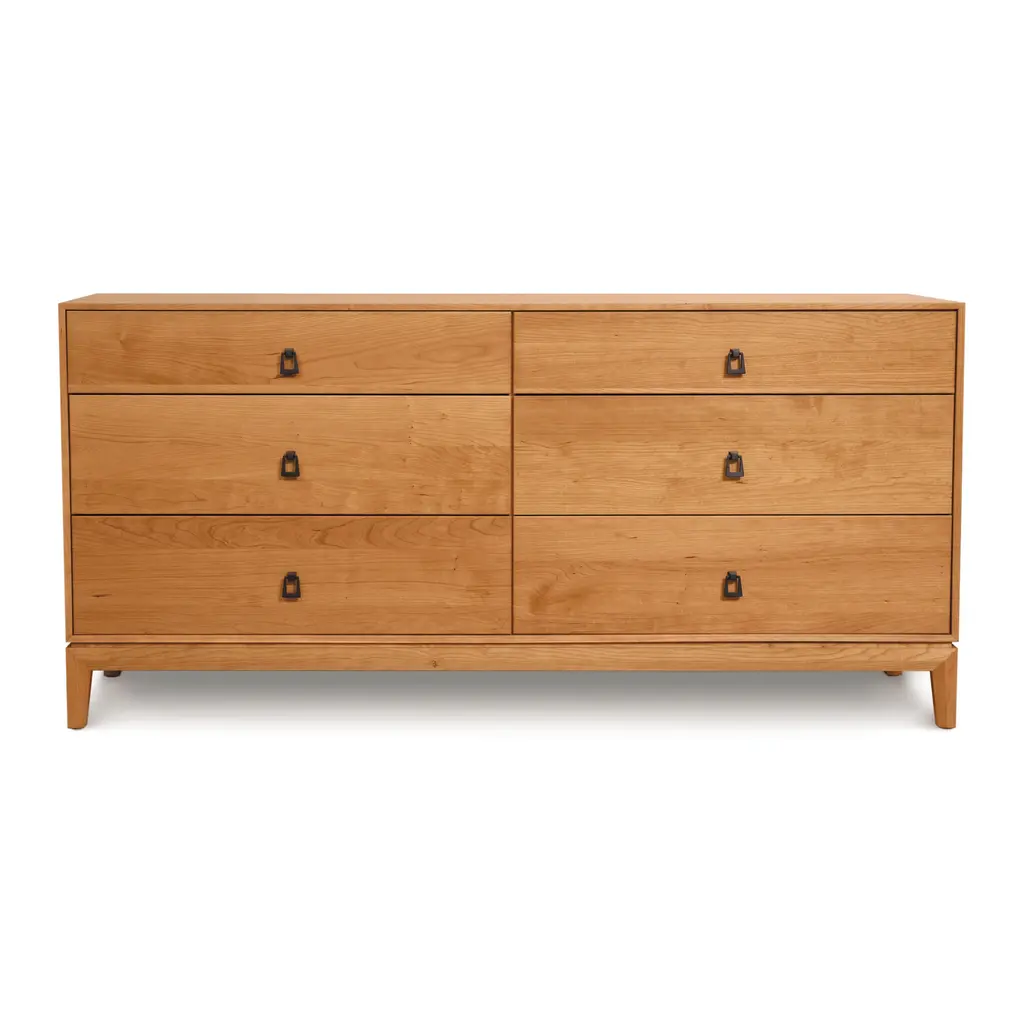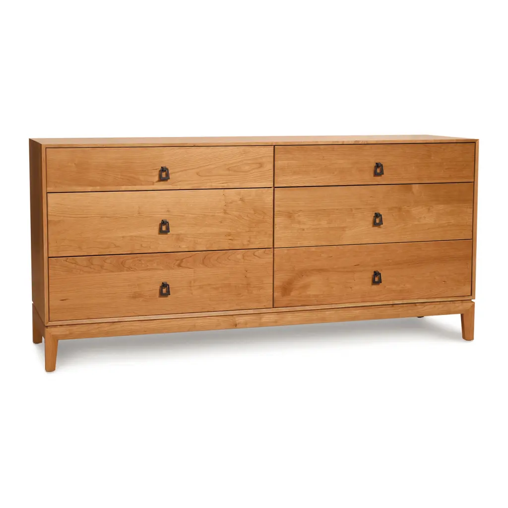 Elevate your bedroom storage potential with the Mansfield 6 Drawer Dresser from Copeland Furniture. The mitered frames and black bronze ring pulls add visual interest and highlight the solid construction. Handcrafted in solid cherry or walnut, this dresser exudes luxury and can be customized with a selection of knob or pull options. Transform your space with this unconventional yet elegant piece. Highlights