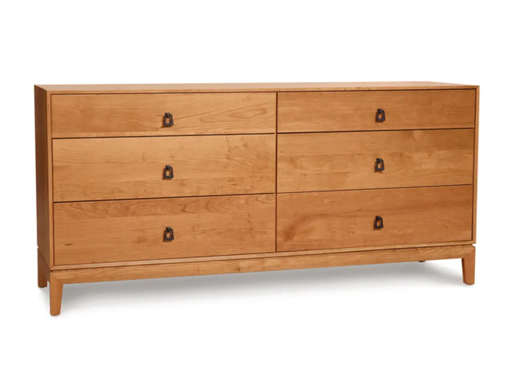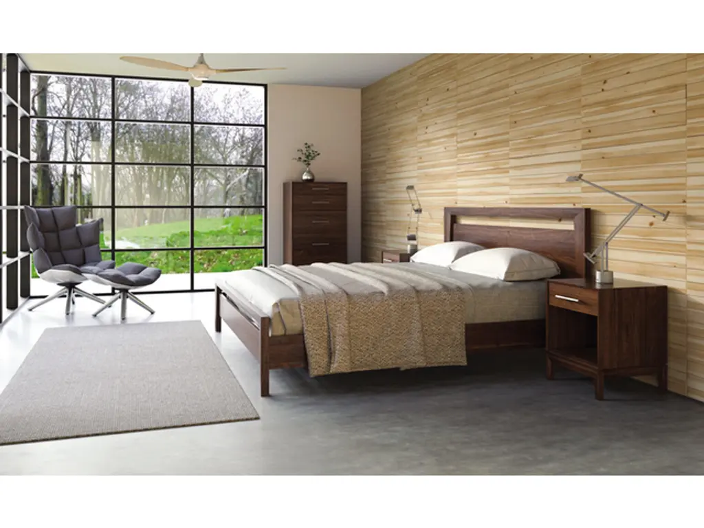 The Mansfield Bedroom represents a striking combination of the familiar and the unconventional. Mitered frames support the cases producing complex facets that create visual interest and highlight the collection’s solid construction. The bed is low and sleek, designed for a mattress only. It is perfectly complemented by a selection of case pieces. The Mansfield Bedroom is crafted in solid walnut and Made to Order with a variety of knob or pull options. Mansfield Double Dresser Space, style and function are the three main themes expressed in the Mansfield storage bed. With 4, eight inch deep, sub-mounted drawers, the bed provides plenty of inconspicuous storage, allowing for a roomier living environment. The optional nightstands, also crafted in solid cherry are designed to allow easy access to the storage drawers. Skilled craftspeople attend to each piece of Copeland furniture, ensuring that the joinery is solid, surfaces aresanded smooth, and the finish is exquisite. Perfect dovetail cuts, edge shapes, hole drills and other intricate processes are executed with computer numerically controlled (CNC) machining centers. Copeland craftspeople combine this state-of-the-art technology with traditional woodworking techniques to turn out the highest quality joinery, case construction, and finishing. Your Copeland furniture will be enjoyed for generations. Asymmetrical English dovetails – the traditional gold standard in joinery – are used in drawer construction. Drawer bottoms are “jet welded” firmly in place adding to overall rigidity while minimizing vibration and rattling. Drawer box interiors are sanded smooth and fully finished. Glides are adjustable to keep proper alignment and guarantee proper function in any climate. Pivot stops prevent drawers from being pulled out of the case Self-locking dovetail joints are used from cross rails, keeping them from separating from side panels and adding to strength. Solid hardwood interior corner blocks stabilize bed, case, table and chair legs. Bed side rails are joined to the headboard and footboard with a rigid inserted bolt. Case backs are made of selected veneer panels are Copeland Furniture continues to manufacture 100% in the United States. The challenges of domestic manufacturing require that we embrace state-of-the-art manufacturing whenever possible. This has helped us remain competitive and results in a superior product.