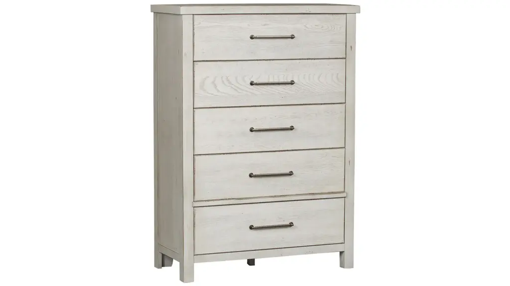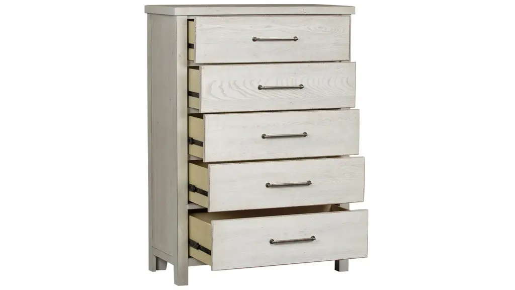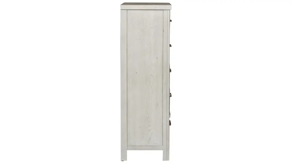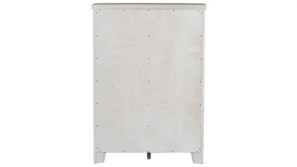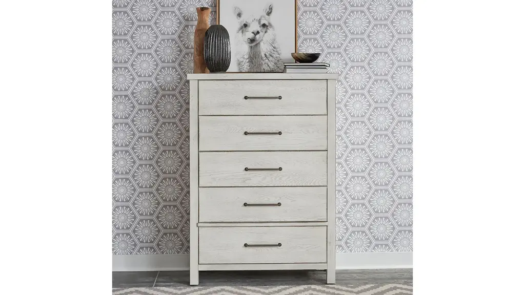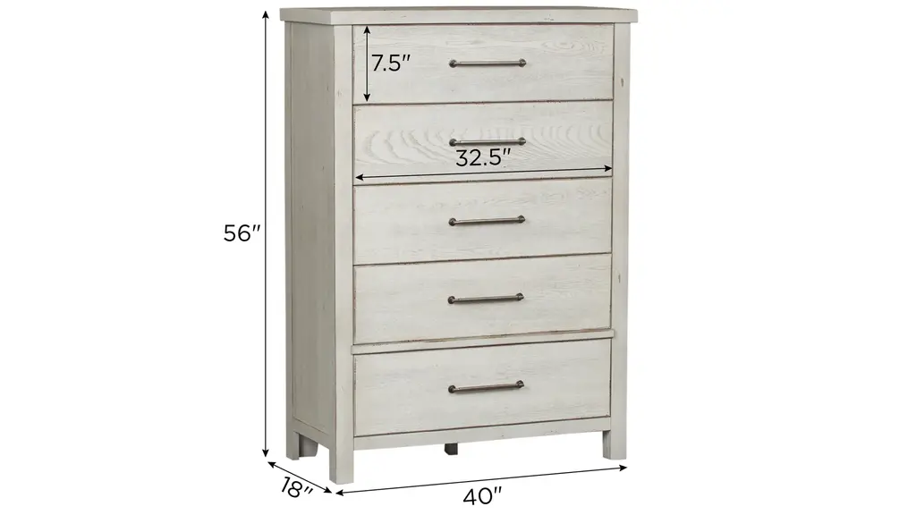 Create an inviting space with the Marguerite 5-drawer Chest. Crafted with poplar solids and knotty white oak veneers, this piece features bottom case dust proofing, cedar lined bottom drawers, fully stained interior drawers and premium felt lined top drawers. The flea market white finish with heavy distressing accompanied by washed brass elongated bar pull hardware offers a neutral palette of finish and adds texture to any space.