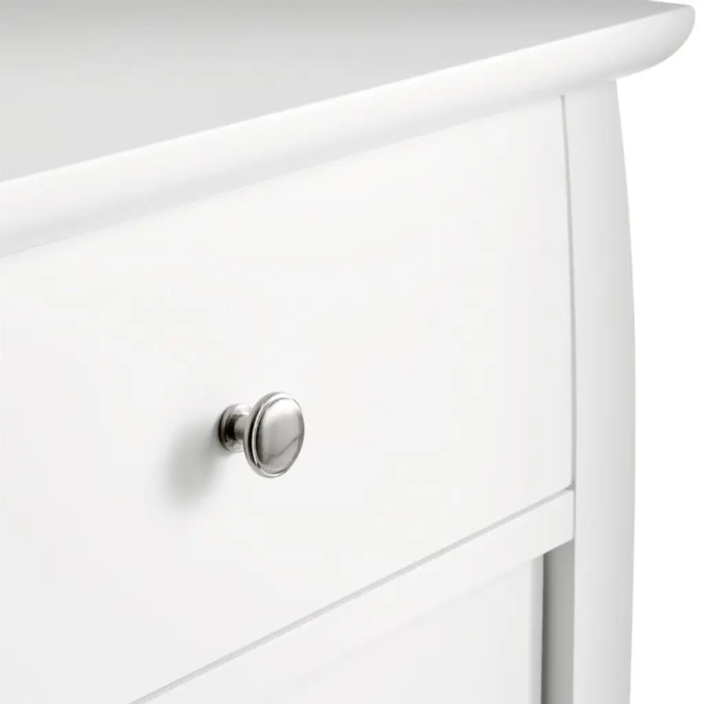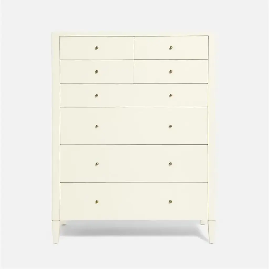 The Mason five-drawer dresser balances clean lines with a fresh white finish while delivering plenty of room for bedroom storage. The chest sits high on legs that take a turn with tradition, flowing right into the frame and curving in at the top.
