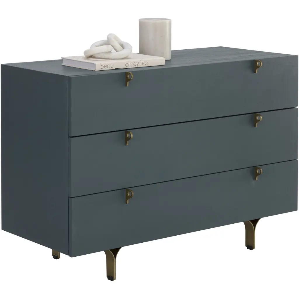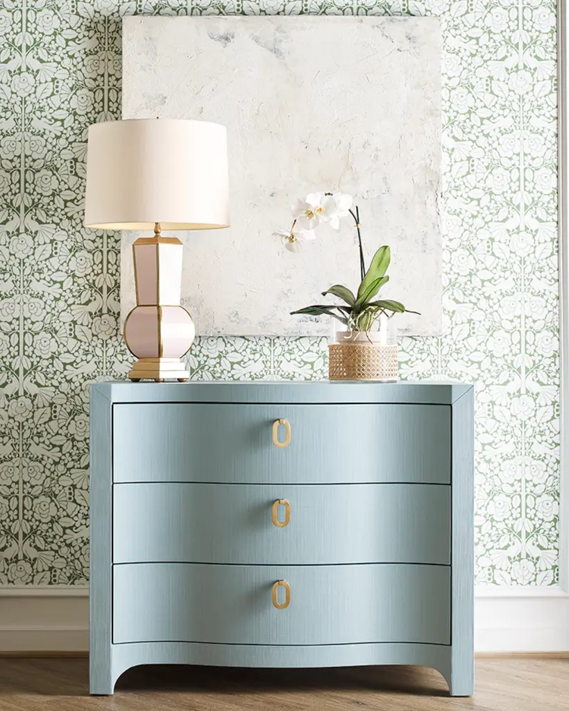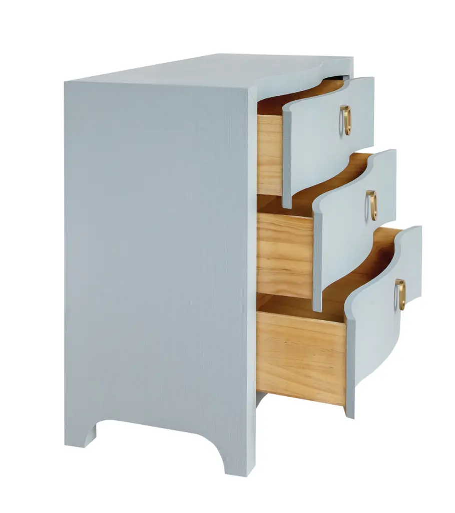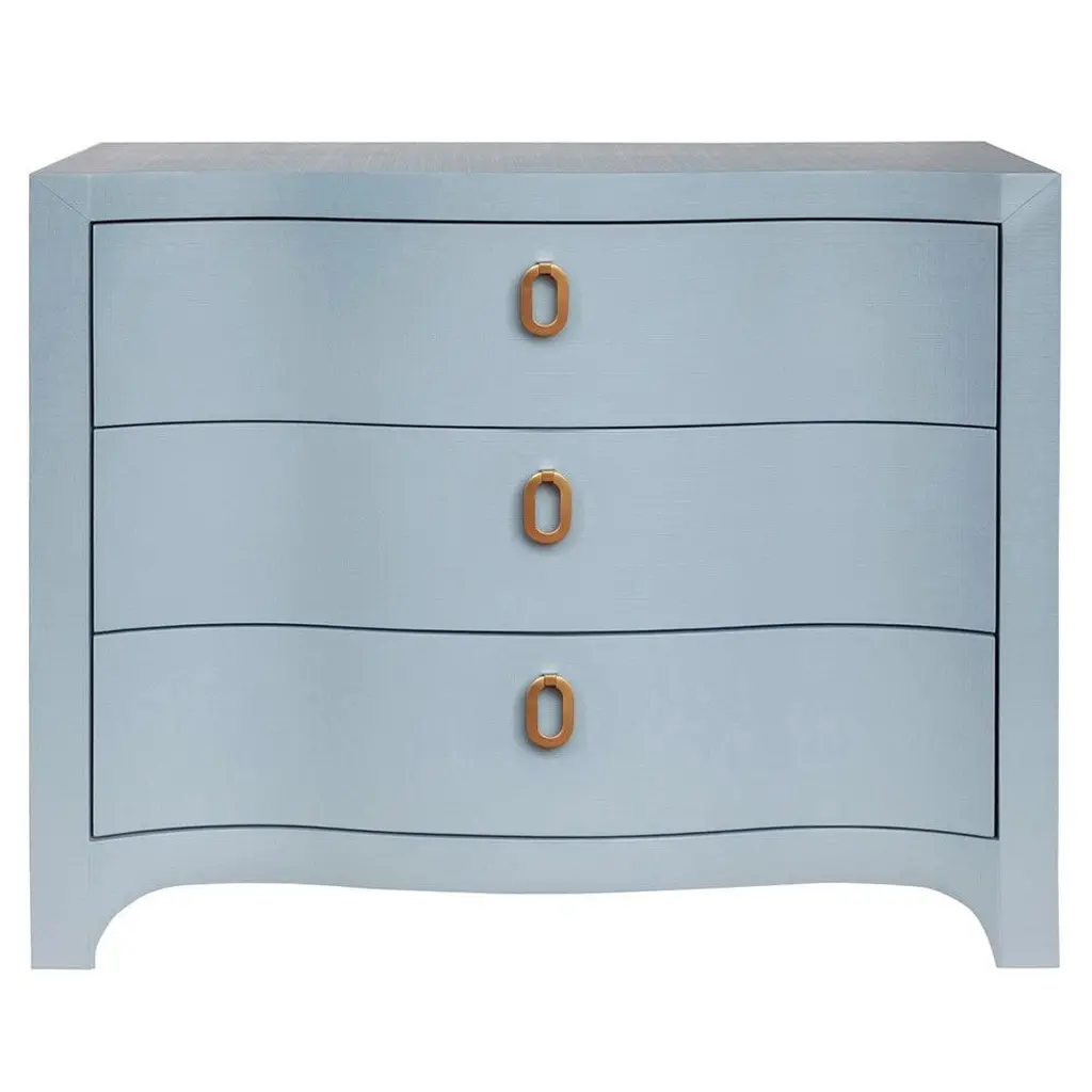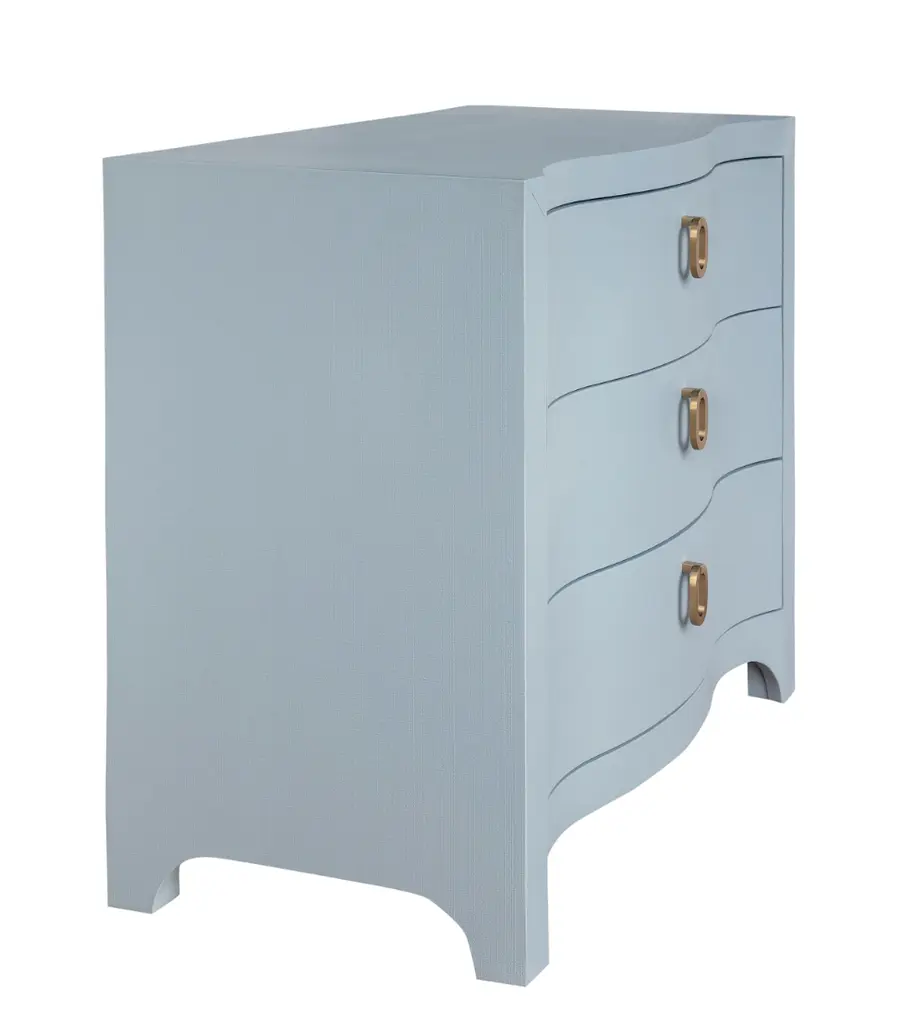 Matthew Izzo Home - Cora Light Blue Three Drawer, Textured Linen, Curved Front Chest With Brass Drawer Pulls