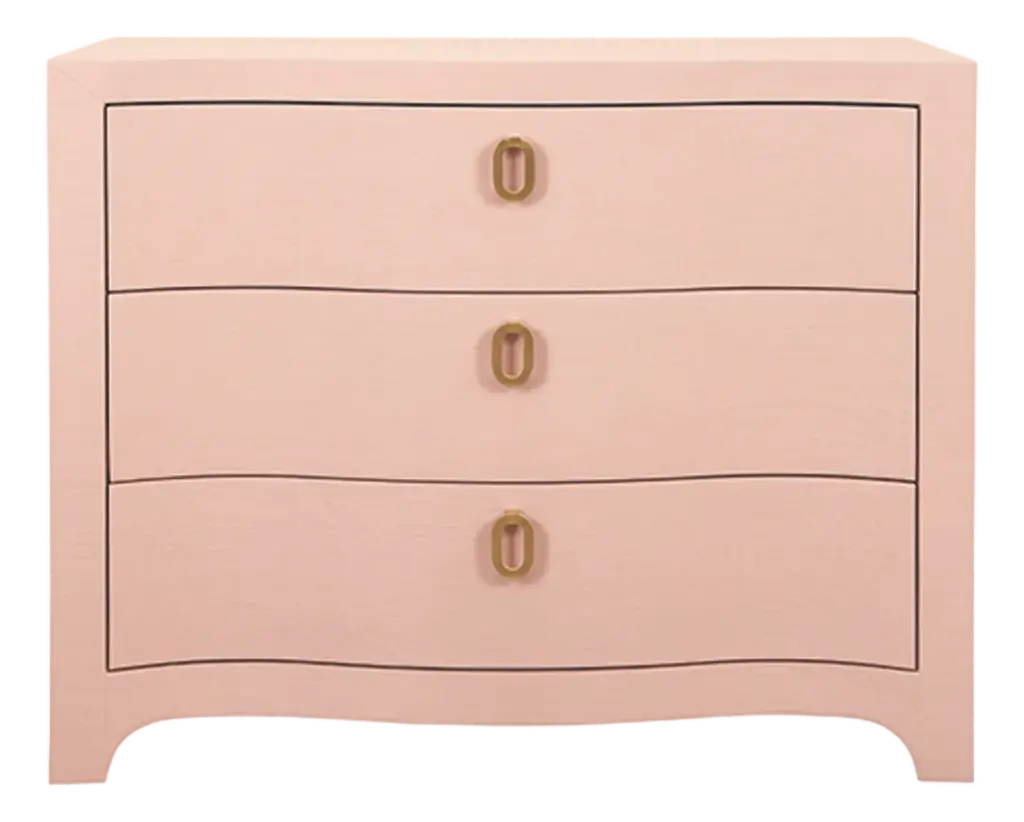 New item. Not vintage. Embrace coastal chic elegance with the Cora LB chest! This exquisite curved-front chest features three drawers equipped with soft close glides, ensuring a harmonious fusion of functionality and sophistication. Three satin brass ring pulls adorn the chest like jewels. Wrapped in a luxurious light blue texture linen or white textured linen, the Cora creates a symphony of dimension and elegance. Let the Cora’s coastal charm transform your home into a sanctuary of refined coastal bliss and relaxed luxury. 42" W X 34" H X 20" D Width:42.00" Height:34.00" Depth:20.00"