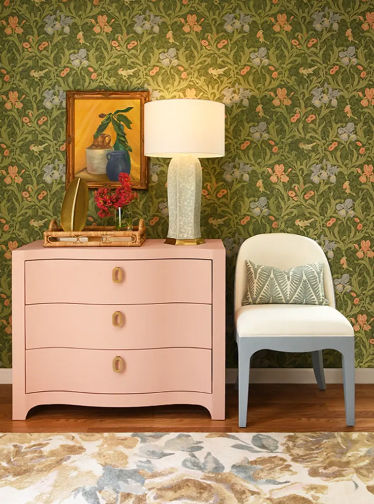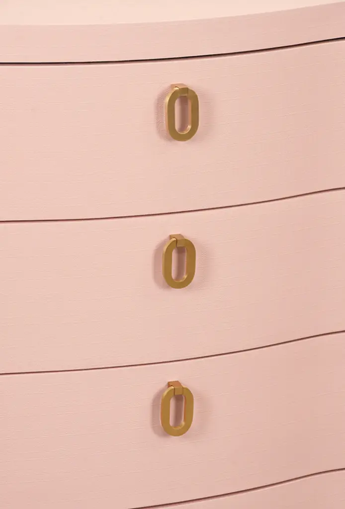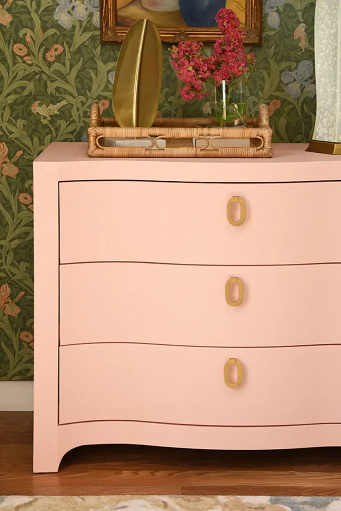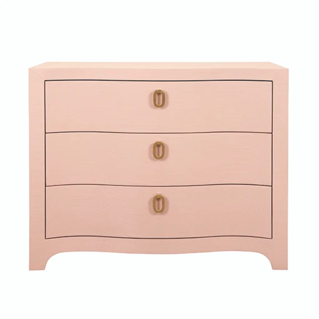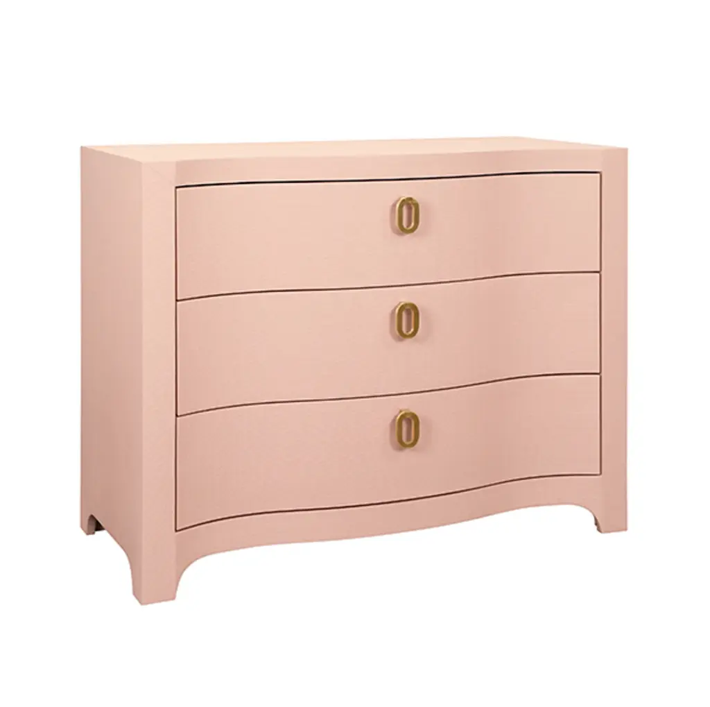 Brand new item. Not vintage. Embrace coastal chic elegance with the Cora LB chest! This exquisite curved-front chest features three drawers equipped with soft close glides, ensuring a harmonious fusion of functionality and sophistication. Three satin brass ring pulls adorn the chest like jewels. Wrapped in a luxurious pink textured linen, the Cora creates a symphony of dimension and elegance. Let the Cora’s coastal charm transform your home into a sanctuary of refined coastal bliss and relaxed luxury. 42" W X 34" H X 20" D Width:42.00" Height:34.00" Depth:20.00"