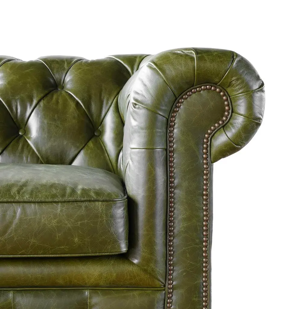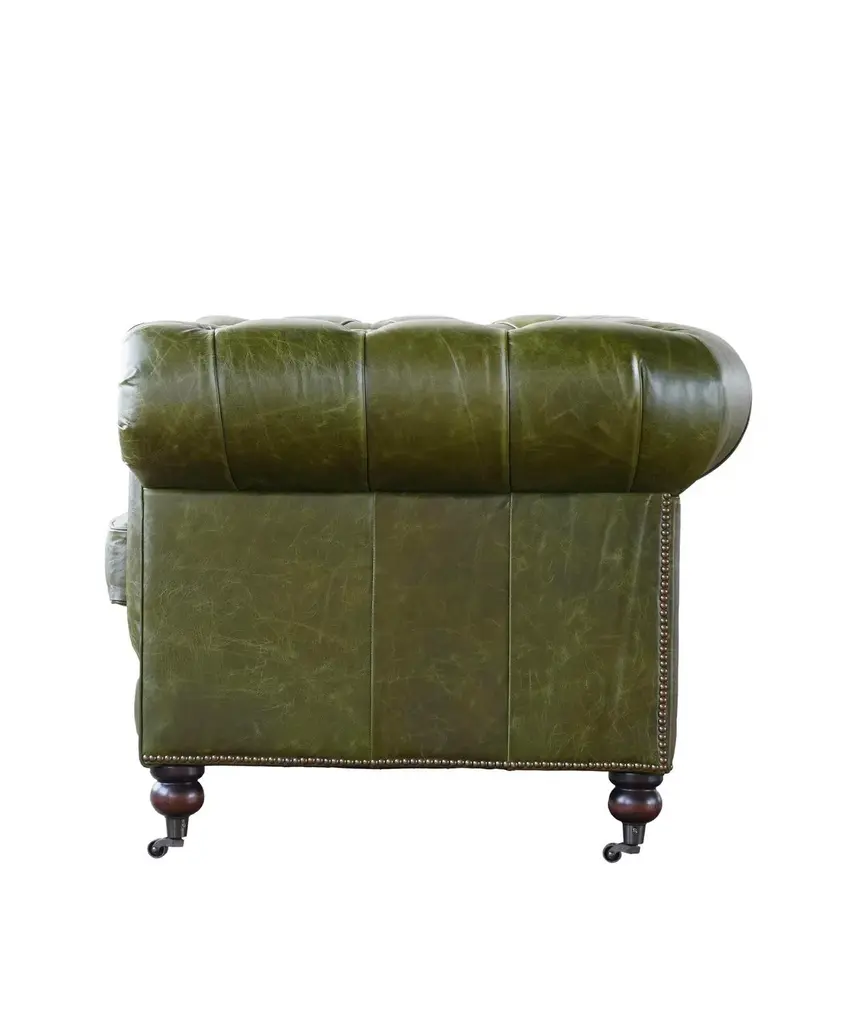 New item not vintage. The Churchill Seating Collection embodies two iconic British styles - the Chesterfield furniture design and the sporty Great Britain green of motorsport fame. Both styles are emblematic of sophistication and luxury. Each piece is crafted in the renowned Chesterfield style that includes durable Brazilian cow leather upholstery, plush with tufted buttons, high arms, and low seating. As opposed to a traditional dark brown, the Churchill Seating sports leather in a Great Britain Green hue. The frame and legs are shaped from rubberwood, a hardwood of medium but durable density. For ease of moving, each seat features lockable casters.