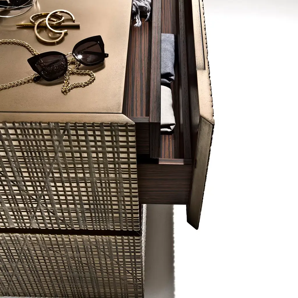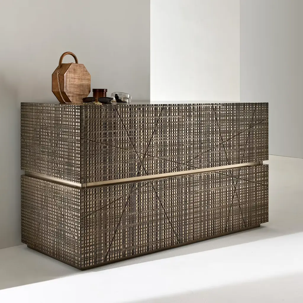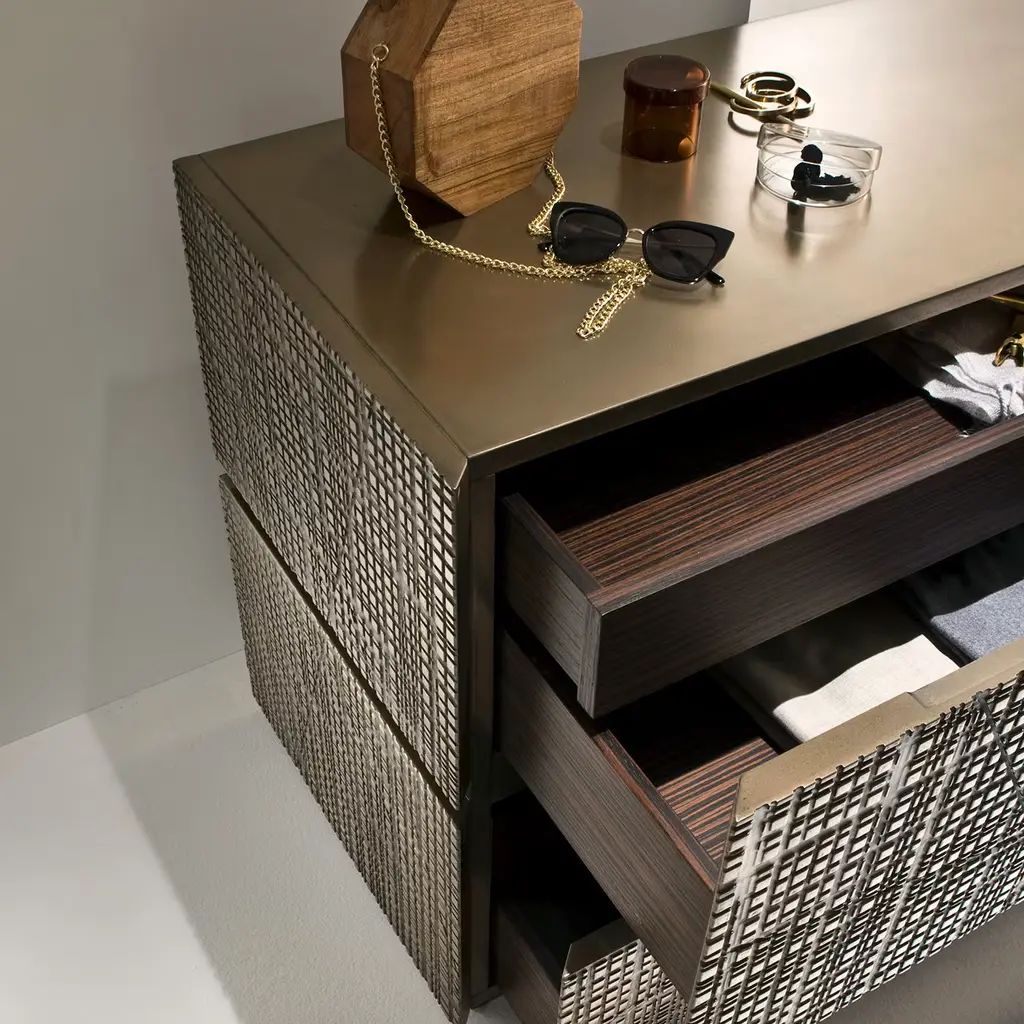 Part of the Maxima Collection, this stunning chest of drawers is a superb object of functional decor. The distinctive element of this piece is the carved front, featuring an abstract series of cuts with a Liquid Metal finish in light bronze. The metal structure features two external drawers and two internal ones. This unique piece is best combined with others from the same series and is also available in different measurements. Exuding sophistication and timeless elegance luxury, this piece is both suitable for bedroom or living rooms.