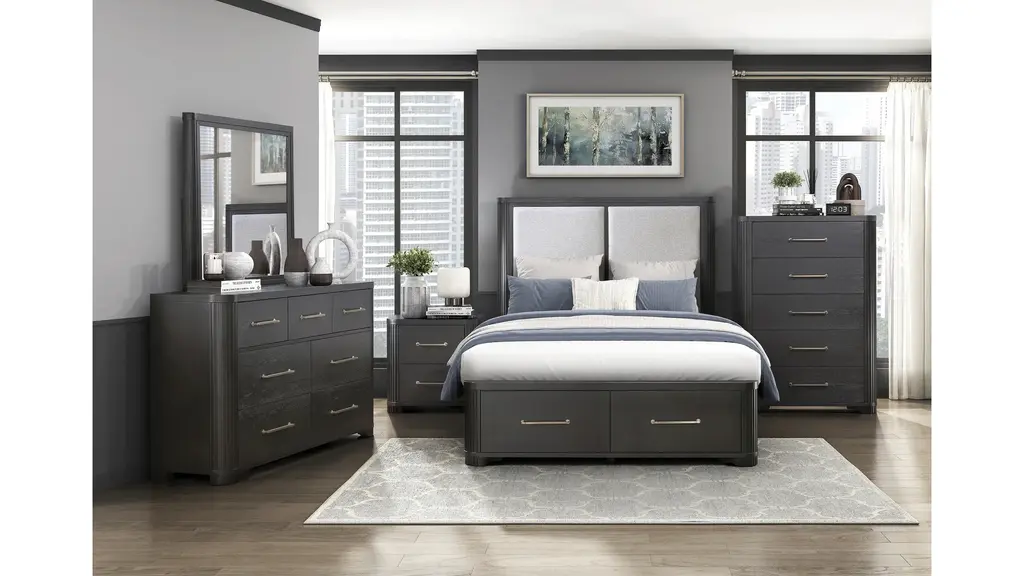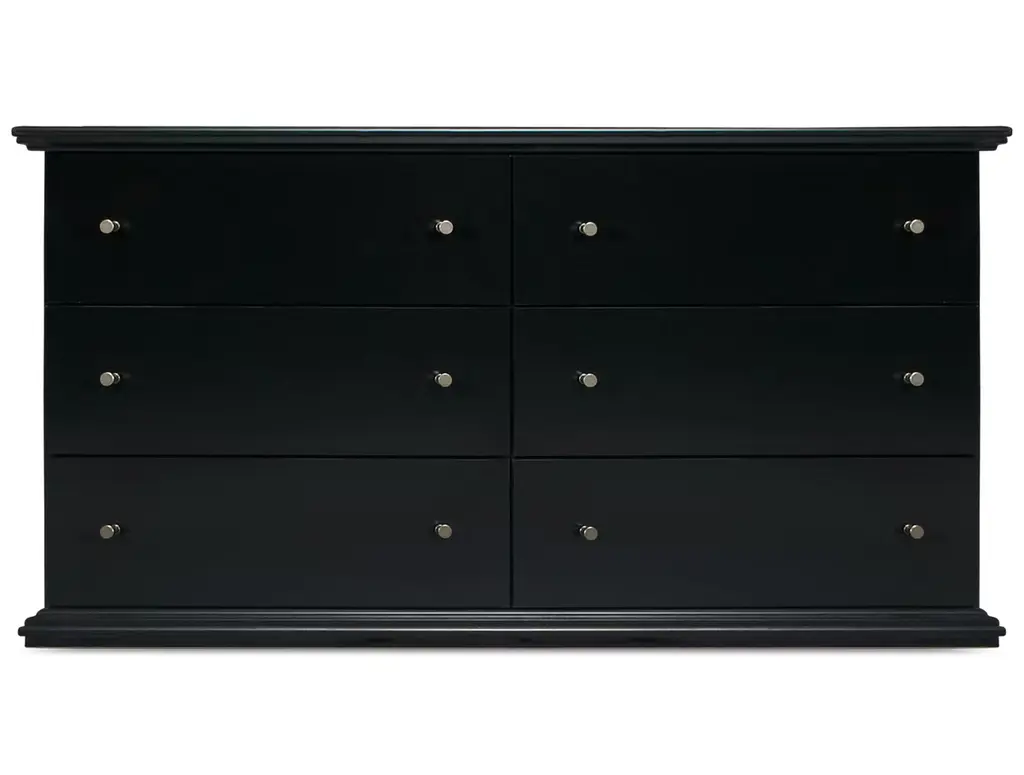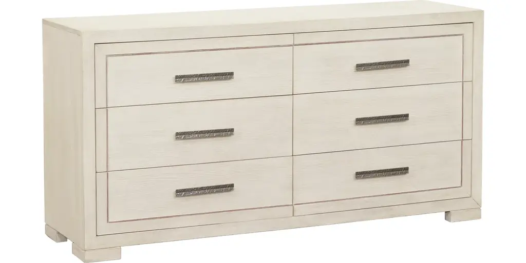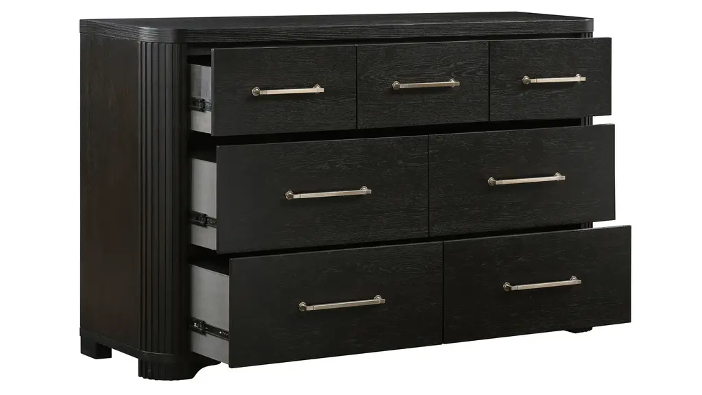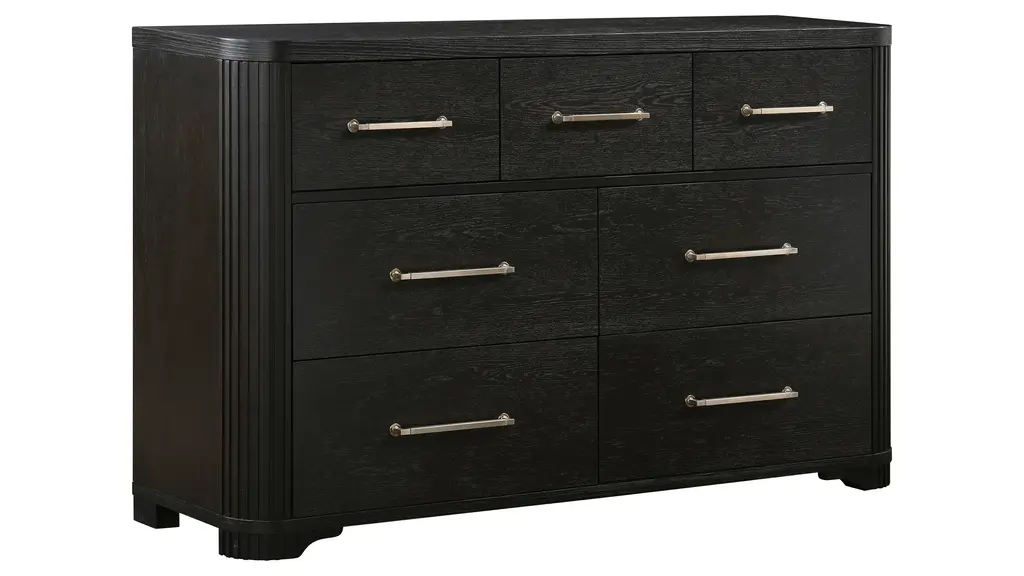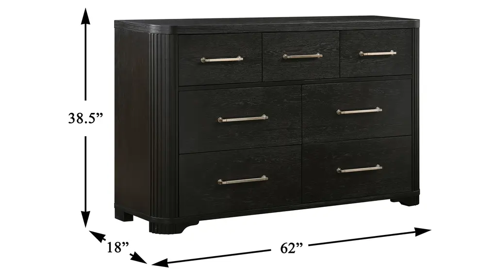 Elegant modern styling comprises the design of the Maypop Dresser while drawing subtle inspiration from the Art Deco movement. The oak veneer of the collection features a charcoal finish providing a rich hue to the distinct wood grain. Polished brass-tone bar pulls center each drawer of the dresser for complementing contrast.