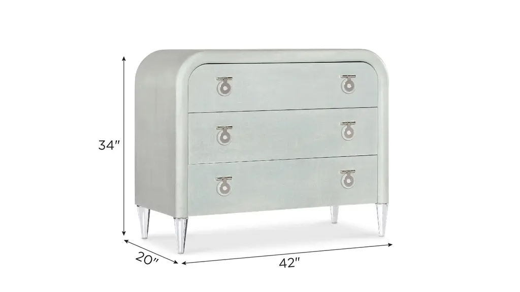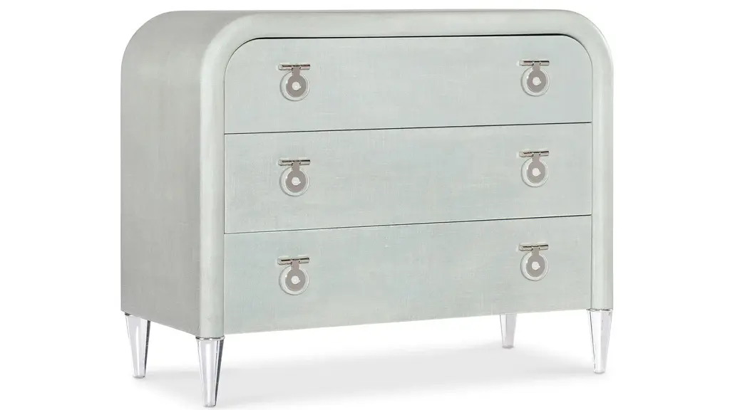 With an understated modern elegance, the Melange Julip Accent Chest is designed with a clean silhouette, clear acrylic legs and silver chrome-colored metal accents. With a light seafoam green-colored linen-wrapped exterior and drawer fronts and rounded corners, it has chrome-hued, jewelry-like metal drop pulls and three self-closing drawers.