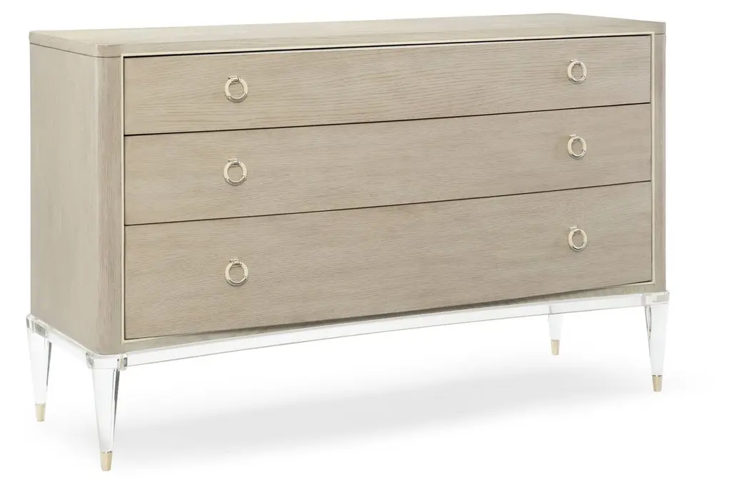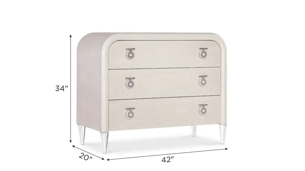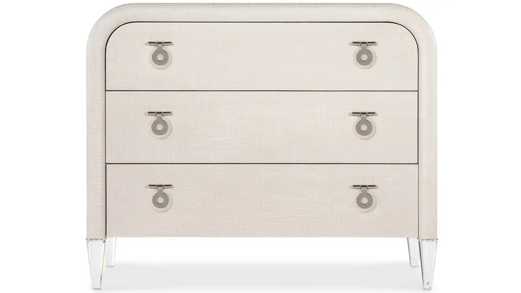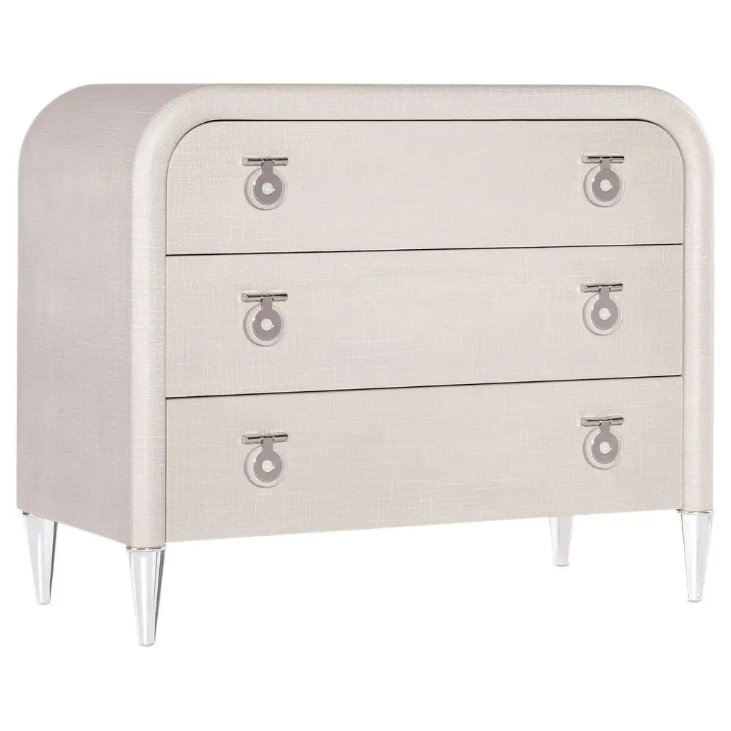 With an understated modern elegance, the M_lange Julip Accent Chest is designed with a clean silhouette, clear acrylic legs and silver chrome-colored metal accents. With a cream-colored linen-wrapped exterior and drawer fronts and rounded corners, it has chrome-hued, jewelry-like metal drop pulls and three self-closing drawers.
