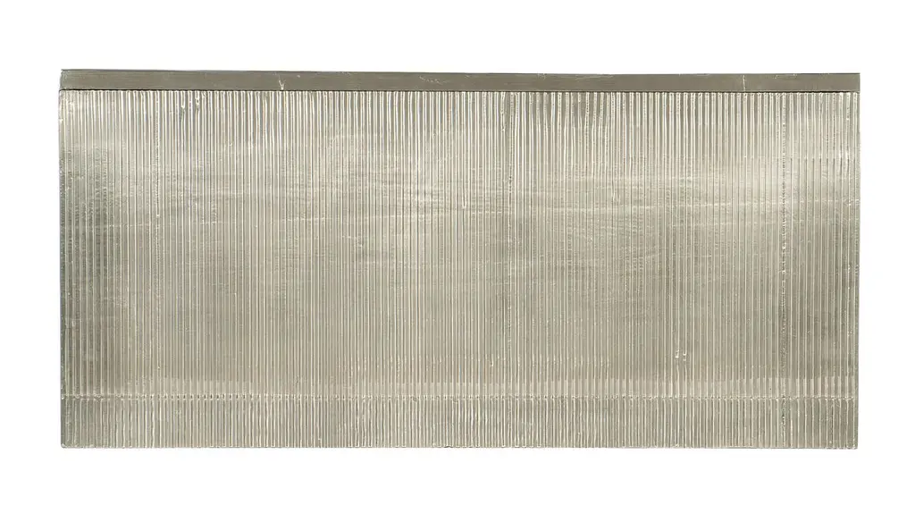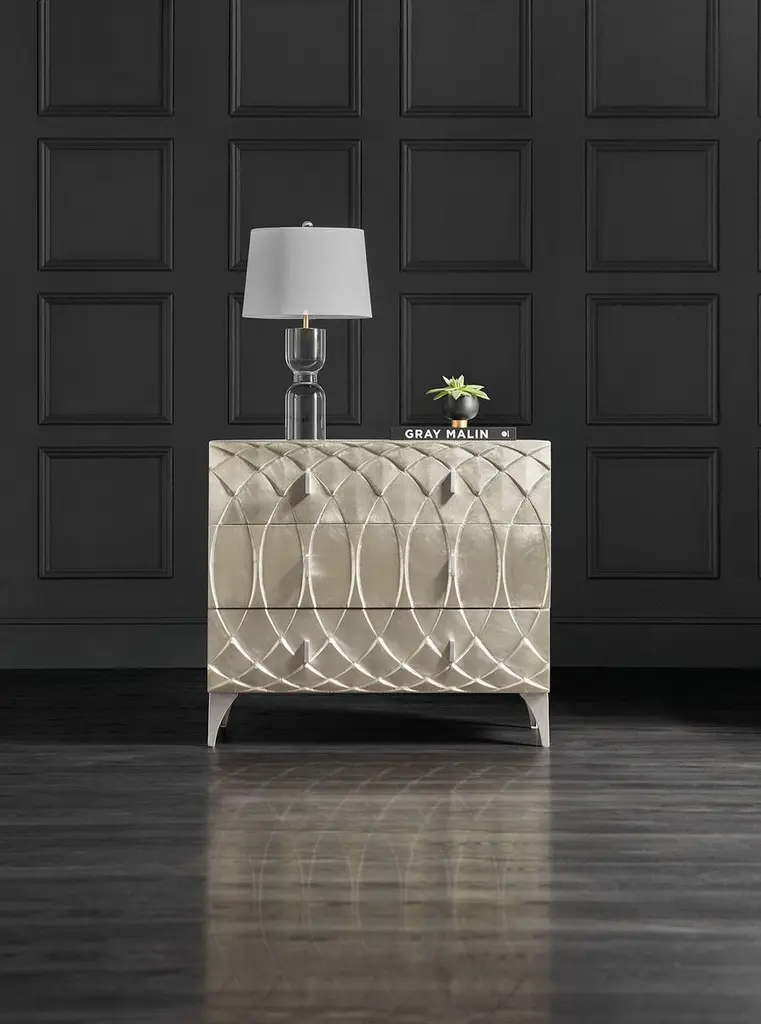 Serene symmetry offers tranquil style in a focal piece for any living space. Crafted with an interlocking ovals motif on the front, accented by small silver bar pulls and silver metal legs, the chest has three drawers with side-mounted metal drawer guides.