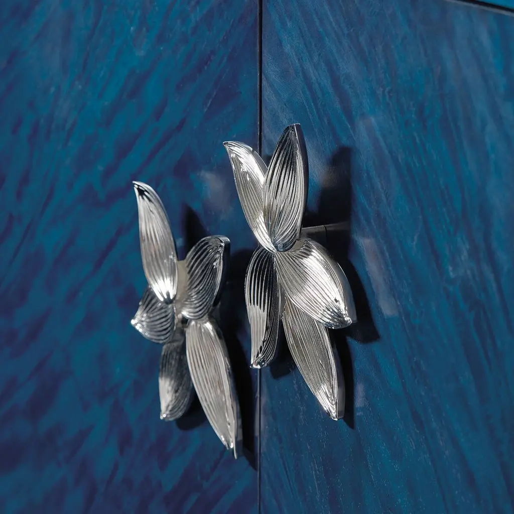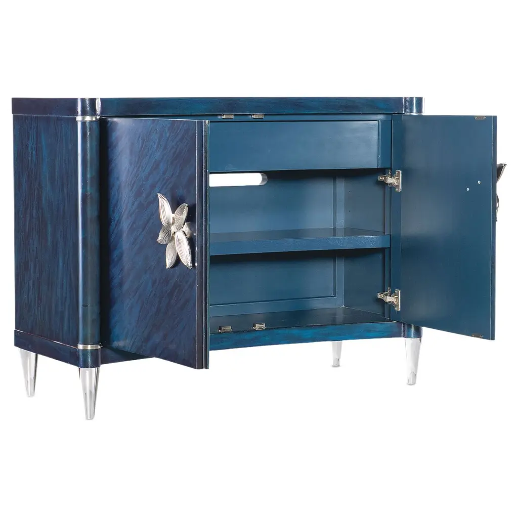 The glamour is in the details of the Mélange Sapphire Chest: the rich finish over figured Primavera Veneers, the broach-like dramatic silver floral hardware, silver metal accents, and acrylic legs. It all adds up to an uptown accent to create a burst of style for any space. The two doors have soft-close hinges and magnetic door catches with one adjustable shelf inside and one soft-closing drawer inside. The drawers have a painted interior.