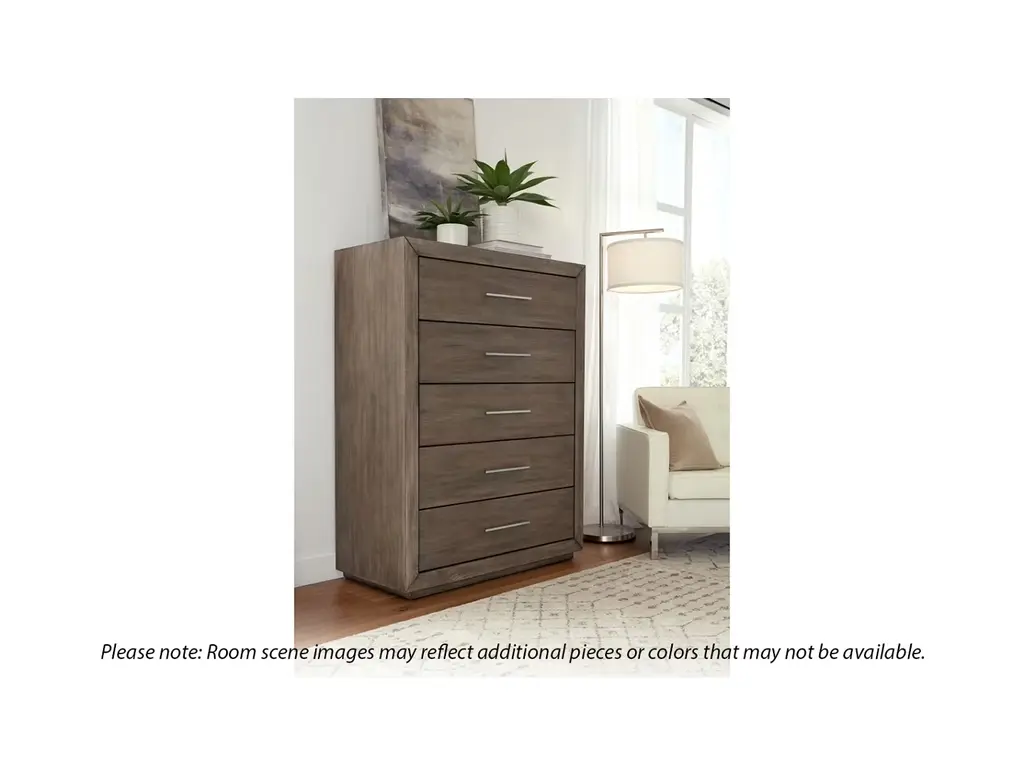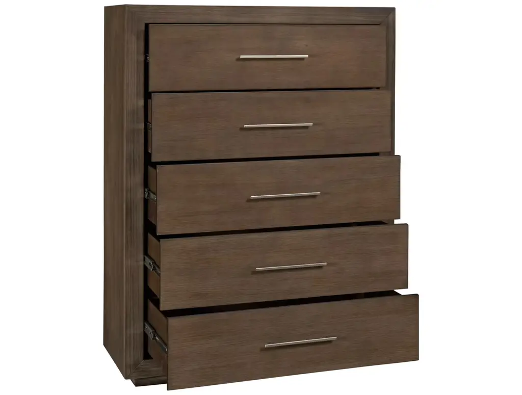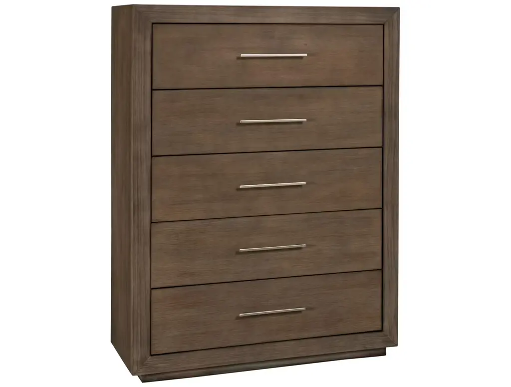 Add simply styled storage to your bedroom with the Modus Melbourne Chest. Its five spacious drawers allow you to conveniently store everything from clothes to accessories. This transitional-style dresser has polished nickel hardware that coordinates perfectly with the dark pine finish.