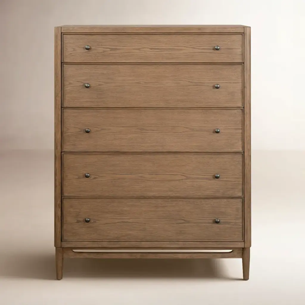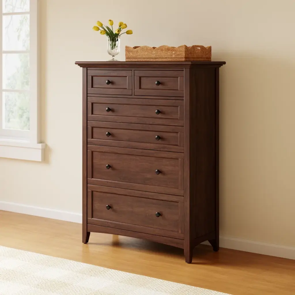 Short on closet space? This solid wood chest is here to help. It's crafted from solid mahogany wood in a natural brown finish that highlights the wood grain. Straightforward woodworking touches like recessed drawers and subtle crown molding make this 6-drawer chest just right for your rustic decor. Six dovetailed drawers slide smoothly on metal ball bearings to give you plenty of easy access to sweaters and slacks, while felt lining protects your delicates. Plus, this dresser arrives fully assembled with wall-anchoring safety hardware, ready to increase your bedroom storage.