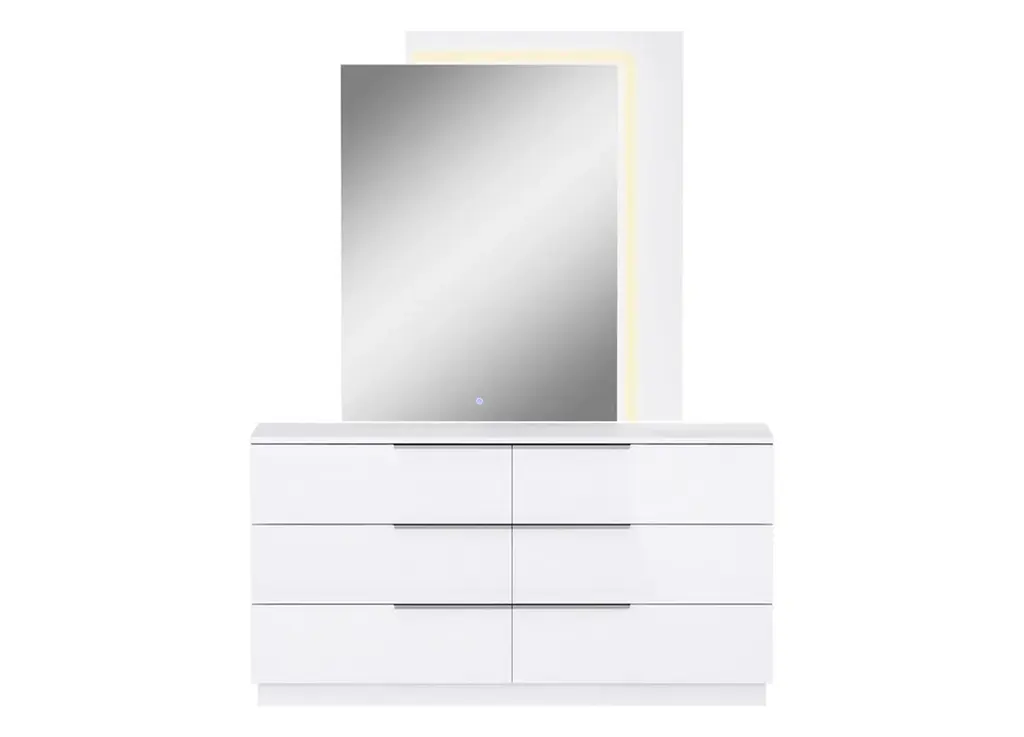 Beautifully marrying function with style, the Mera Chest will enhance your contemporary bedroom. Enjoy plenty of storage space with 5 deep drawers, each styled with innovative gray beveled mirrors on the front. White lacquer finish complements your modern dcor. This chest can stand alone, but will make an even bigger impact when displayed with other pieces from the Mera Collection.