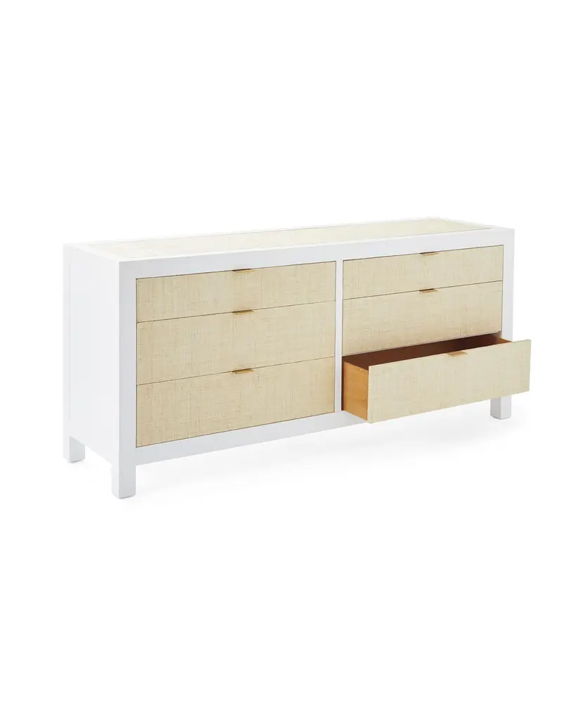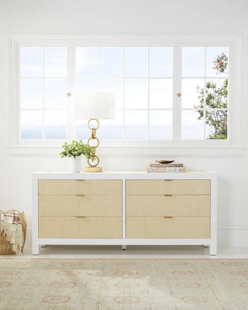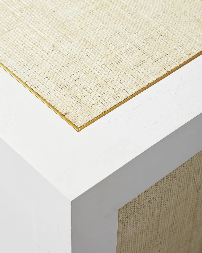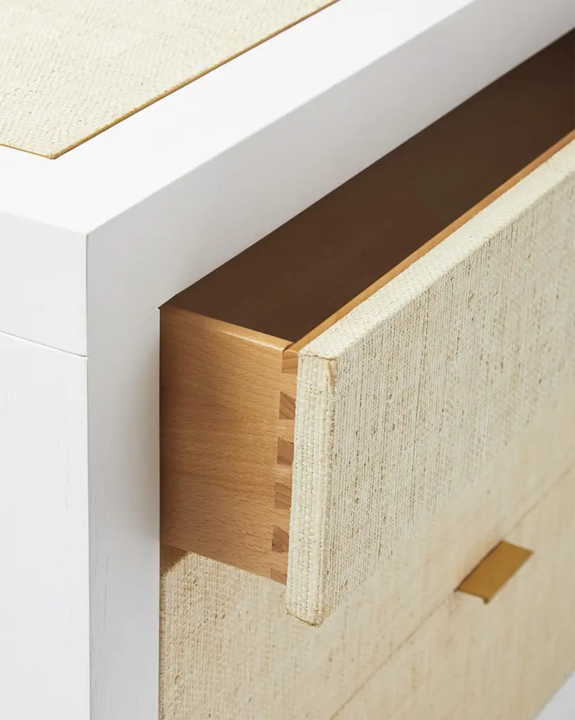 Calm sophistication. Lacquered raffia and an inlaid brass trim, all framed in white. Spacious drawers.