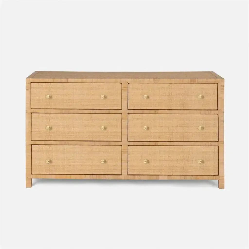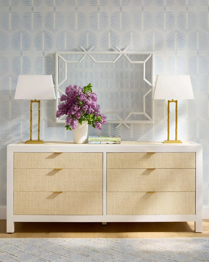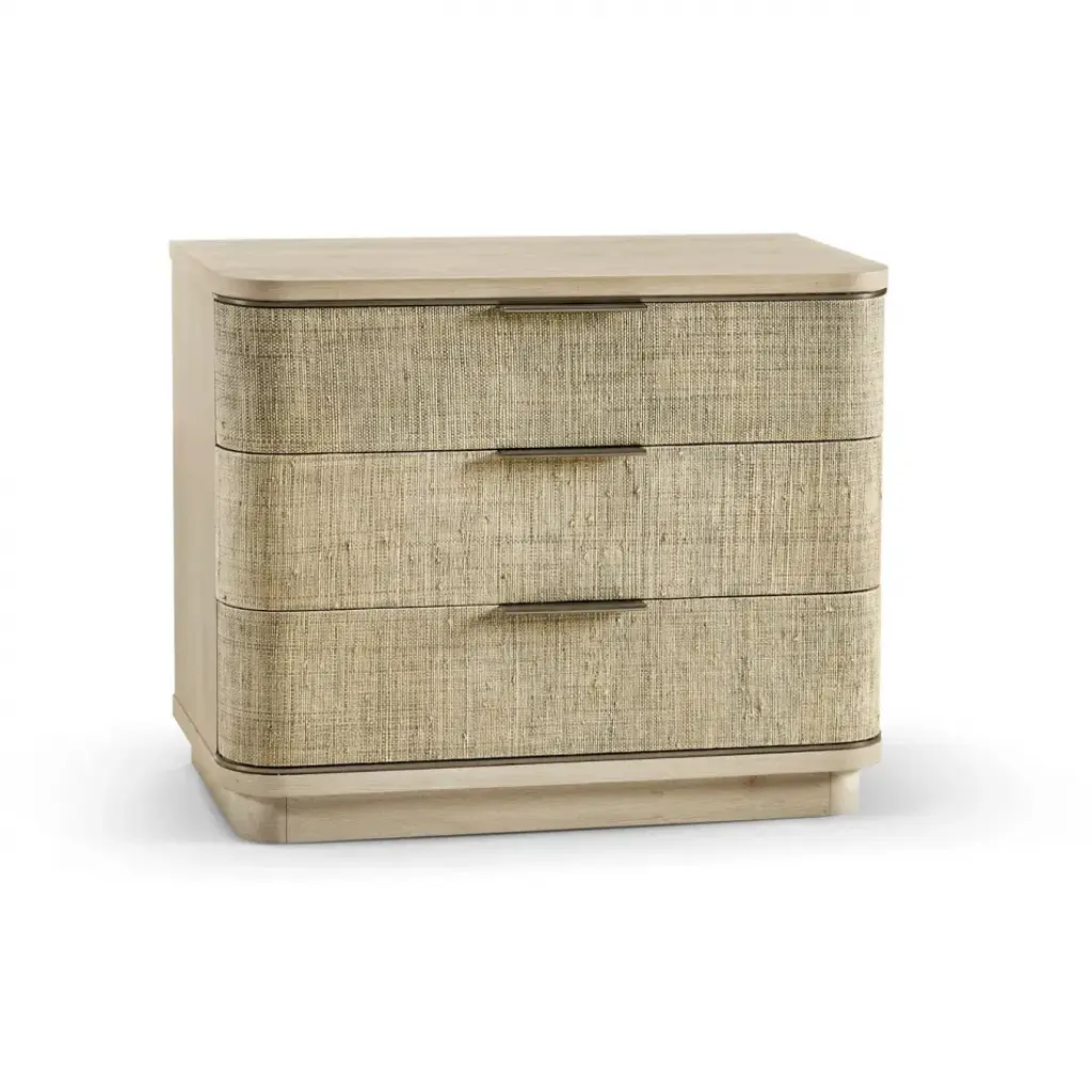 Calm sophistication. Lacquered raffia and an inlaid brass trim, all framed in white. Spacious drawers.