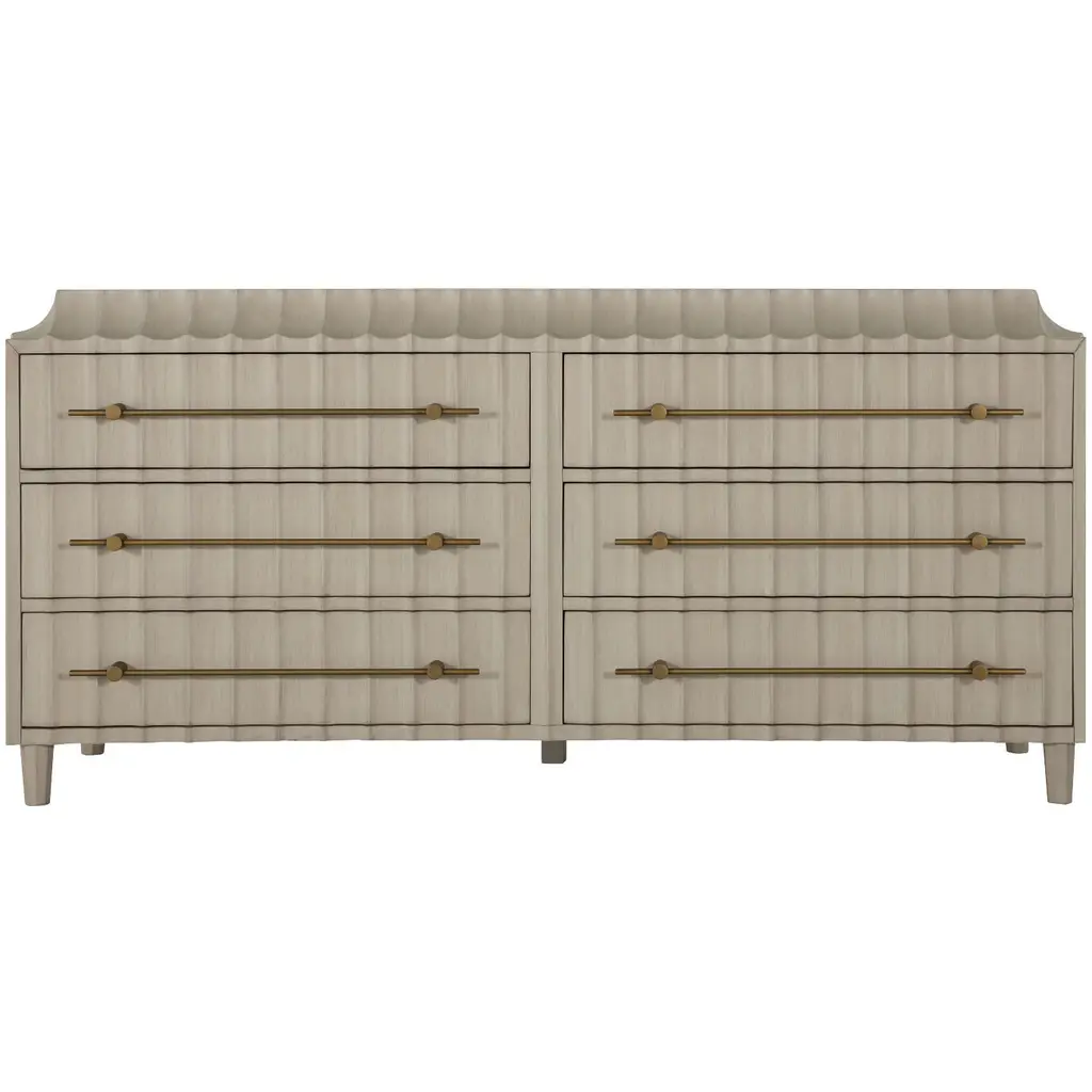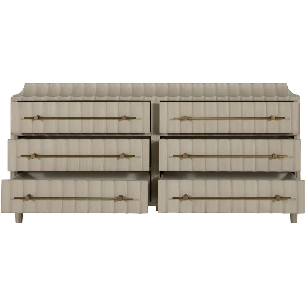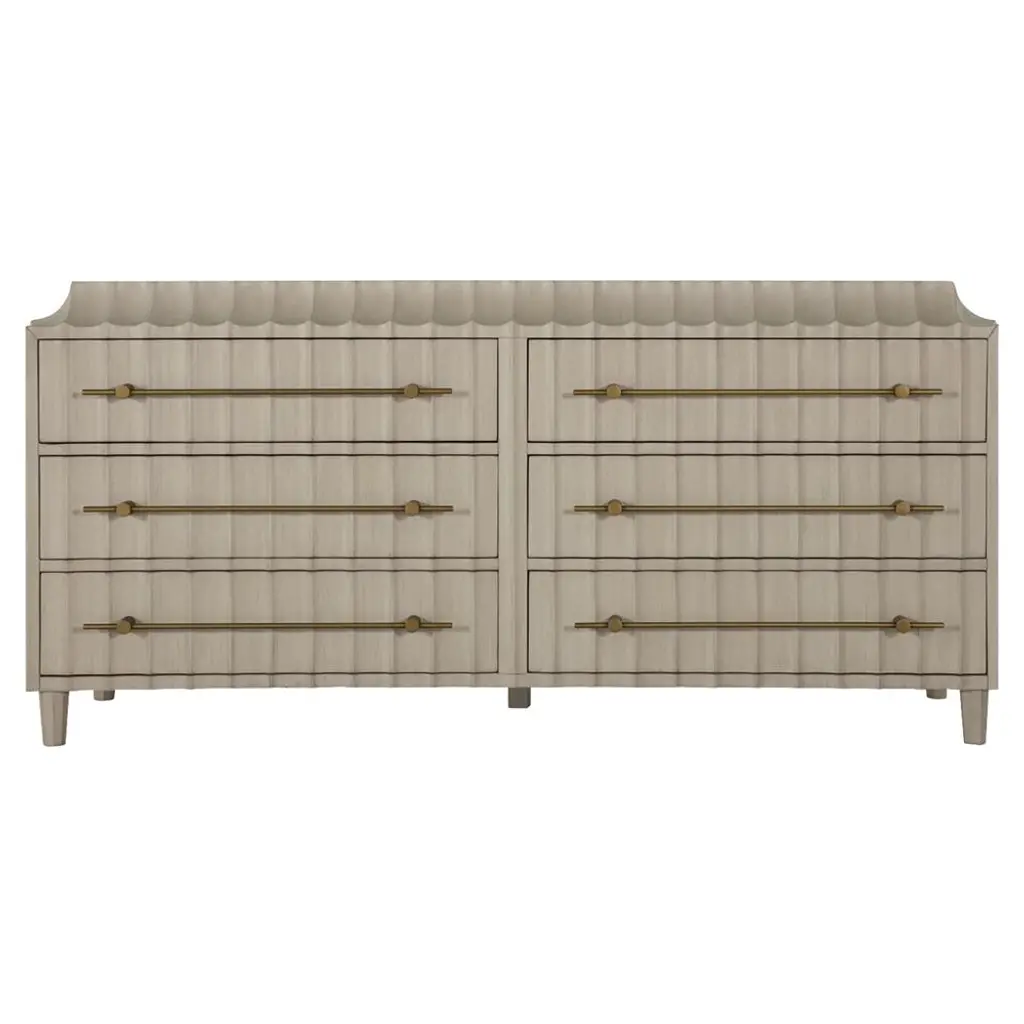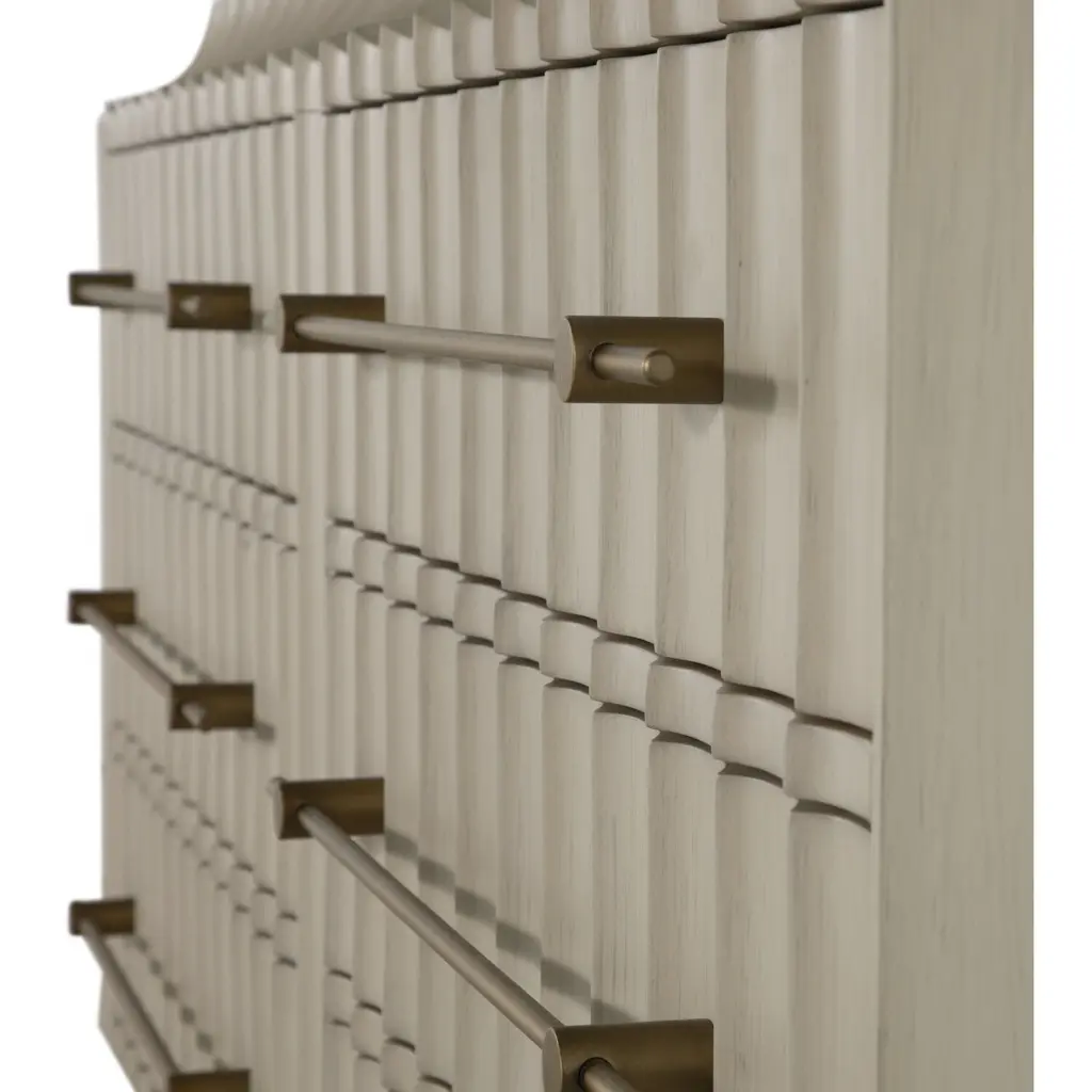 The Merigold Dresser, accompanying the Merigold Chest, is a bold statement piece that transforms a traditional dresser silhouette with its exaggerated modern sculpting in a textured white on the front and sides. Enhanced by brushed gold linear hardware that extends across the length of each drawer, it strikes a perfect balance between classic and contemporary. A subtle contoured arch around the top adds an elegant touch, while its width, double that of the chest, provides ample storage space. This dresser is designed for those seeking a striking, functional piece that commands attention in any room.