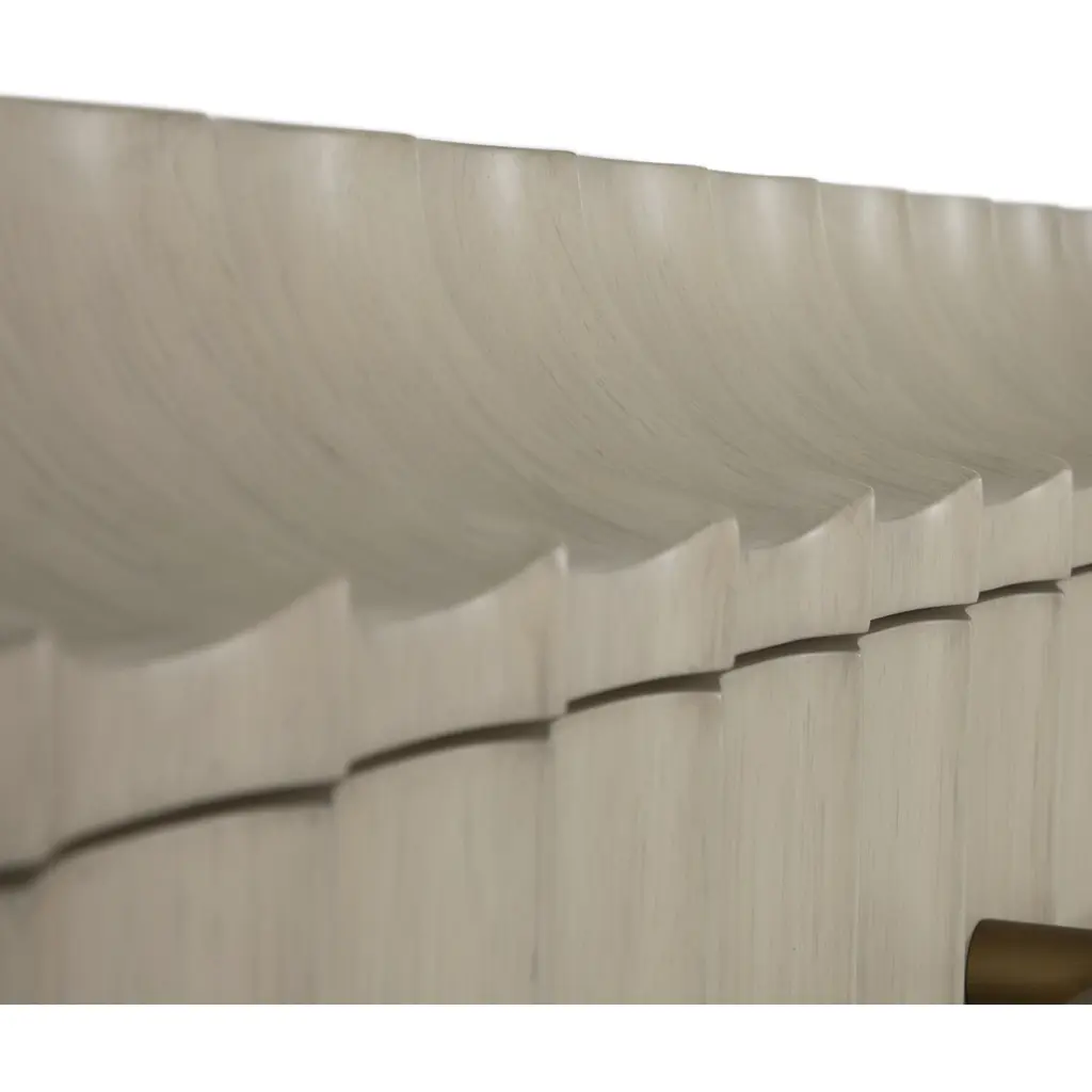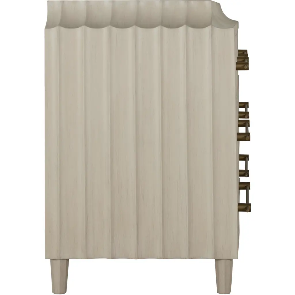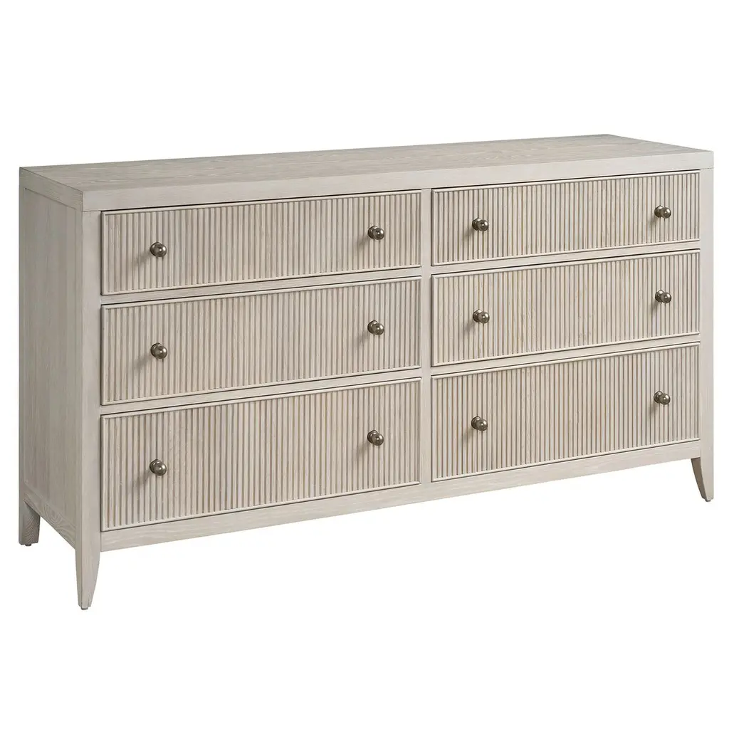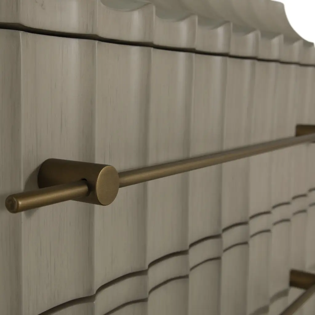 The Merigold Dresser, accompanying the Merigold Chest, is a bold statement piece that transforms a traditional dresser silhouette with its exaggerated modern sculpting in a textured white on the front and sides. Enhanced by brushed gold linear hardware that extends across the length of each drawer, it strikes a perfect balance between classic and contemporary. A subtle contoured arch around the top adds an elegant touch, while its width, double that of the chest, provides ample storage space. This dresser is designed for those seeking a striking, functional piece that commands attention in any room.