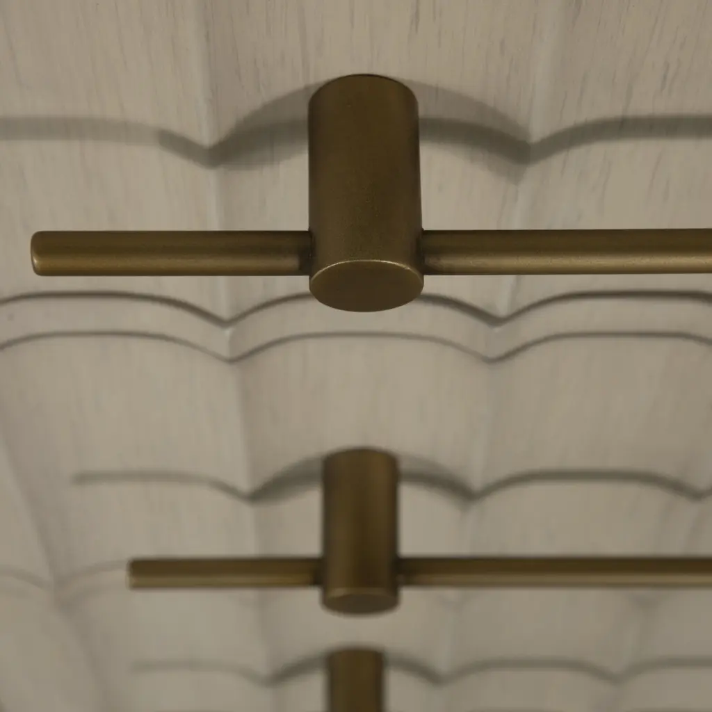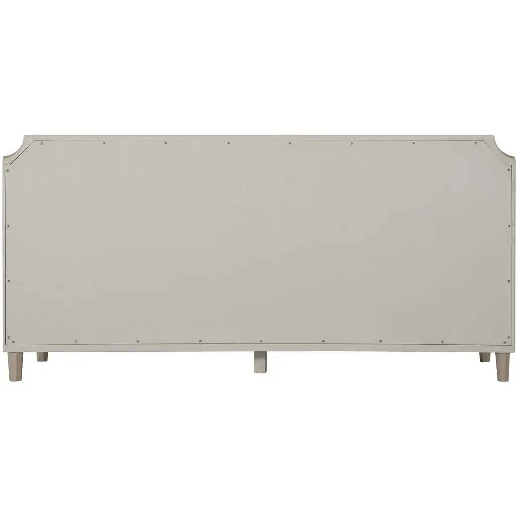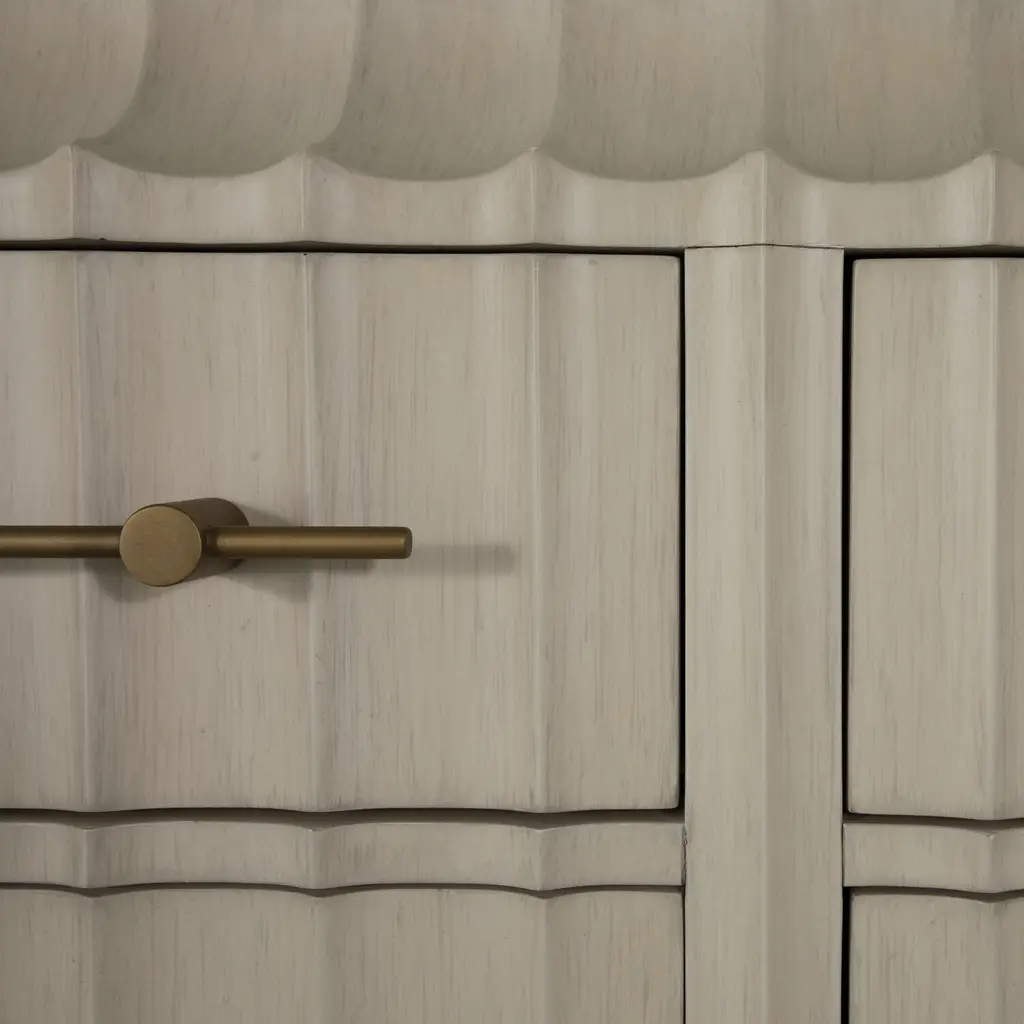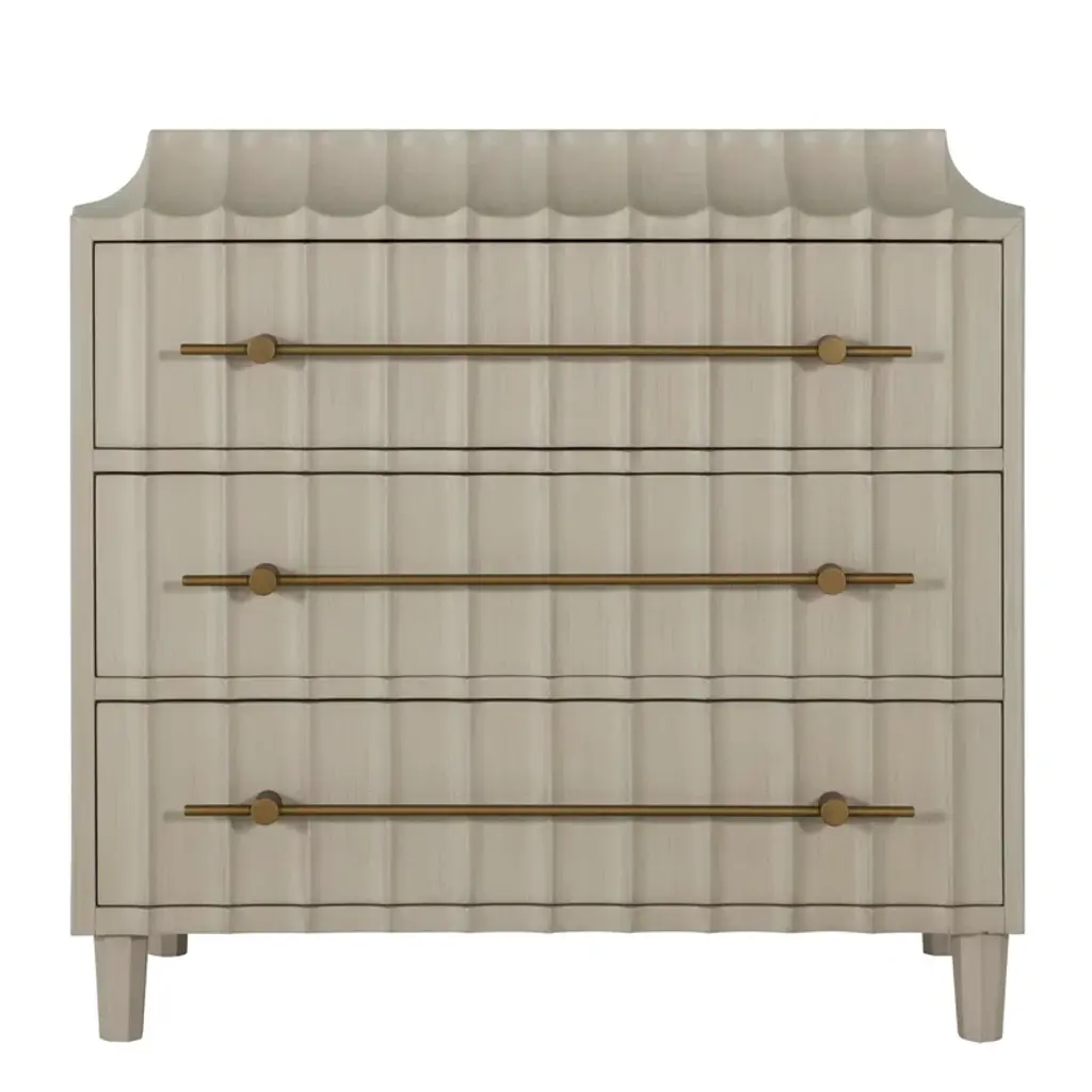 The Merigold Dresser, accompanying the Merigold Chest, is a bold statement piece that transforms a traditional dresser silhouette with its exaggerated modern sculpting in a textured white on the front and sides. Enhanced by brushed gold linear hardware that extends across the length of each drawer, it strikes a perfect balance between classic and contemporary. A subtle contoured arch around the top adds an elegant touch, while its width, double that of the chest, provides ample storage space. This dresser is designed for those seeking a striking, functional piece that commands attention in any room.