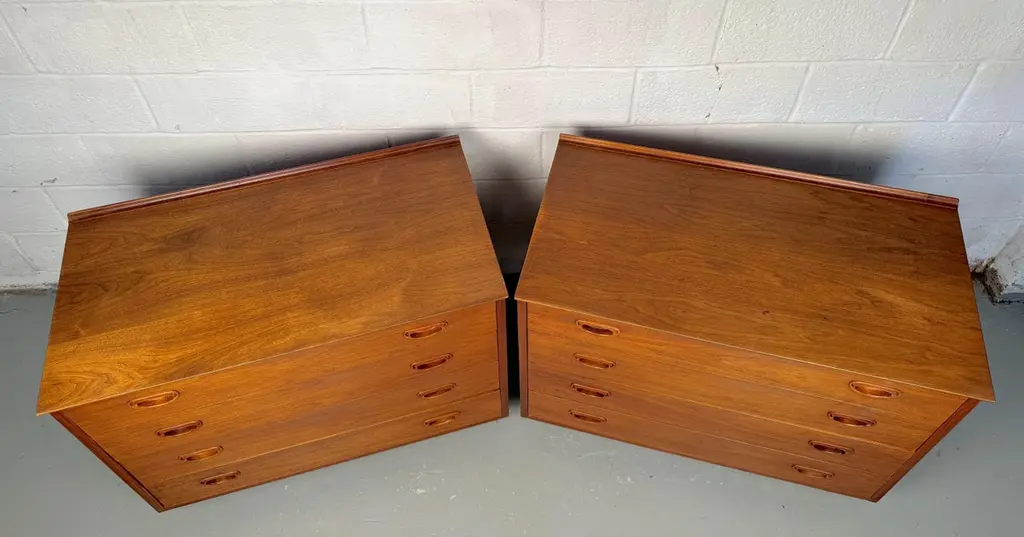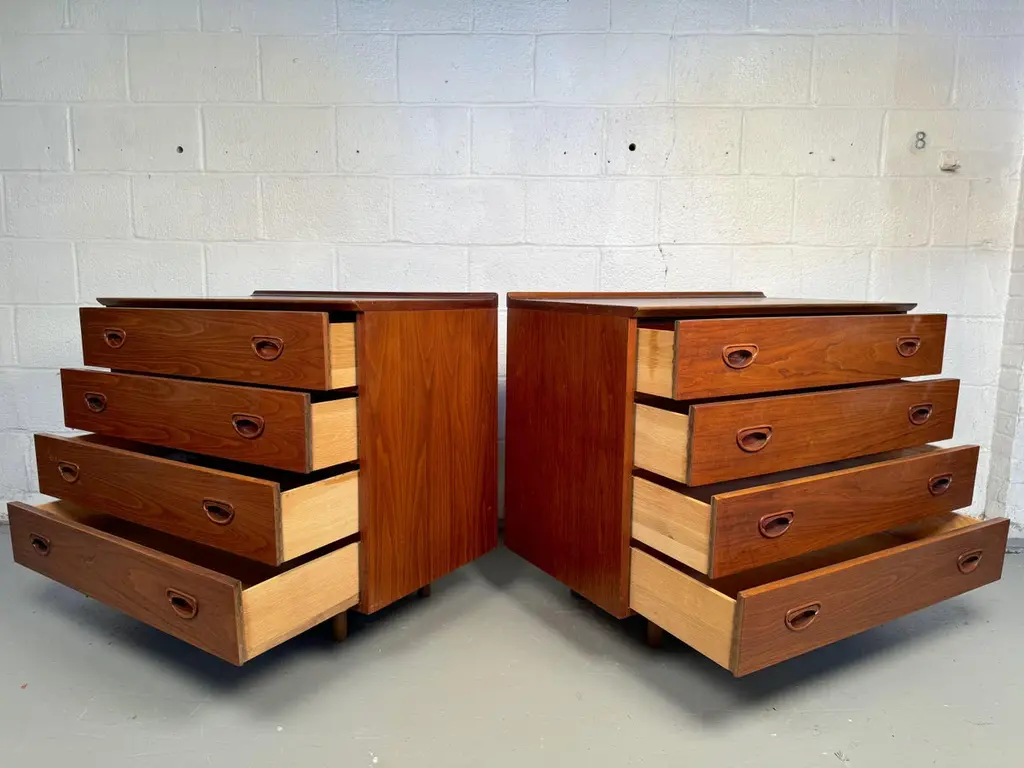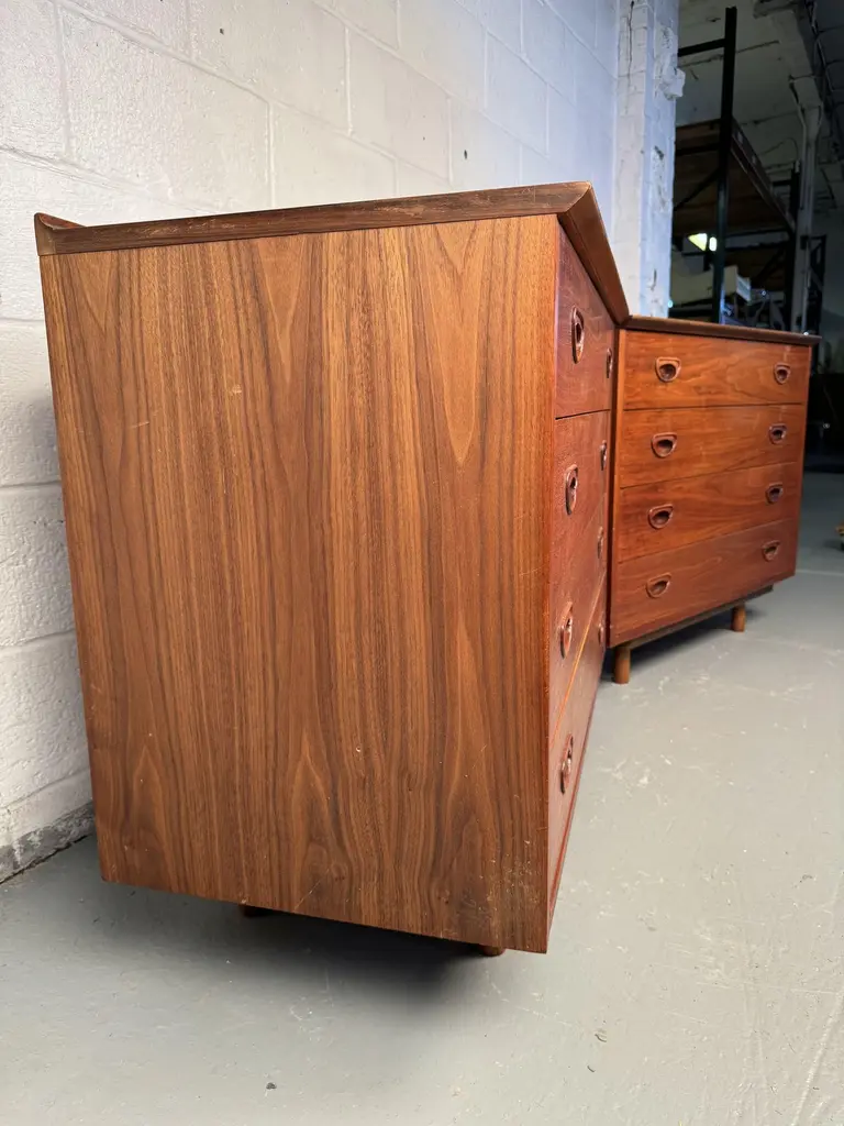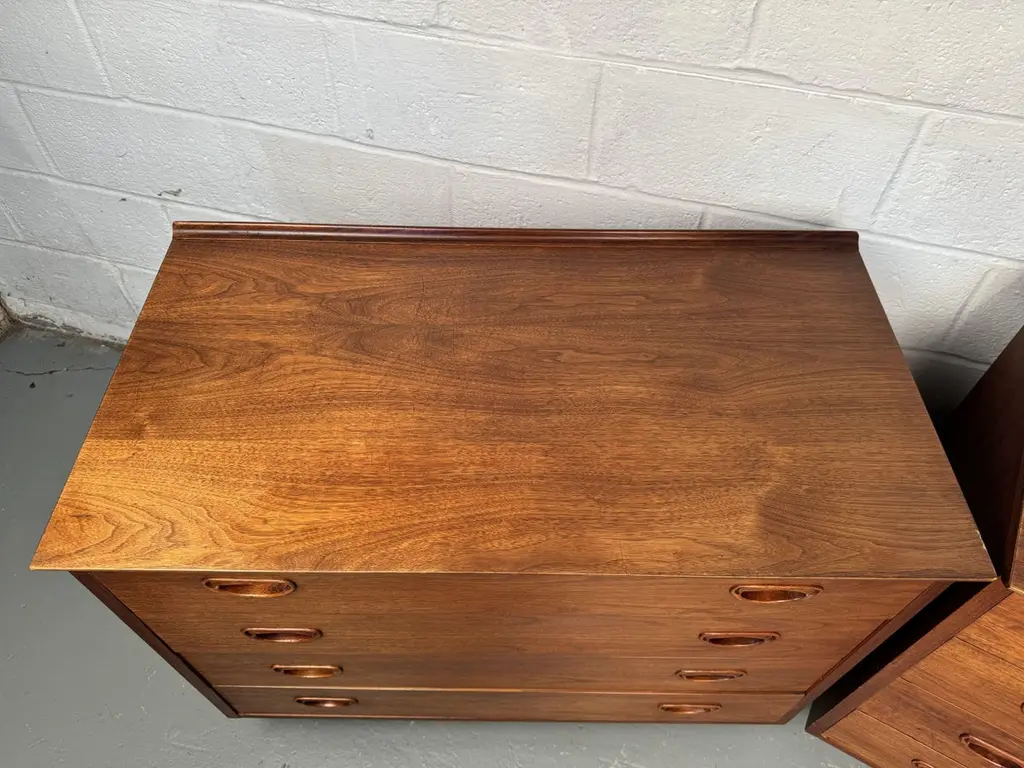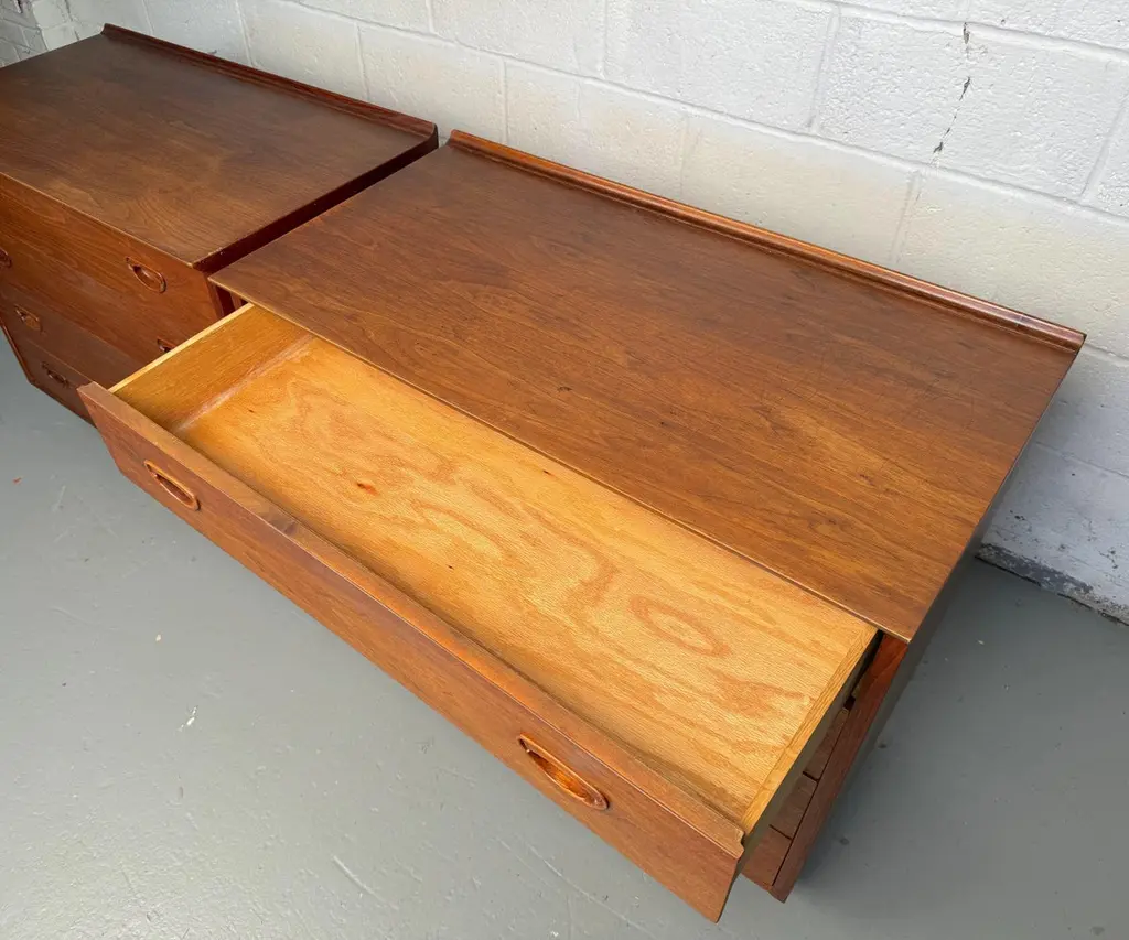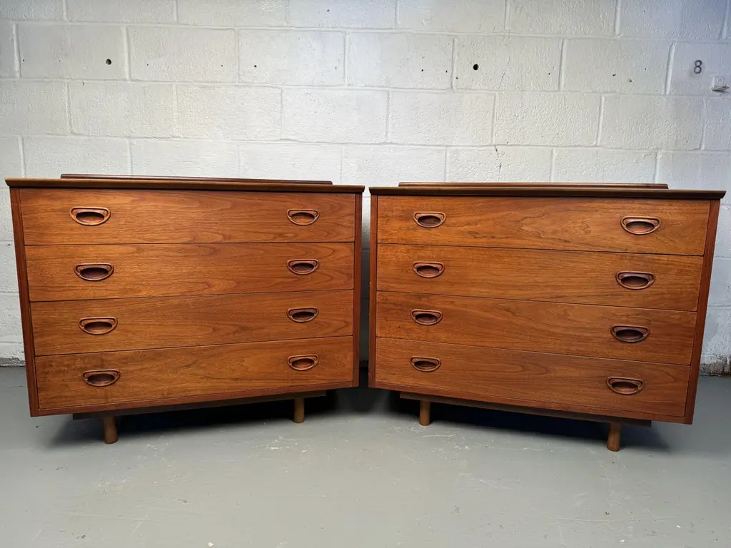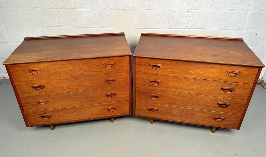 For your consideration, a stunning pair of mid-century Danish dressers, expertly crafted from rich walnut. Each dresser features a sleek, minimalist design that embodies the timeless elegance of Scandinavian furniture. The sculpted pulls add a unique touch, perfectly blending form and function. Ideal for bedrooms or living areas, these dressers offer ample storage while making a stylish statement. Their warm wood tones and clean lines will seamlessly integrate into any decor, making them a must-have for collectors and modern design enthusiasts alike. Don’t miss the chance to own a piece of mid-century history! Please confirm location with seller (NY/NJ)