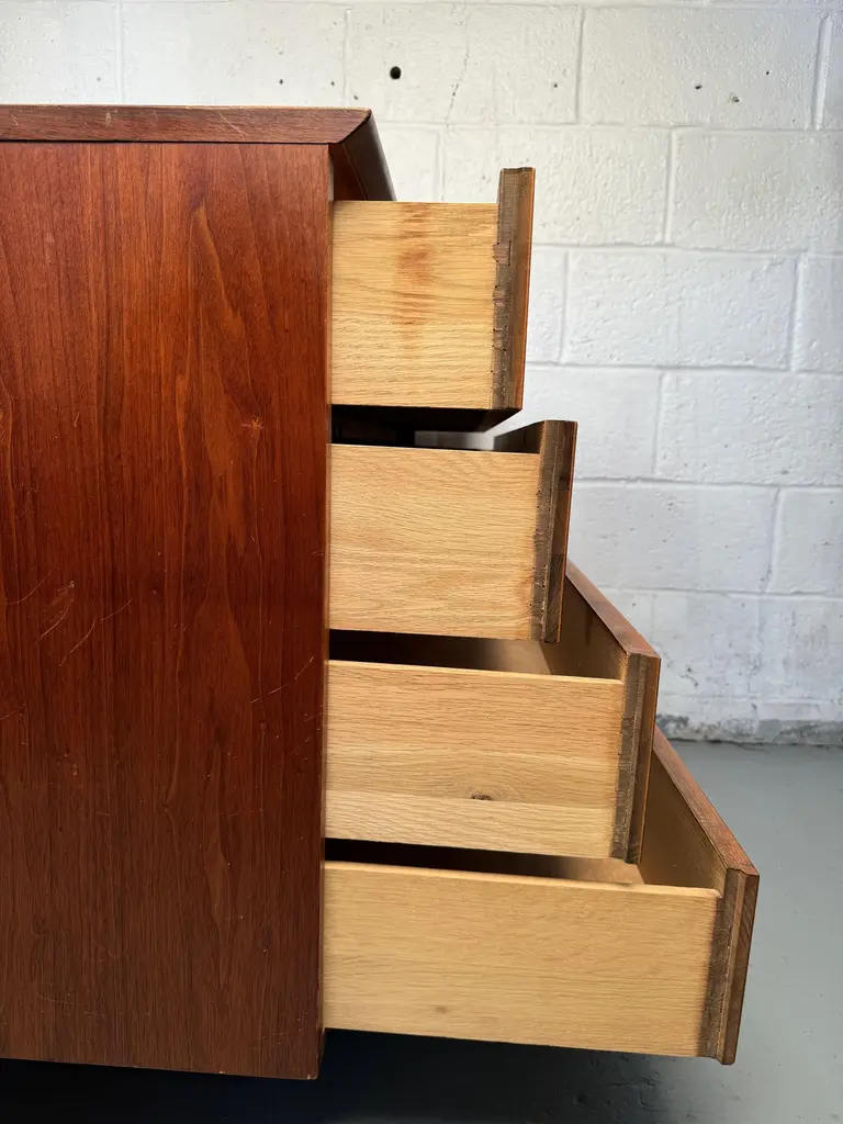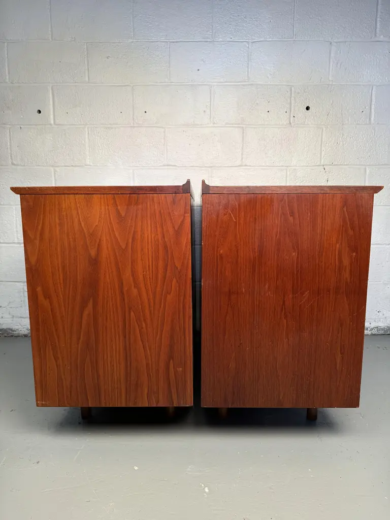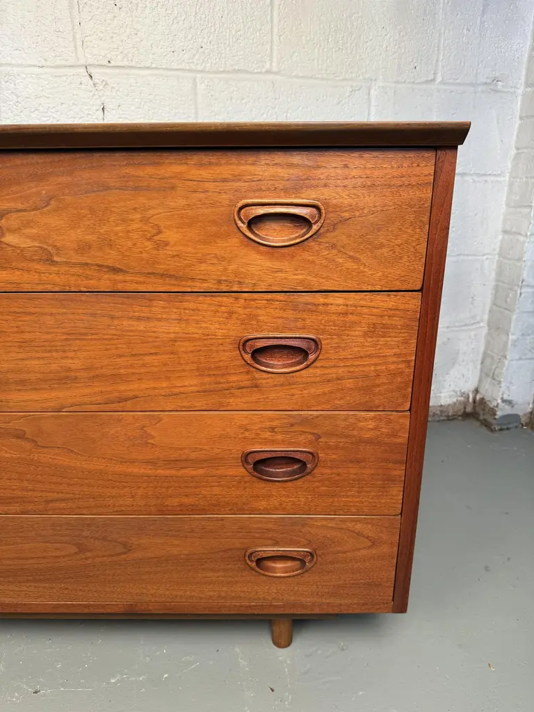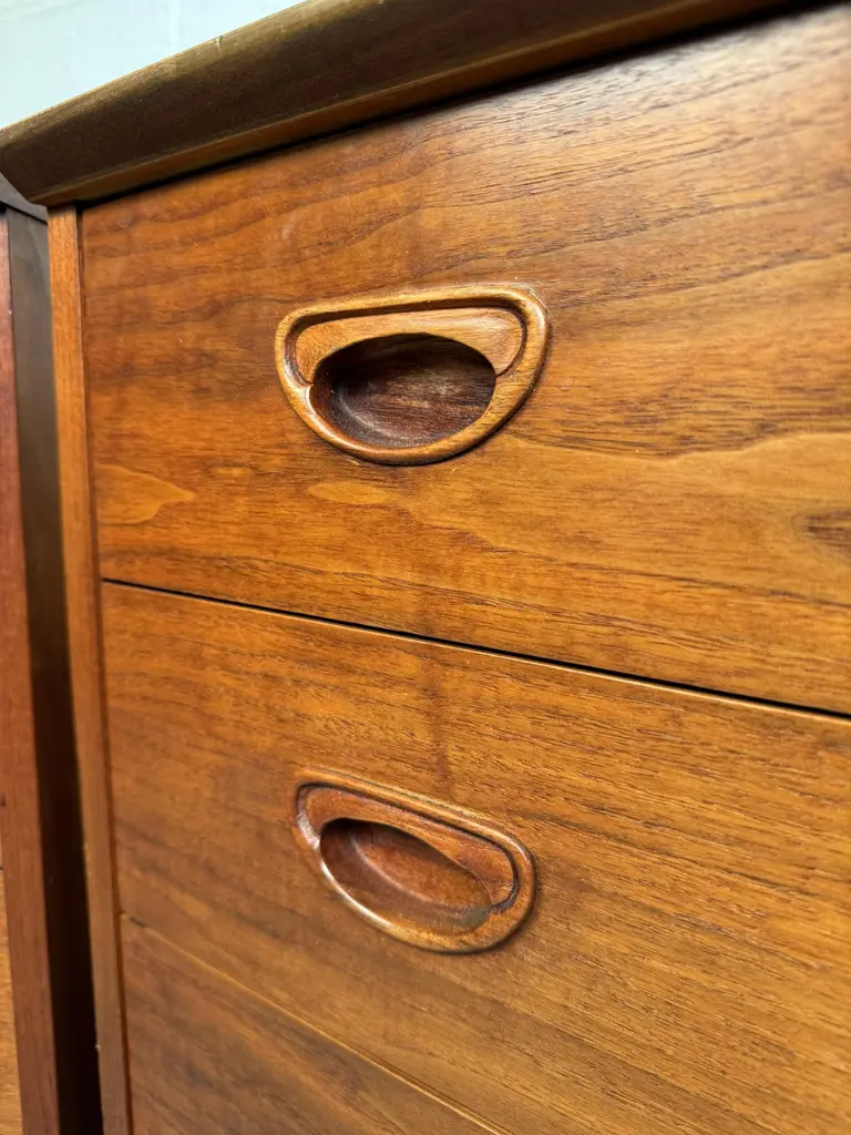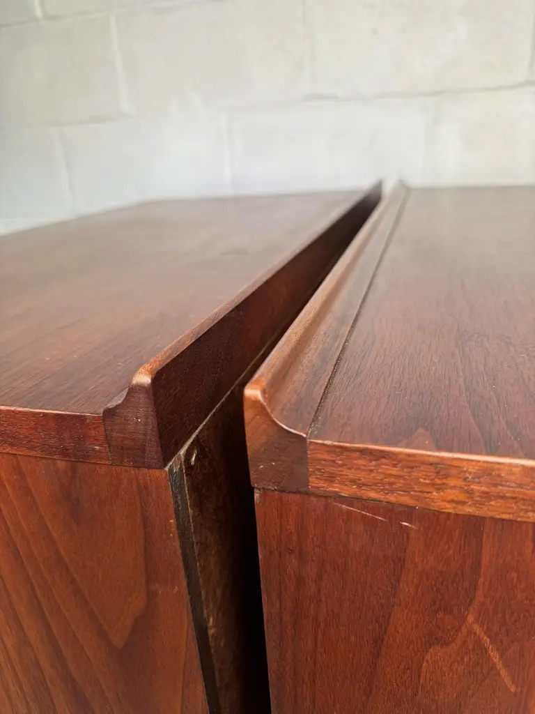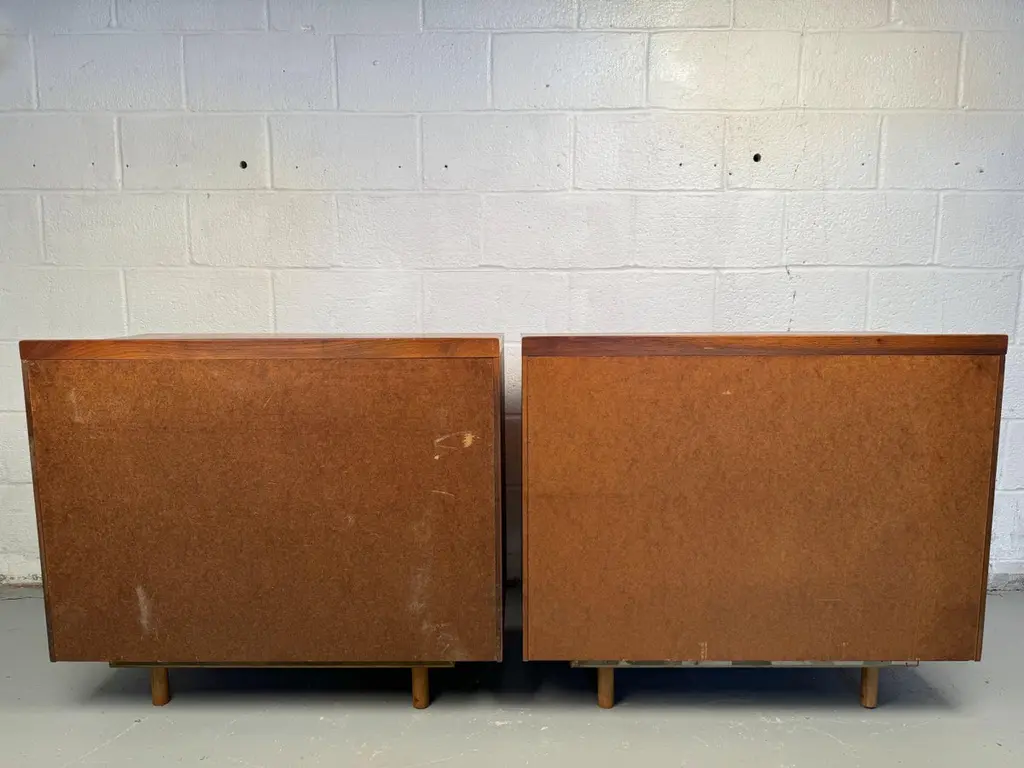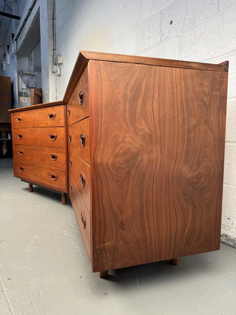 For your consideration, a stunning pair of mid-century Danish dressers, expertly crafted from rich walnut. Each dresser features a sleek, minimalist design that embodies the timeless elegance of Scandinavian furniture. The sculpted pulls add a unique touch, perfectly blending form and function. Ideal for bedrooms or living areas, these dressers offer ample storage while making a stylish statement. Their warm wood tones and clean lines will seamlessly integrate into any decor, making them a must-have for collectors and modern design enthusiasts alike. Don’t miss the chance to own a piece of mid-century history! Please confirm location with seller (NY/NJ)